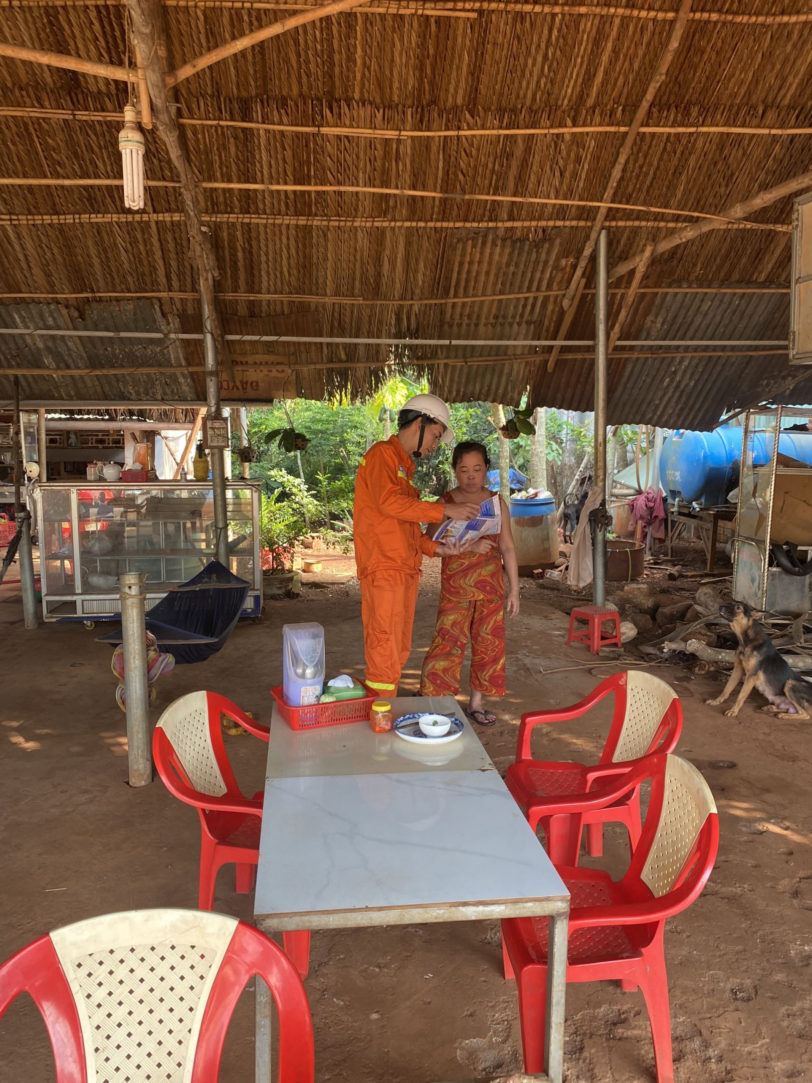 Anh Lê Đình Luân - CBKT Đội Truyền tải điện Bù Đăng phát tờ rơi tuyên truyền và giải thích cho người dân.