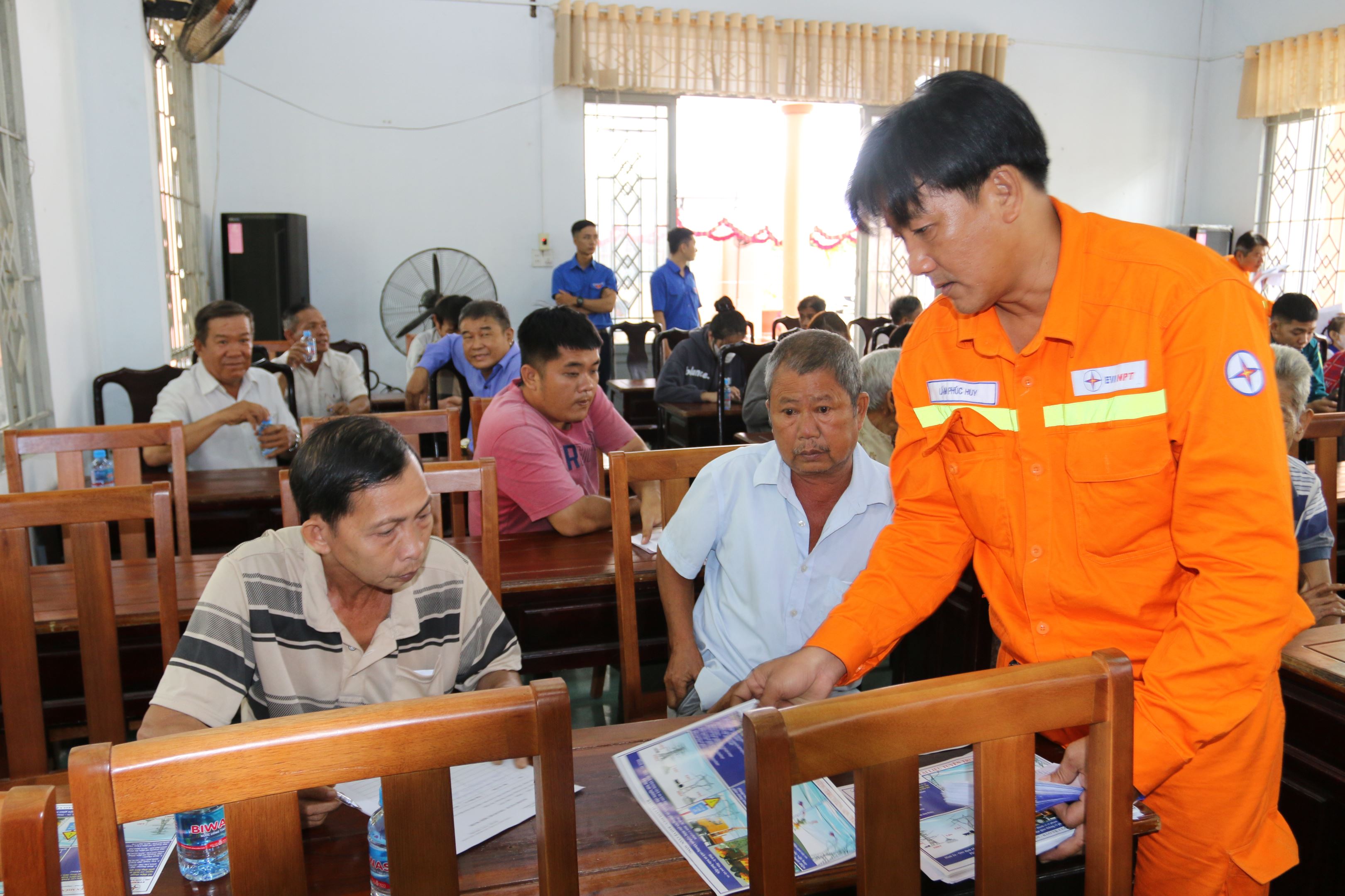 Anh Dương Đức Thành - Nhân viên vận hành đường dây Đội Truyền tải điện Đồng Xoài tuyên truyền kiến thức pháp luật cho người dân.