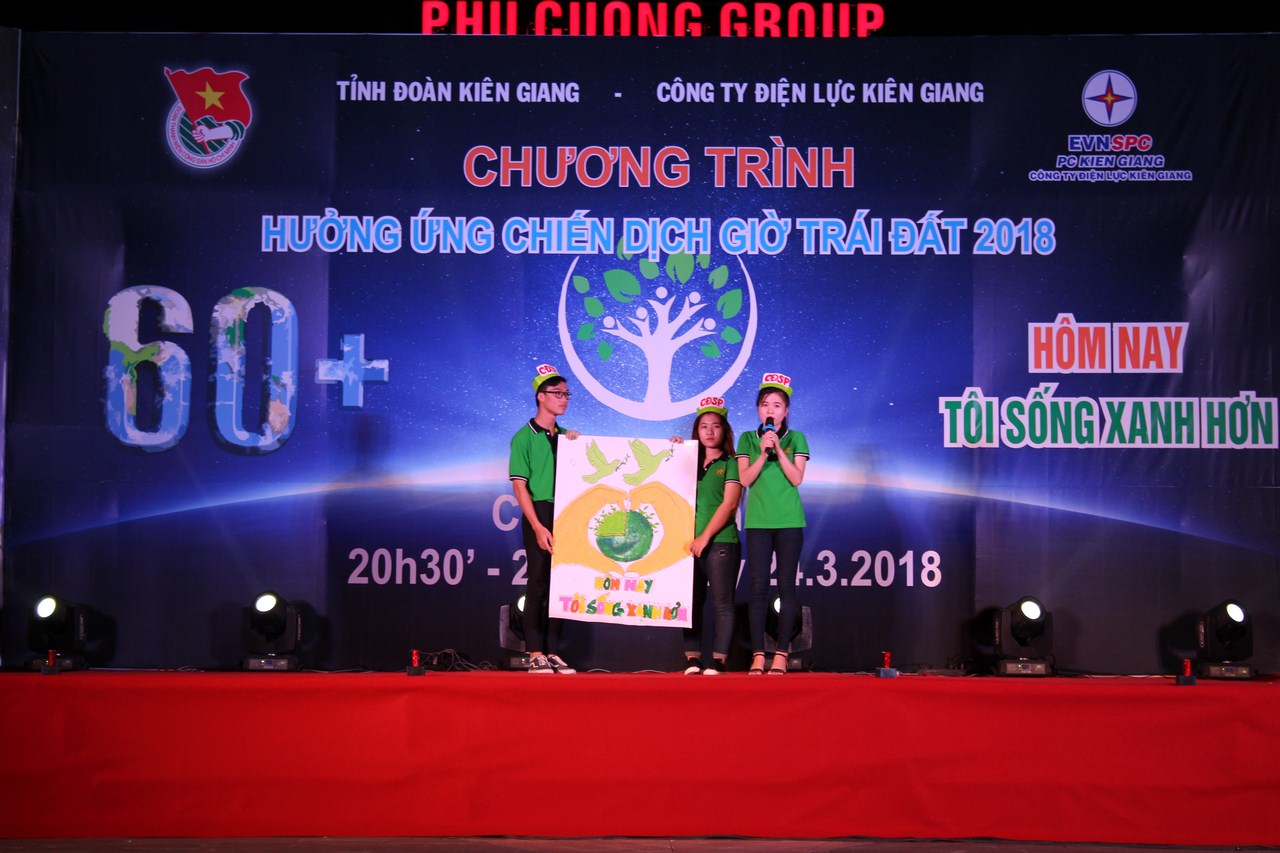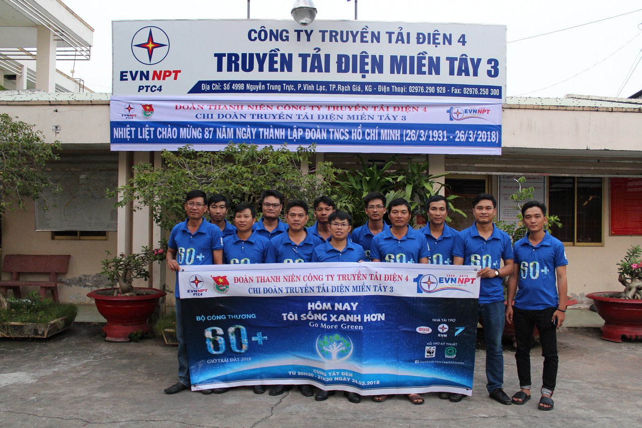 Tiếp nối chuỗi hoạt động, chi đoàn Truyền tải điện Miền Tây 3 đã tham gia hưởng ứng chương trình hưởng ứng chiến dịch Giờ Trái đất 2018 vào lúc 18h30’ ngày 24/3/2018, với chủ đề “Go more green - Hôm nay tôi sống xanh hơn” tại khu đa hợp Quảng trường Khu đô thị Phú Cường, TP Rạch Giá, Kiên Giang. Chương trình được thực hiện với quy mô lớn với gần 2000 cán bộ, công chức, viên chức, Lực lượng vũ trang, Đoàn viên, học sinh, sinh viên và người dân tham gia.