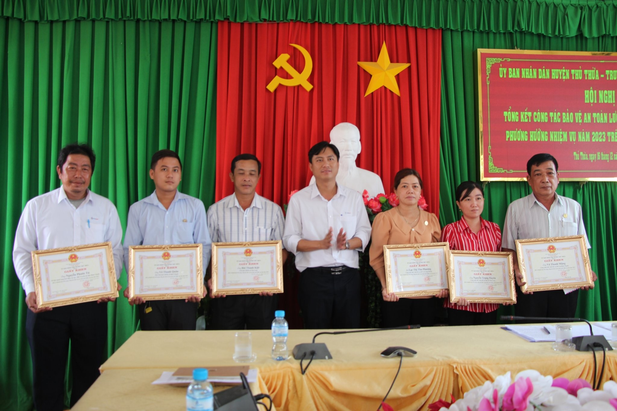 Anh Nguyễn Phước Tú (bìa trái) nhận giấy khen của UBND huyện Thủ Thừa trong hội nghị tổng kết bảo vệ an toàn hành lang lưới điện cao áp năm 2022.