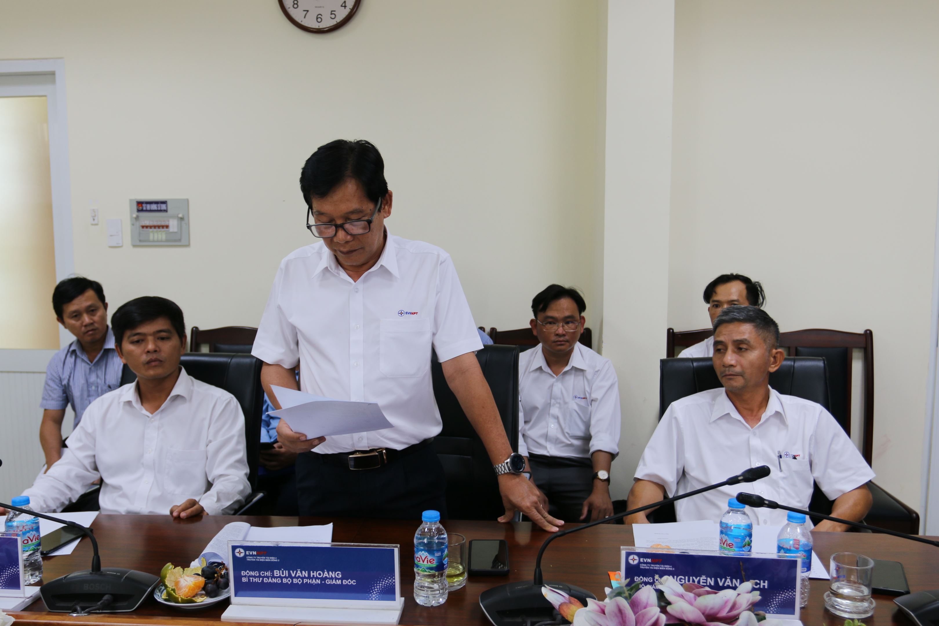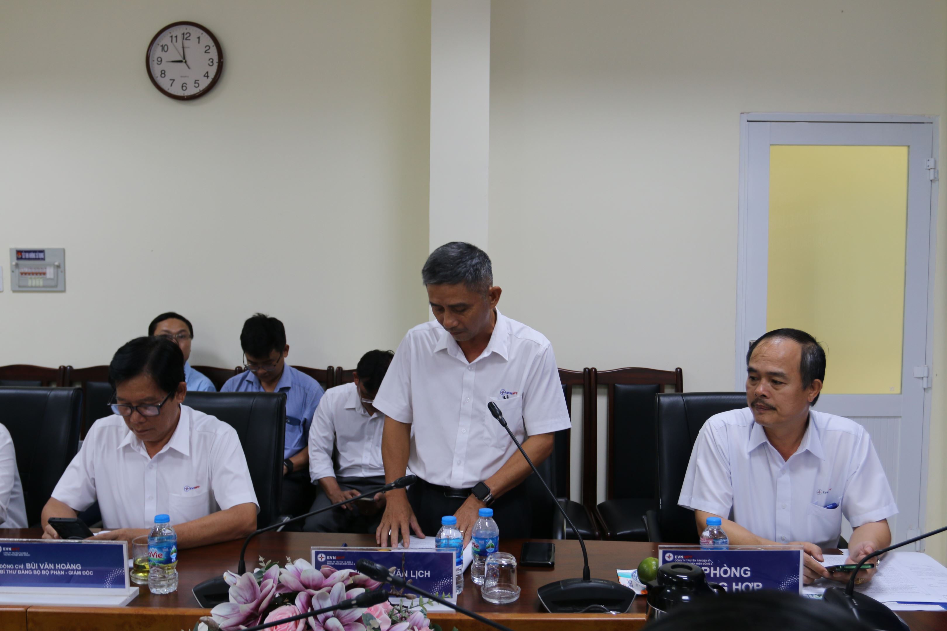 Làm việc với đoàn về phía Truyền tải điện miền Đông 2 - Công ty Truyền tải điện 4 có phòng Kiểm tra thanh tra và pháp chế Công ty; Đồng chí Bùi Văn Hoàng – Bi thư Đảng bộ bộ phận, Giám đốc Truyền tải điện miền Đông 2; các đồng chí là Phó Giám đốc, Trưởng phó các phòng, trạm và đội Truyền tải điện nằm trên địa bàn tỉnh Bình Dương.
