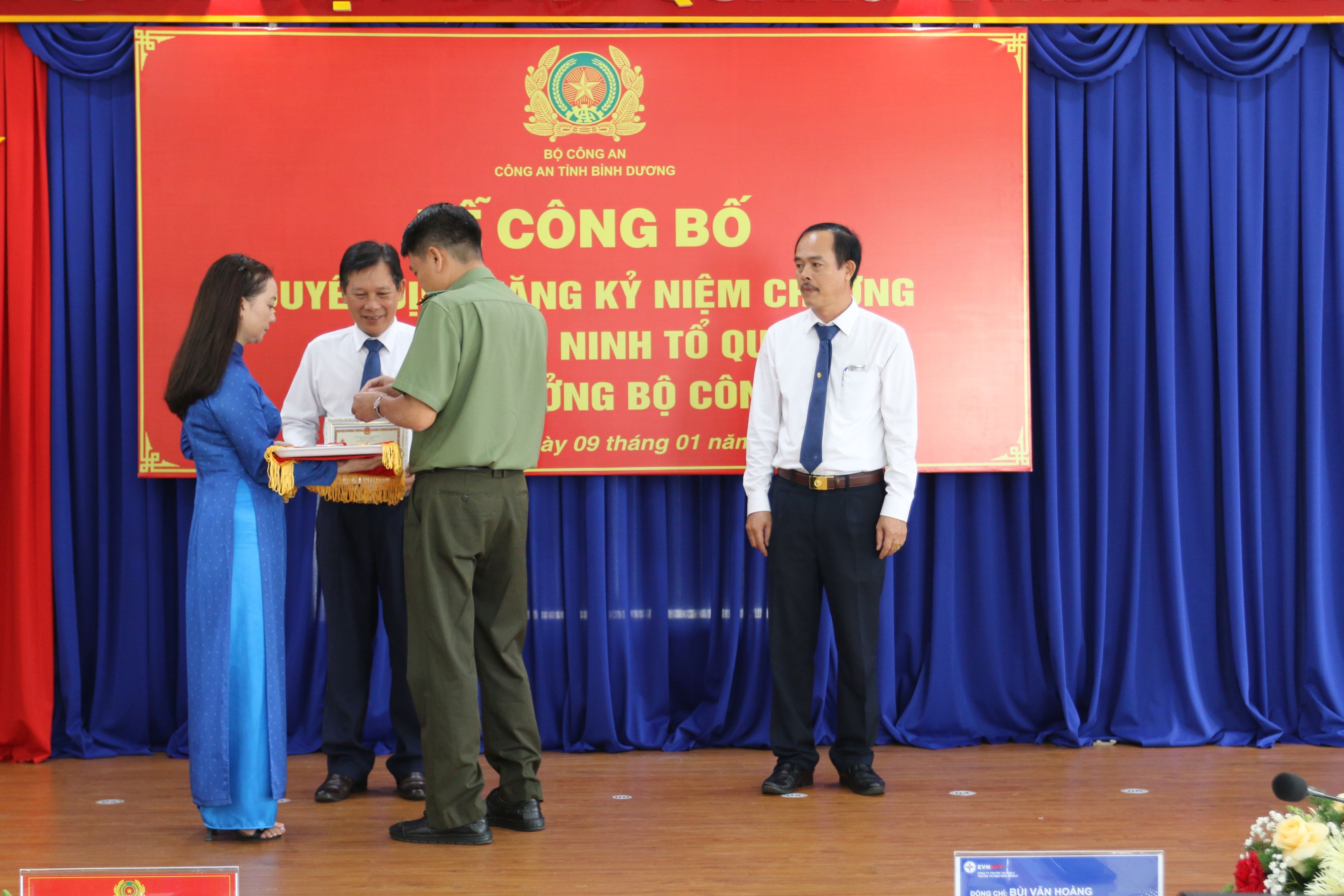 Đ/c Thượng tá Nguyễn Toàn Thắng- Phó trưởng phòng an ninh kinh tế Công an tỉnh Bình Dương trao kỷ niệm chương của Bộ trưởng Bộ Công an cho đ/c Bùi Văn Hoàng -Giám đốc Truyền tải tải điện miền Đông 2 và Đ/c Đào Viết Trường - Trưởng phòng Tổng hợp.