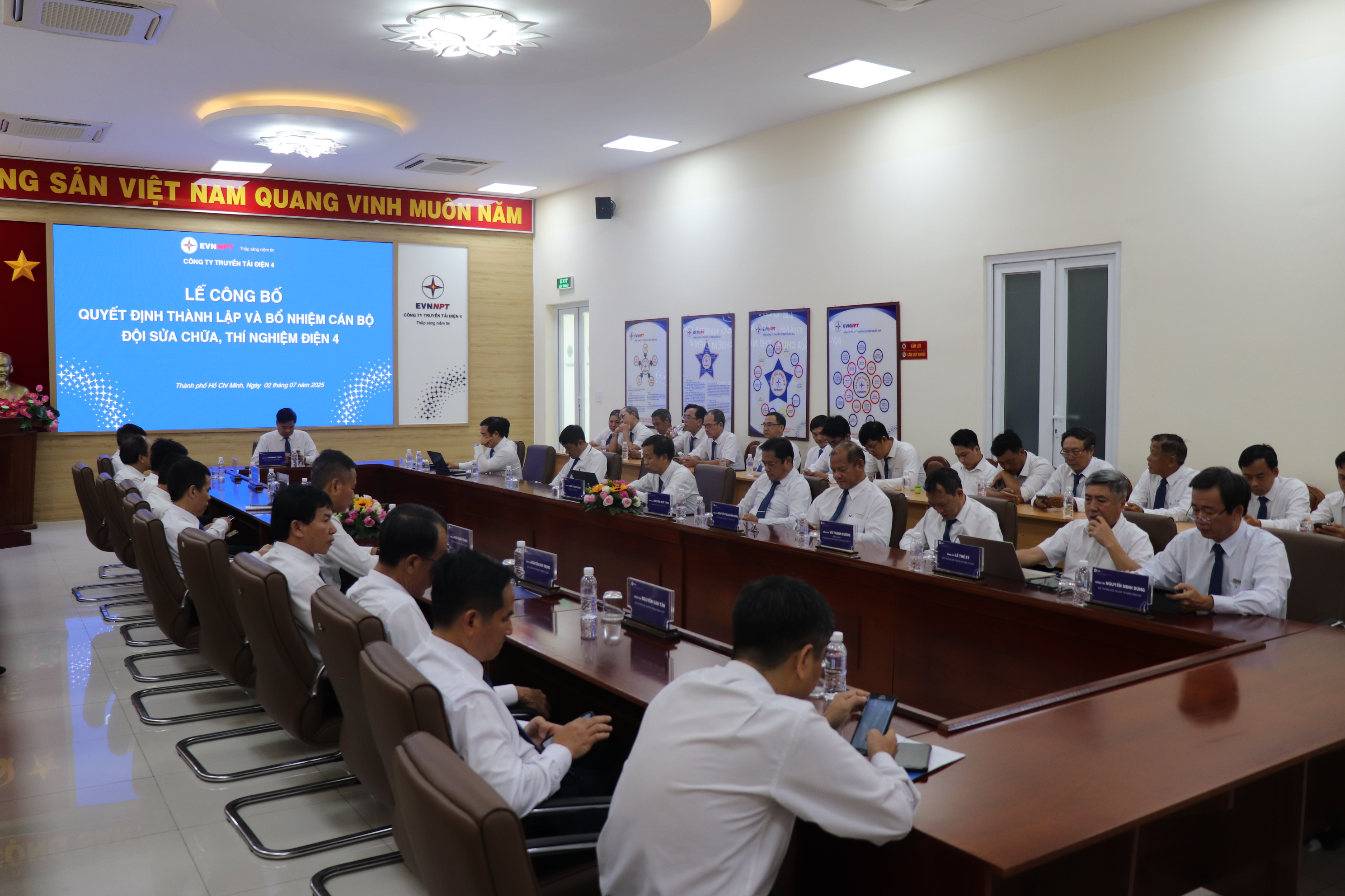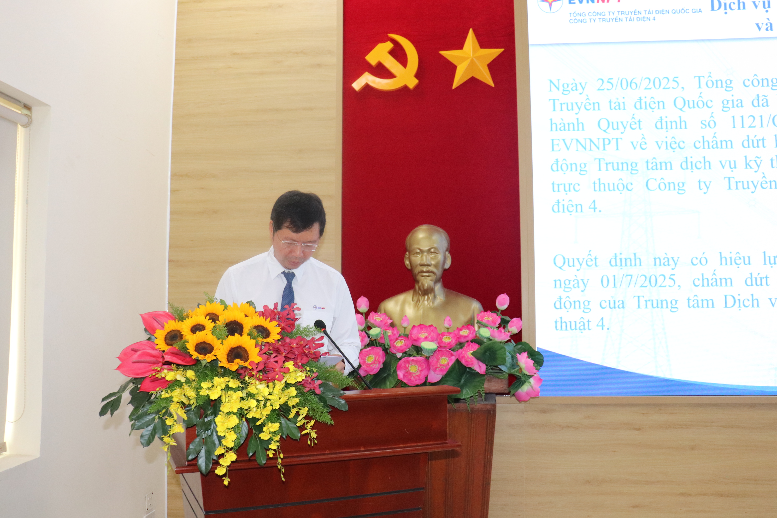 Tại buổi lễ, Ông Đống Tiến Long – Trưởng phòng Tổ chức và nhân sự Công ty đã công bố Quyết định số 1121/QĐ-EVNNPT ngày 25/6/2025 về việc về việc chấm dứt hoạt động Trung tâm Dịch vụ kỹ thuật 4. Theo đó, thành lập Đội Sửa chữa, thí nghiệm điện 4, quyết định này có hiệu lực thi hành kể từ ngày 01/7/2025. Đội Sửa chữa, thí nghiệm điện 4 có Đội trưởng và 02 Đội phó; các Tổ Sửa chữa thiết bị điện, Tổ Thí nghiệm điện, Tổ Vận tải, Tổ Tự động hóa.