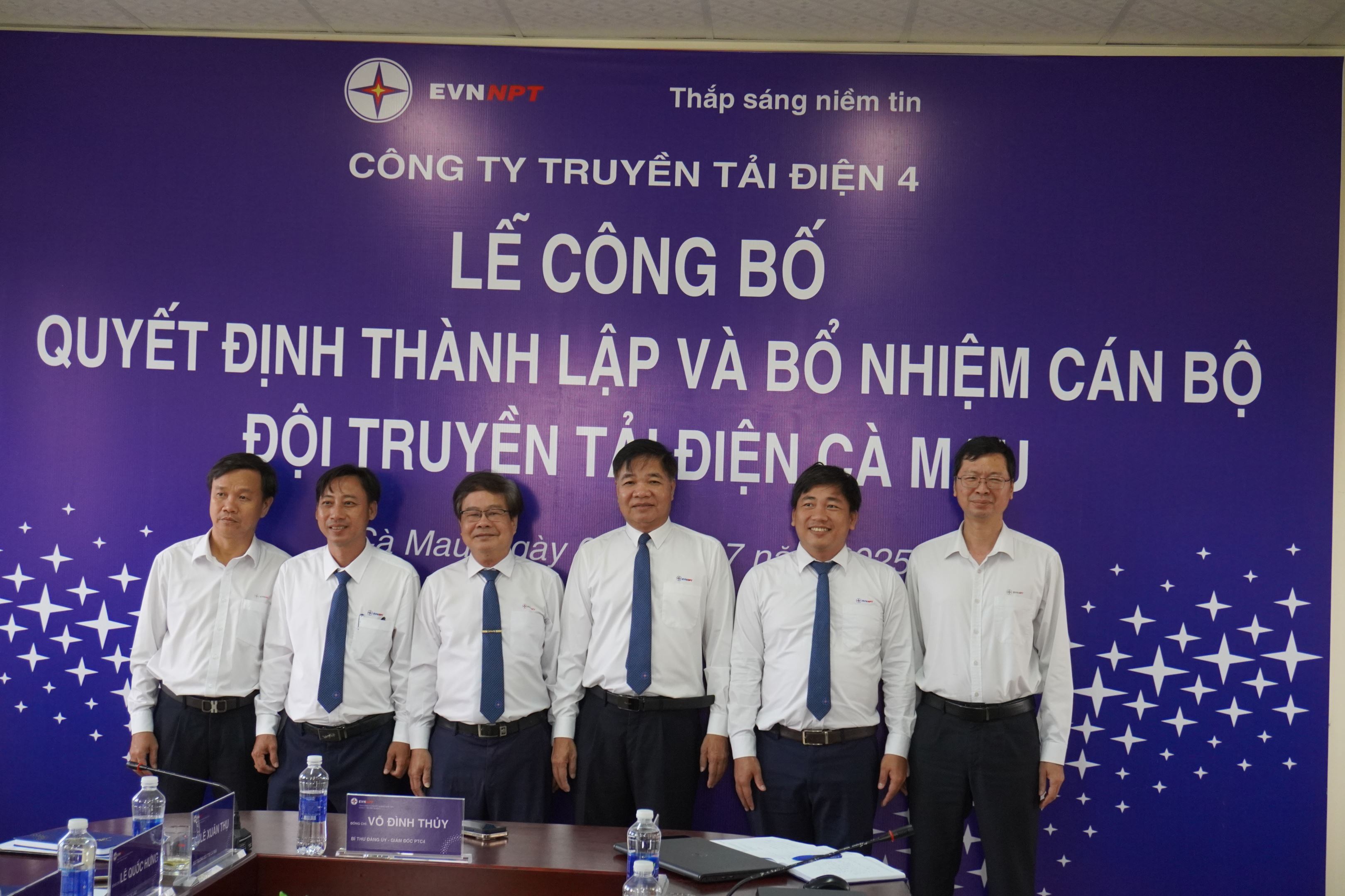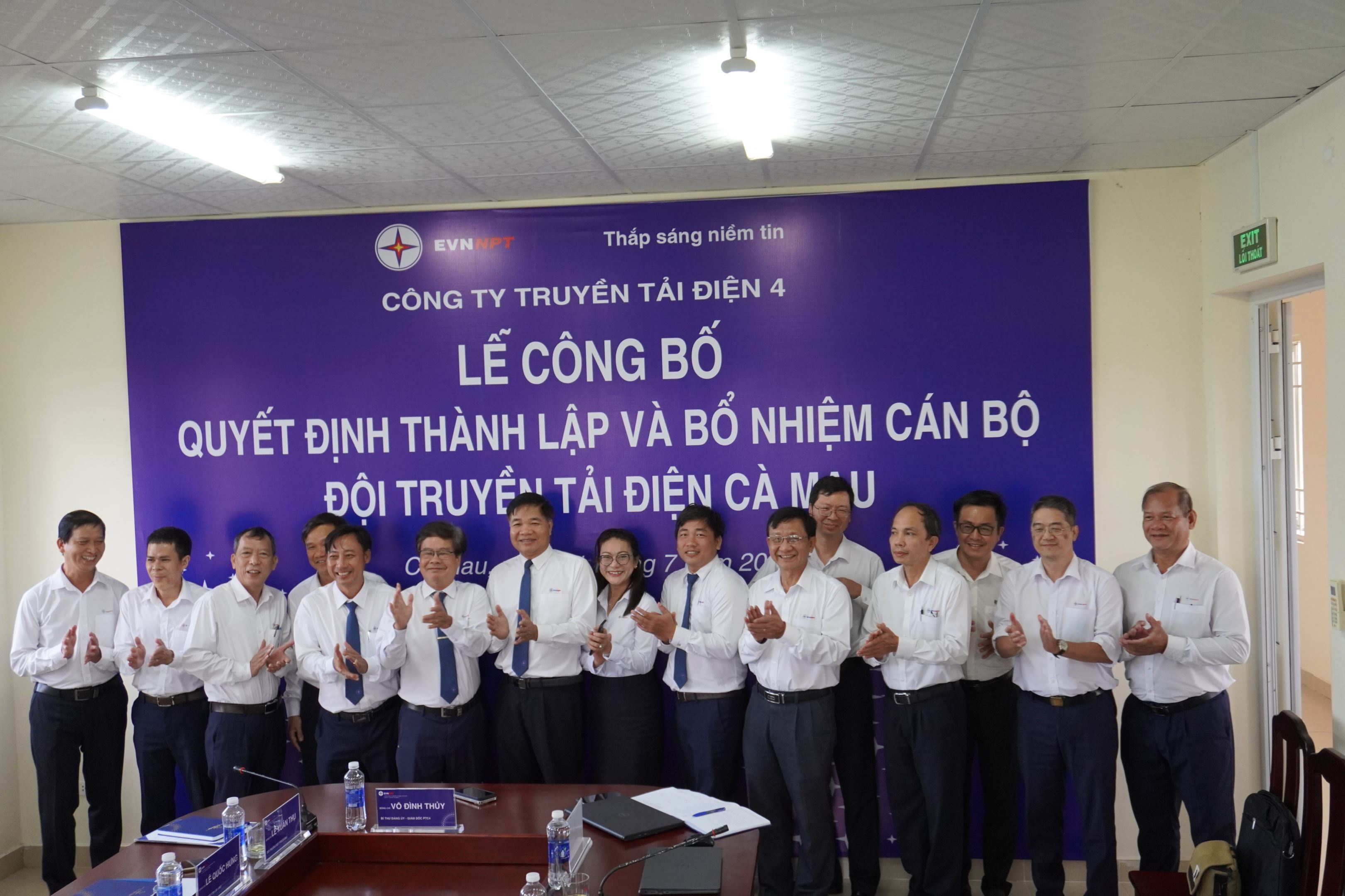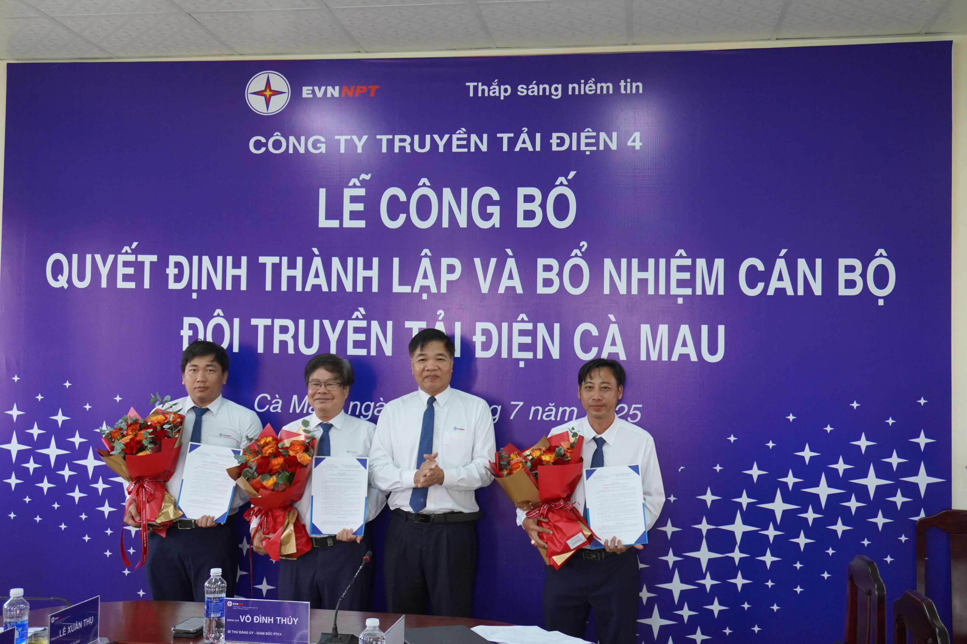 Cũng trong khuôn khổ buổi lễ, Công ty Truyền tải điện 4 đã công bố các quyết định bổ nhiệm cán bộ lãnh đạo đơn vị, cụ thể ông Lê Xuân Thụ, nguyên Giám đốc Truyền tải điện Miền Tây 3 làm Đội trưởng, ông Lê Quốc Hưng, nguyên đội trưởng Đội TTĐ Bạc Liêu và ông Bùi Quang Hà, nguyên Tổ trưởng tổ TTLĐ Cà Mau làm Đội phó.