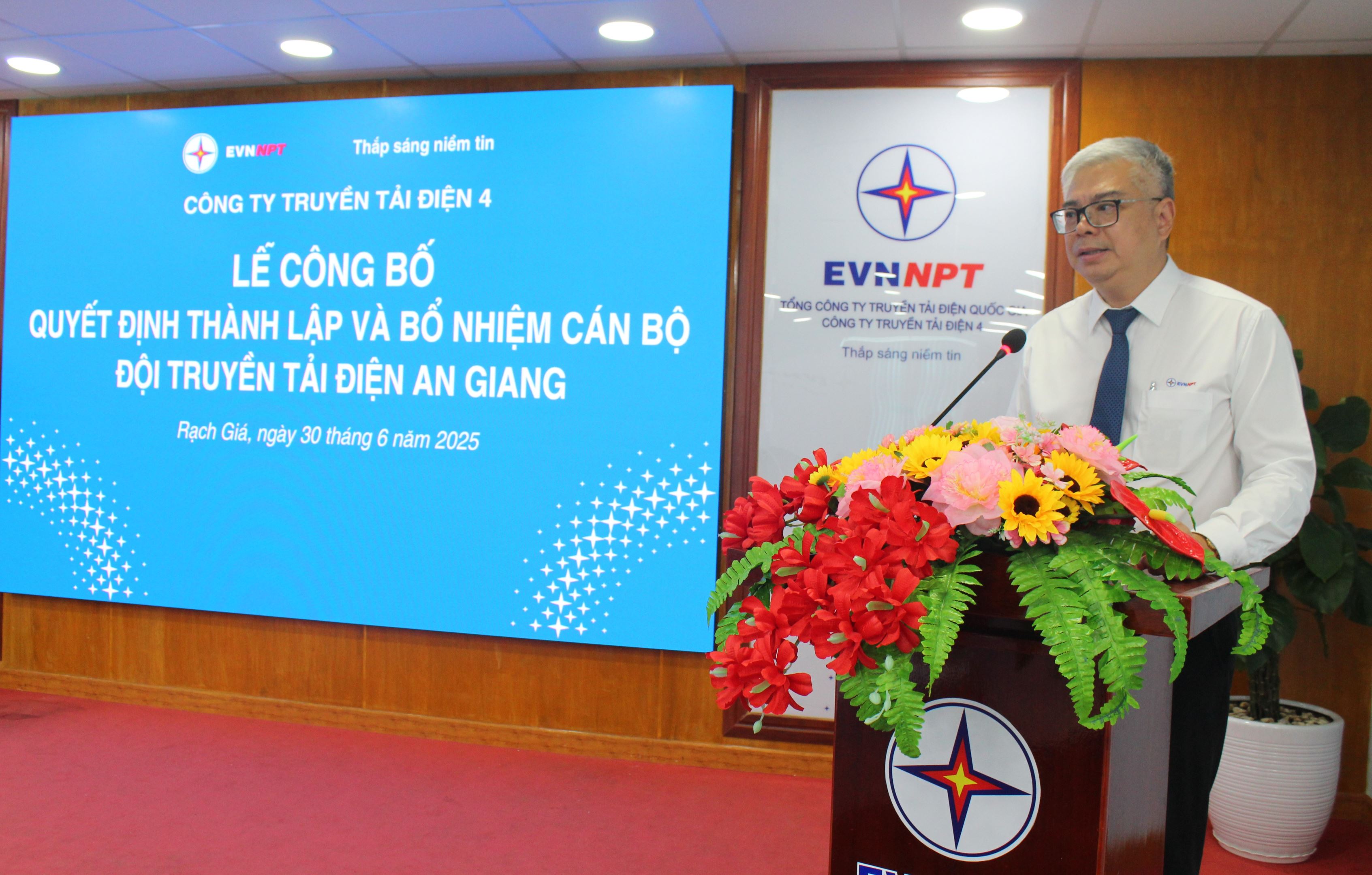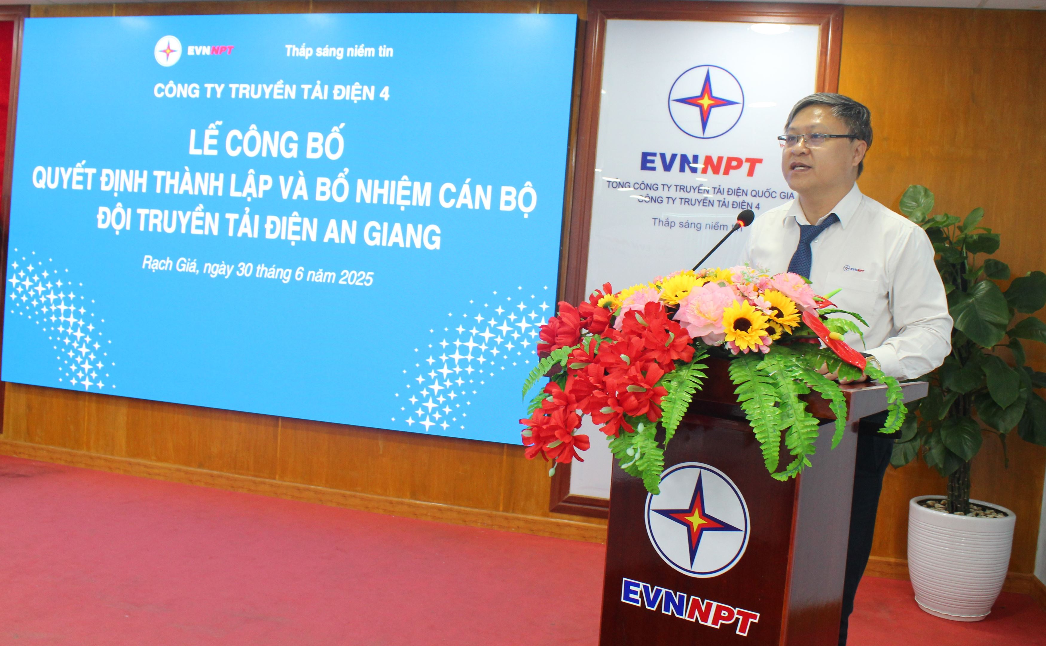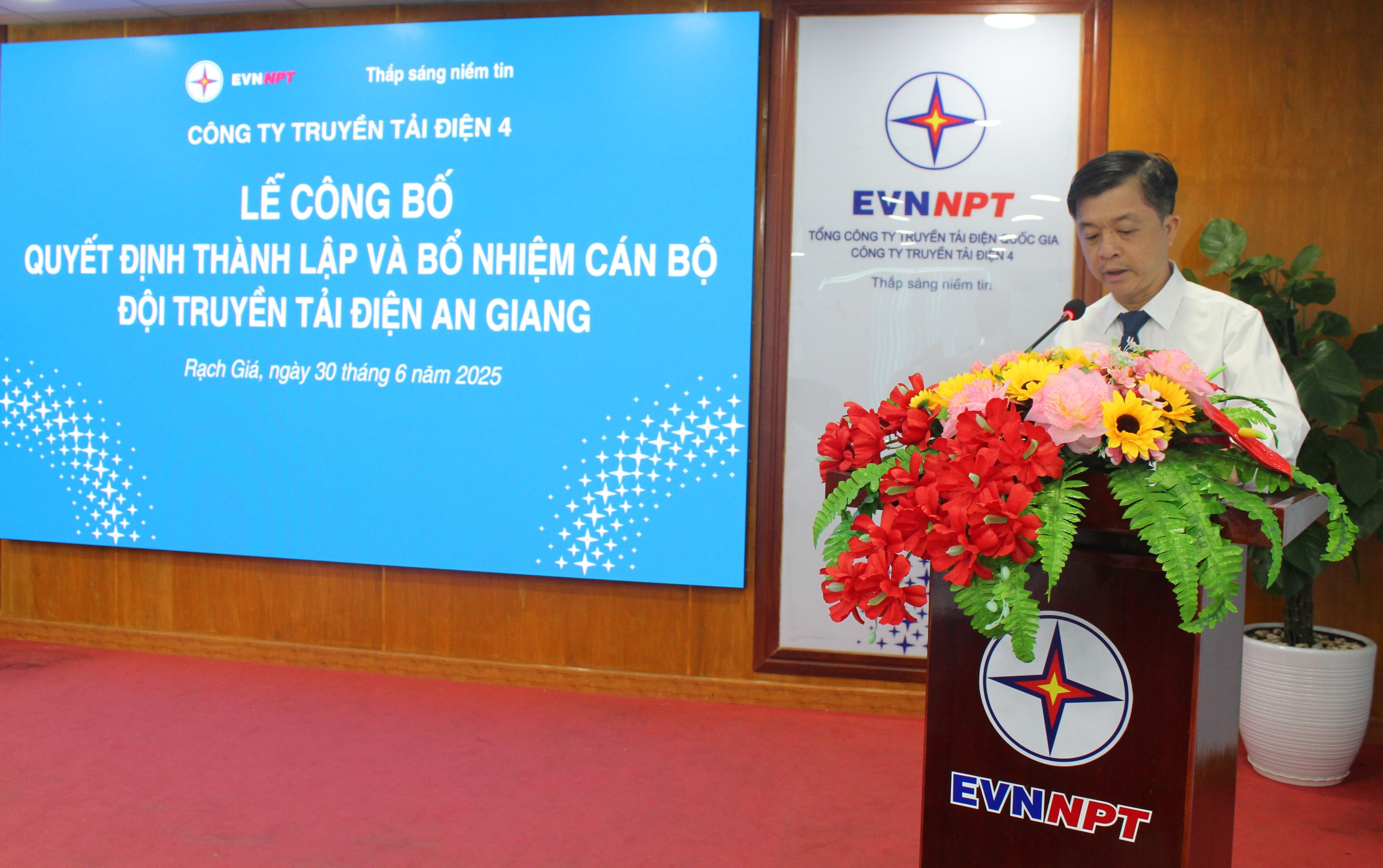 Tại buổi lễ, Công ty Truyền tải điện 4 đã công bố các Quyết định về chấm dứt hoạt động các Truyền tải điện; thành lập Đội Truyền tải điện An Giang và công tác cán bộ Đội Truyền tải điện An Giang. Theo đó, đồng chí Trần Quốc Hiệu được bổ nhiệm giữ chức vụ Đội trưởng, đồng chí Trần Minh Hiếu được bổ nhiệm giữ chức vụ Đội phó. Đội Truyền tải điện An Giang là đơn vị trực thuộc Công ty Truyền tải điện 4, có phạm vi quản lý vận hành lưới điện truyền tải trên địa bàn tỉnh An Giang. Để đảm bảo tổ chức bộ máy tinh gọn, hiệu quả, phù hợp với thực tiễn quản lý vận hành Đội Truyền tải điện An Giang, Công ty có quyết định thành lập 2 Tổ quản lý vận hành đường dây và 4 Tổ thao tác lưu động, Tổ quản lý vận hành trạm biến áp trực thuộc Đội.