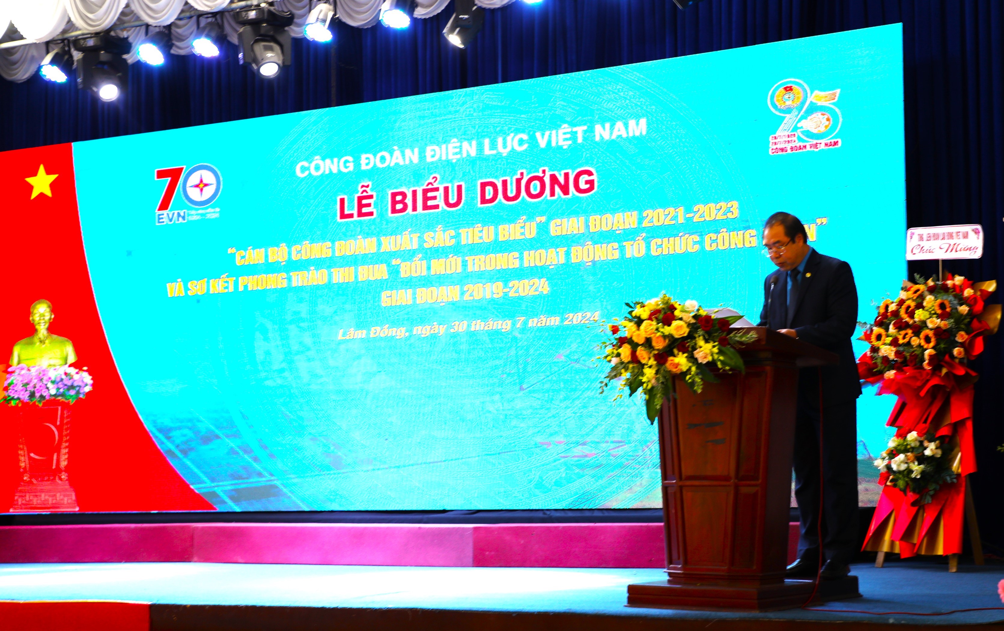 Đồng chí Đỗ Đức Hùng - Ủy viên Ban Chấp hành Tổng LĐLĐVN, Chủ tịch Công đoàn Điện lực Việt Nam phát biểu tại buổi Lể biểu dương.