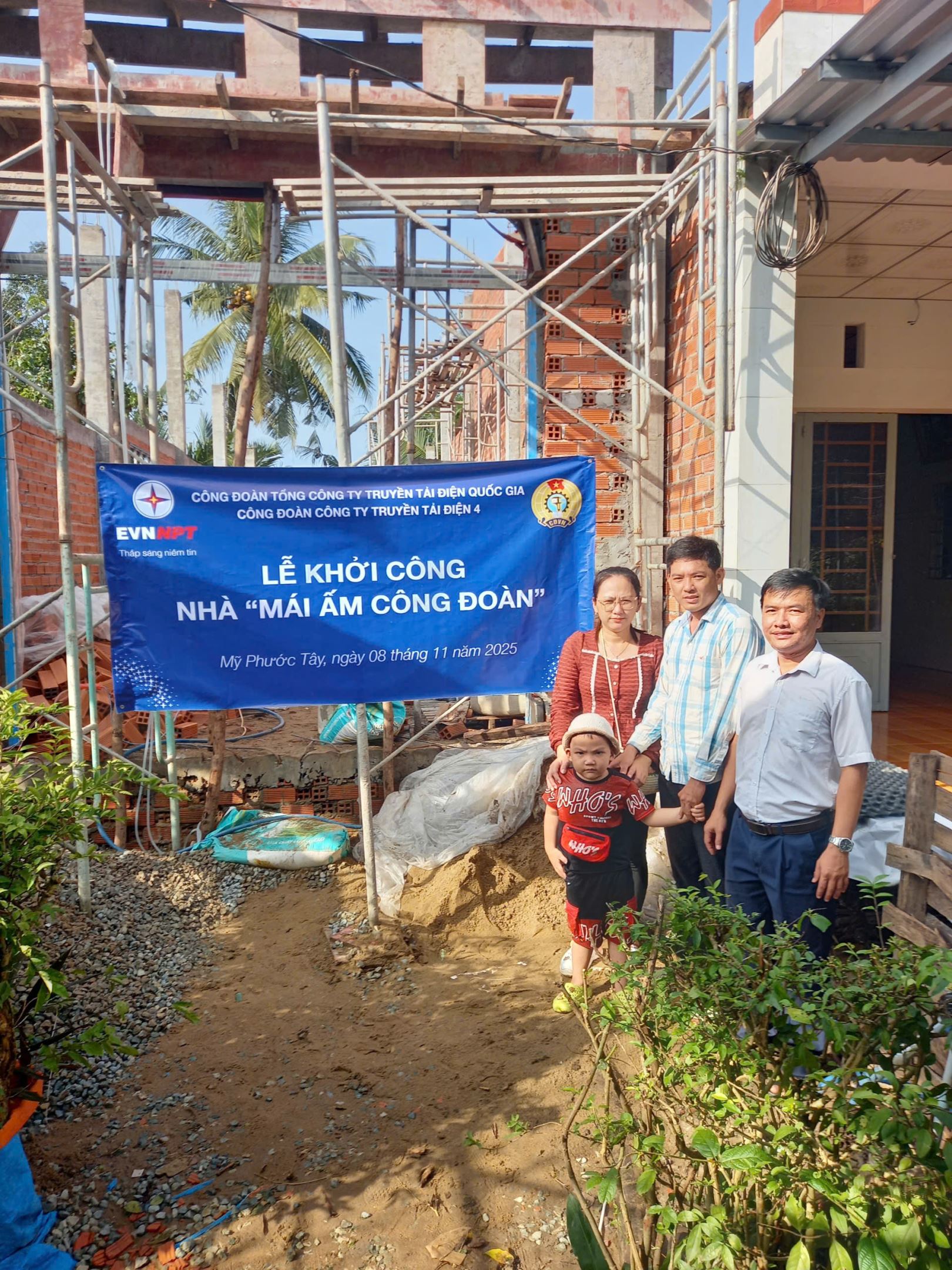 Tham dự buổi khởi công, có ông Dương Tấn Đạt - Phó Chủ tịch Công đoàn Đội Truyền tải điện Vĩnh Long cùng gia đình anh Phạm Hoàng Thọ.