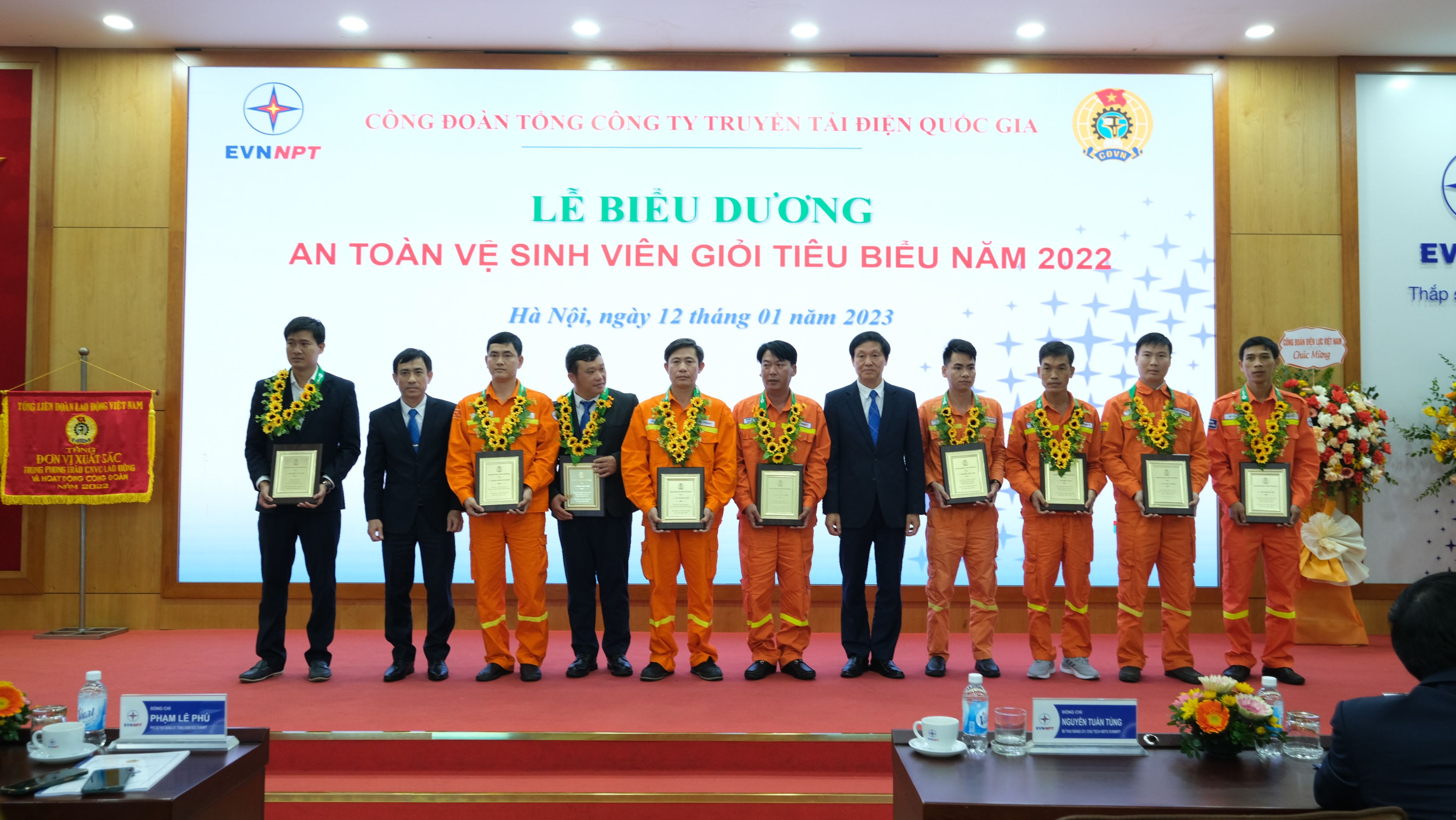 Đ/c Trịnh Tuấn Sơn, Chủ tịch Công đoàn EVNNPT và Đ/c Nguyễn Huy Thắng, Phó Chủ tịch Công đoàn EVNNPT trao giấy khen cho các ATVSV giỏi tiêu biểu năm 2022.