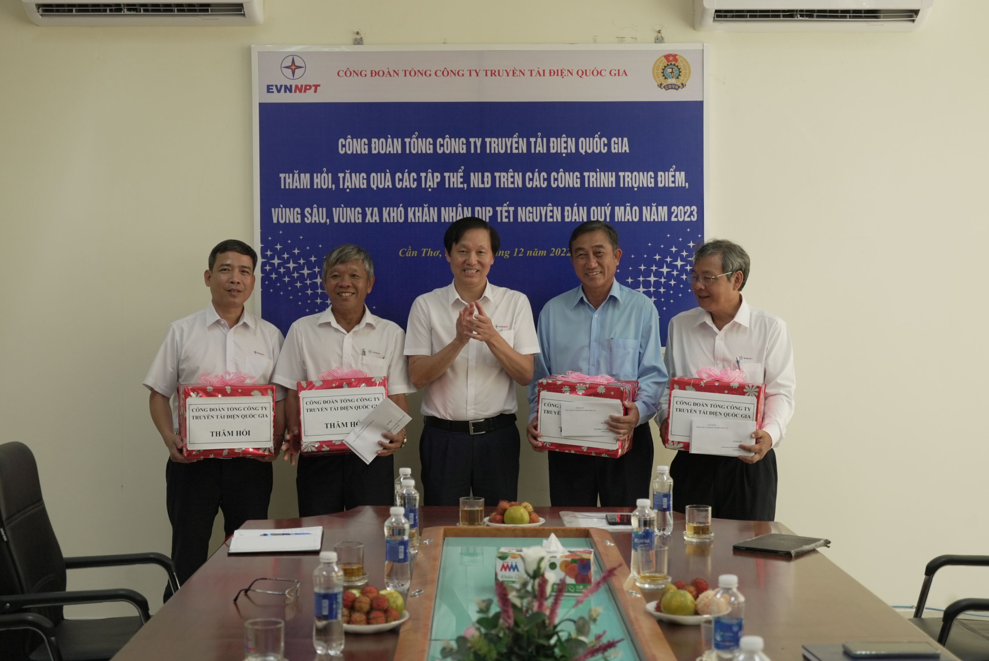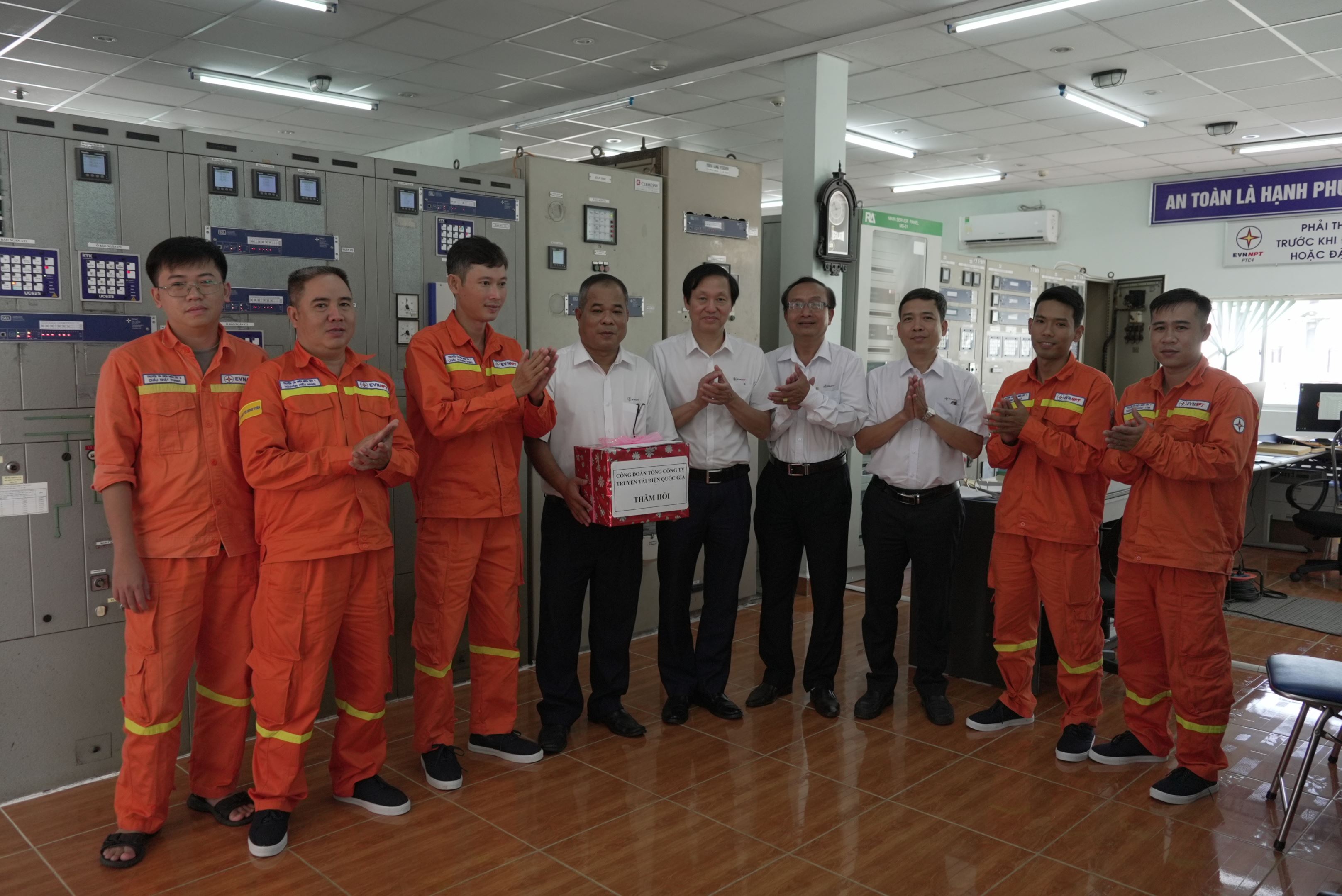 Ông Trịnh Tuấn Sơn, Chủ tịch Công đoàn EVNNPT (Đứng giữa) tặng quà thăm hỏi, động viên Trạm 220kV Trà Nóc.