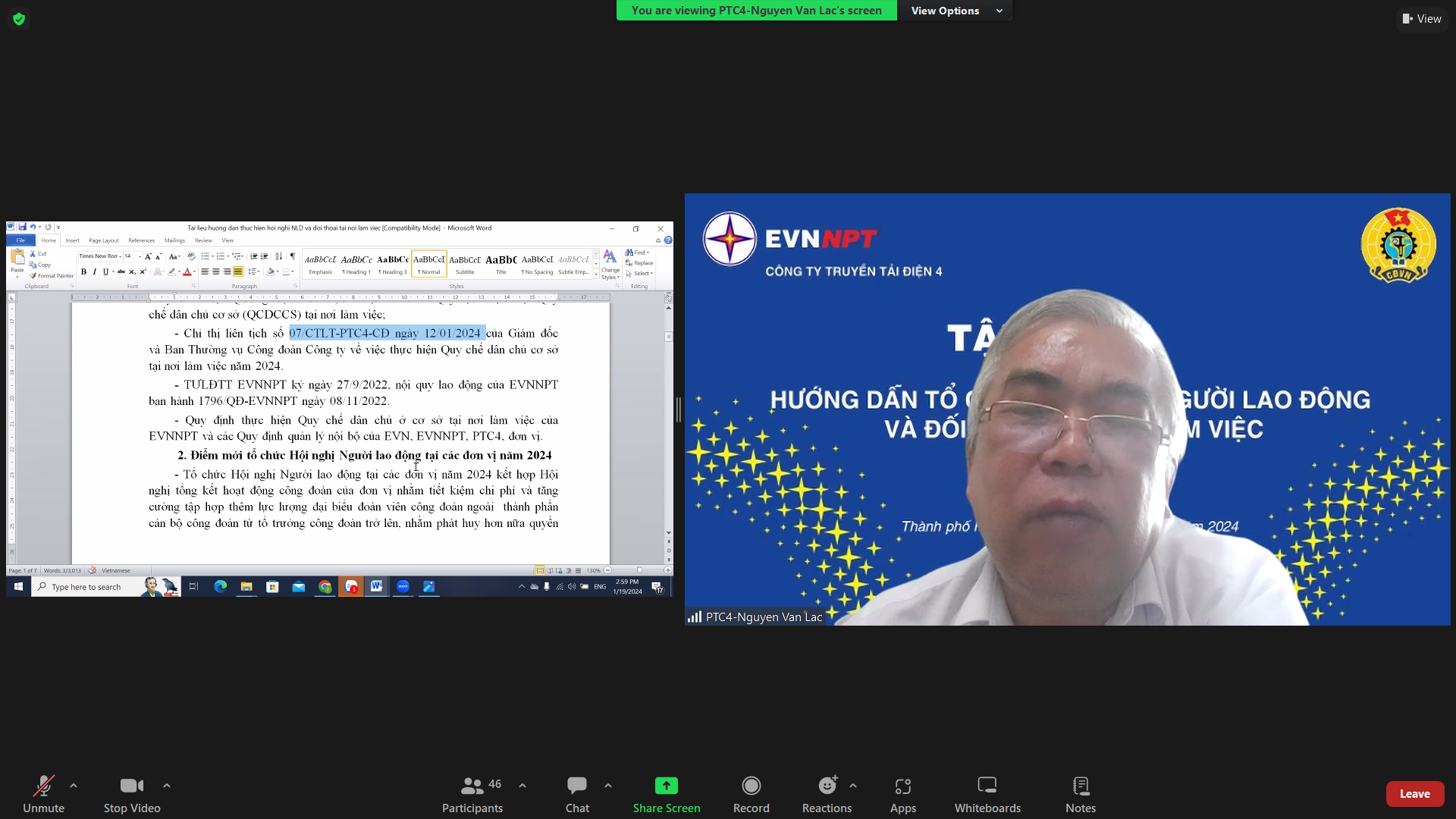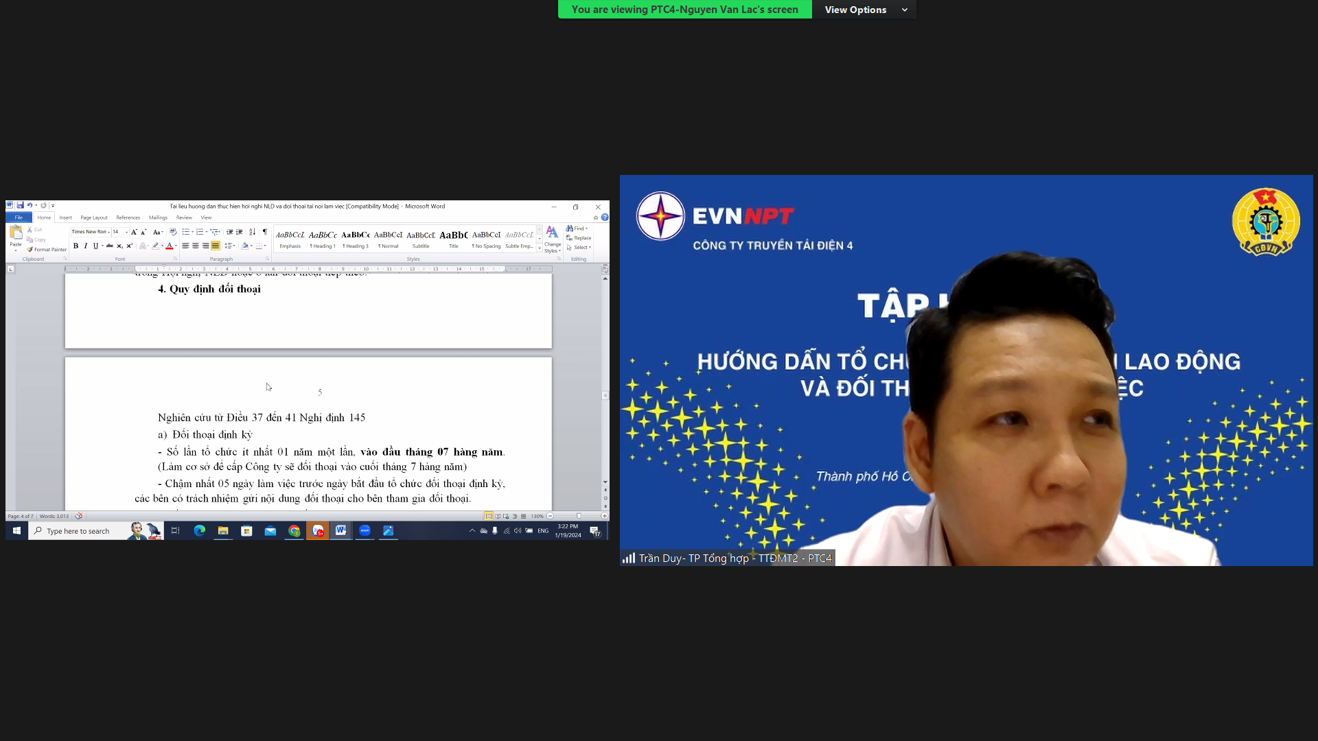 Chỉ thị liên tịch số 07/CTLT-PTC4-CĐ ngày 12/01/2024 giữa Giám đốc và Ban Thường vụ Công đoàn Công ty về việc thực hiện Quy chế dân chủ cơ sở tại nơi làm việc năm 2024, được ban hành với nhiều điểm mới nhằm nâng cao hơn nữa hiệu quả công tác thực hiện dân chủ ở cơ sở, với định hướng đẩy mạnh thực hiện công tác đối thoại ở cấp đơn vị trực thuộc. Một trong những điểm mới trong công tác tổ chức Hội nghị Người lao động năm 2024 là việc kết hợp Hội nghị Người lao động với Hội nghị tổng kết hoạt động công đoàn, nhằm tiết kiệm chi phí và mở rộng hơn nữa thành phần đại biểu đoàn viên công đoàn tham dự tổng kết, qua đó phát huy hơn nữa quyền dân chủ của đoàn viên, người lao động trong việc đánh giá kết quả hoạt động năm triển khai và đề xuất giải pháp thực hiện nhiệm vụ năm công tác mới; Điểm mới thứ hai là tổ chức Hội nghị đối thoại cấp đơn vị trực thuộc Công ty theo đúng trình tự thủ tục quy định tại Nghị định 145/2020/NĐ-CP trước khi tổ chức đối thoại cấp Công ty. Việc tổ chức đối thoại đúng trình tự tại cấp đơn vị nhằm tăng cường hơn nữa sự chia sẻ, sự hiểu biết lẫn nhau, từ đó xây dựng quan hệ lao động hợp tình hợp lý giữa Công ty, đơn vị và người lao động thông qua việc chia sẻ thông tin, trao đổi ý kiến. Đối thoại ở cấp đơn vị Công đoàn cơ sở thành viên cũng được chia làm 3 hình thức: đối thoại định kỳ, đối thoại khi có yêu cầu của một hoặc các bên và đối thoại khi có vụ việc như ở cấp Công đoàn cơ sở; Điểm mới thứ ba là việc tăng số lượng thành viên ban thanh tra nhân dân Công ty từ 05 thành viên như hiện nay lên thành 09 thành viên, trong đó cơ cấu mỗi đơn vị truyền tải điện giới thiệu 01 người tham gia ban thanh tra nhân dân Công ty, đồng thời không tổ chức thành lập ban thanh tra nhân dân tại đơn vị, để tránh tình trạng phân mảng, tăng cường liên kết theo chiều dọc, nhằm nâng cao hiệu quả hoạt động của Ban thanh tra nhân dân.