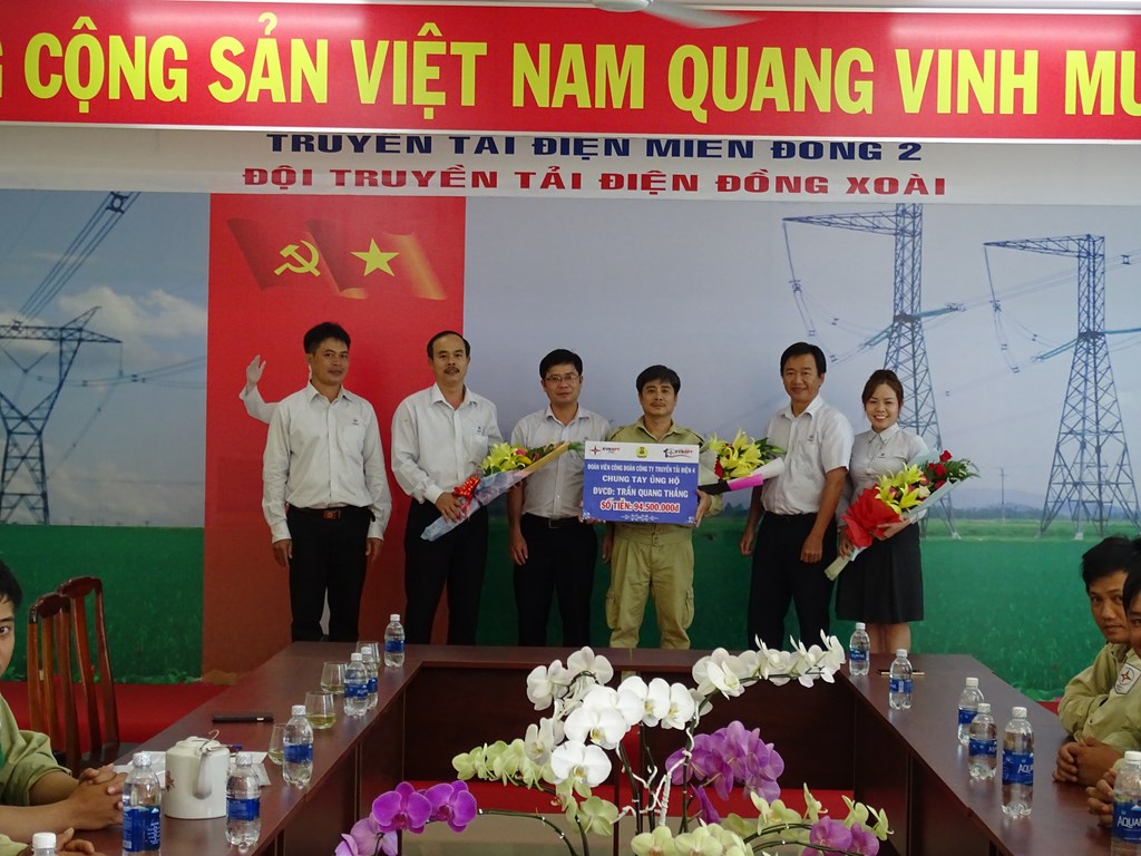 Thay mặt cho 303 đoàn viên Công đoàn Truyền tải điện Miền Đông 2, Ông Nguyễn Minh Dũng – Giám đốc TTĐMĐ2 và Ông Nguyễn Tấn Hậu – Phó Giám đốc – Chủ tịch Công đoàn đã trao số tiền 94.500.000 đồng(chín mươi bốn triệu năm trăm nghìn đồng) để giúp đỡ phần nào cho đoàn viên Trần Quang Thắng, hỗ trợ anh vượt qua khó khăn, an tâm công tác, hoàn thành nhiệm vụ sản xuất được giao.