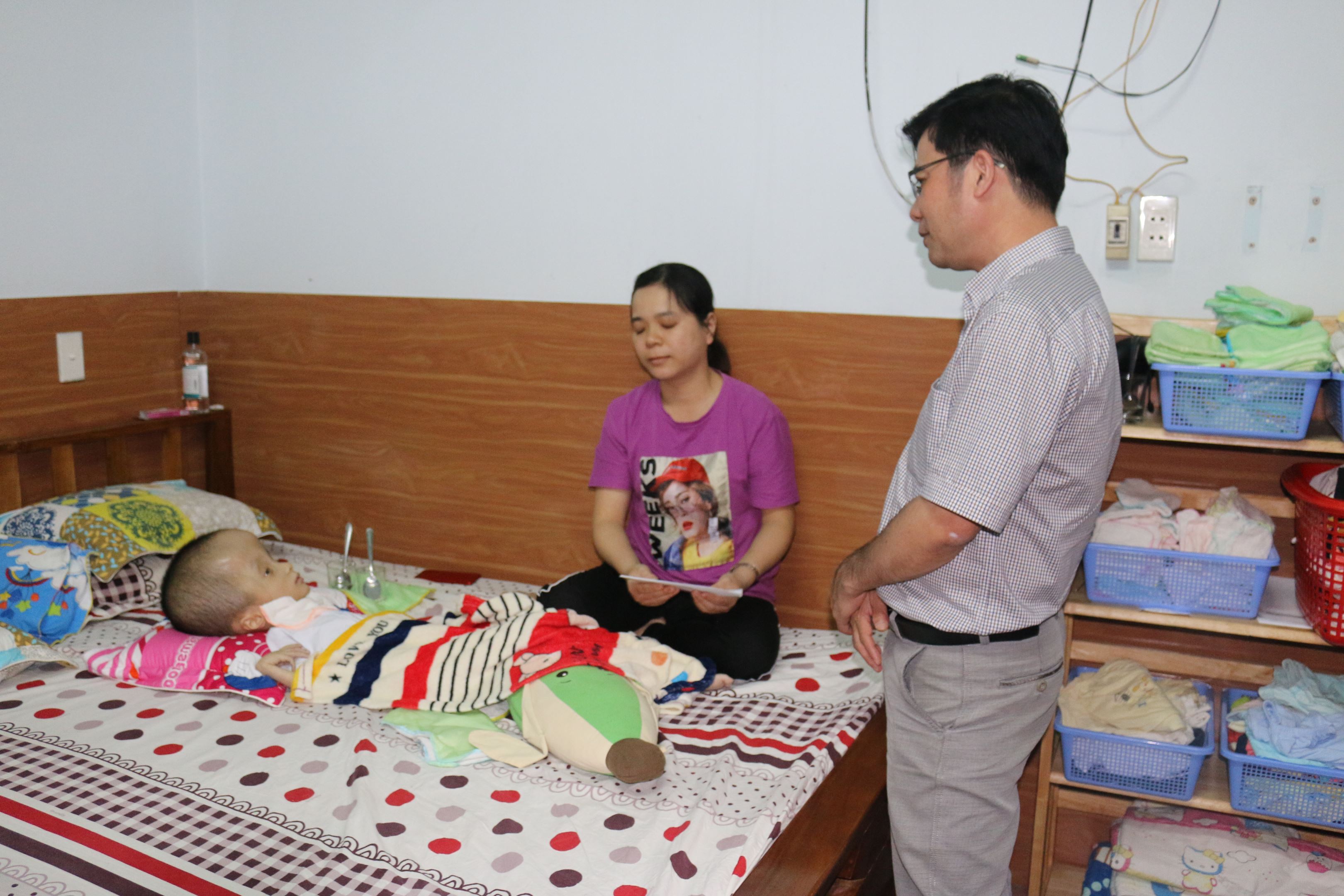 Trong đoàn đi có Ông Nguyễn Minh Dũng - Giám đốc TTĐMĐ2, Ông Nguyễn Tấn Hậu – Phó Giám đốc - Chủ tịch Công đoàn TTĐMĐ2 và Đào Viết Trường -Trưởng phòng Tổng hợp. Tiếp chúng tôi vào một buổi chiều giữa tháng 12, dưới cái nắng nhàn nhạt của buổi chiều thu, se se lạnh mùa Giáng sinh chúng tôi nhận thấy hai vợ chồng anh còn trẻ nhưng gặp vô vàn khó khăn thu nhập chính trông chờ vào đồng lương của anh nên chỉ đủ trang trải cuộc sống hằng ngày, nhìn quanh nhà chỉ có một cái tivi là món đồ giá trị , ngoài ra không có bộ bàn ghế ngồi và các vật dụng sinh hoạt phục vụ cuộc sống hằng ngày cũng không (vì tập trung vào dưỡng bệnh cho con), gia đình bên nhà vợ anh thấy hoàn cảnh khổ quá mua tặng cháu cái máy lạnh để điều hòa nhiệt độ cho cháu đỡ đau đớn, đã 8 năm qua anh chị không có một đêm tròn giấc.