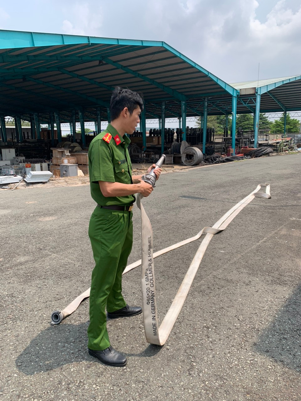 Lực lượng PCCC tại kho thực hành sử dụng bình chữa cháy.