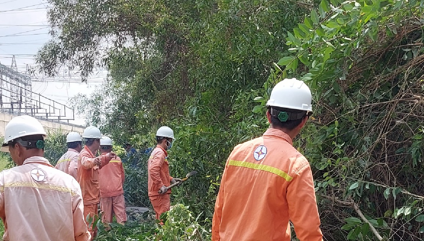 CBCNV Trạm 500kV Mỹ Tho phối hợp với Đội Truyền tải Điện Mỹ Tho thực hiện công tác phát quang cây xanh ngăn ngừa sự cố.
