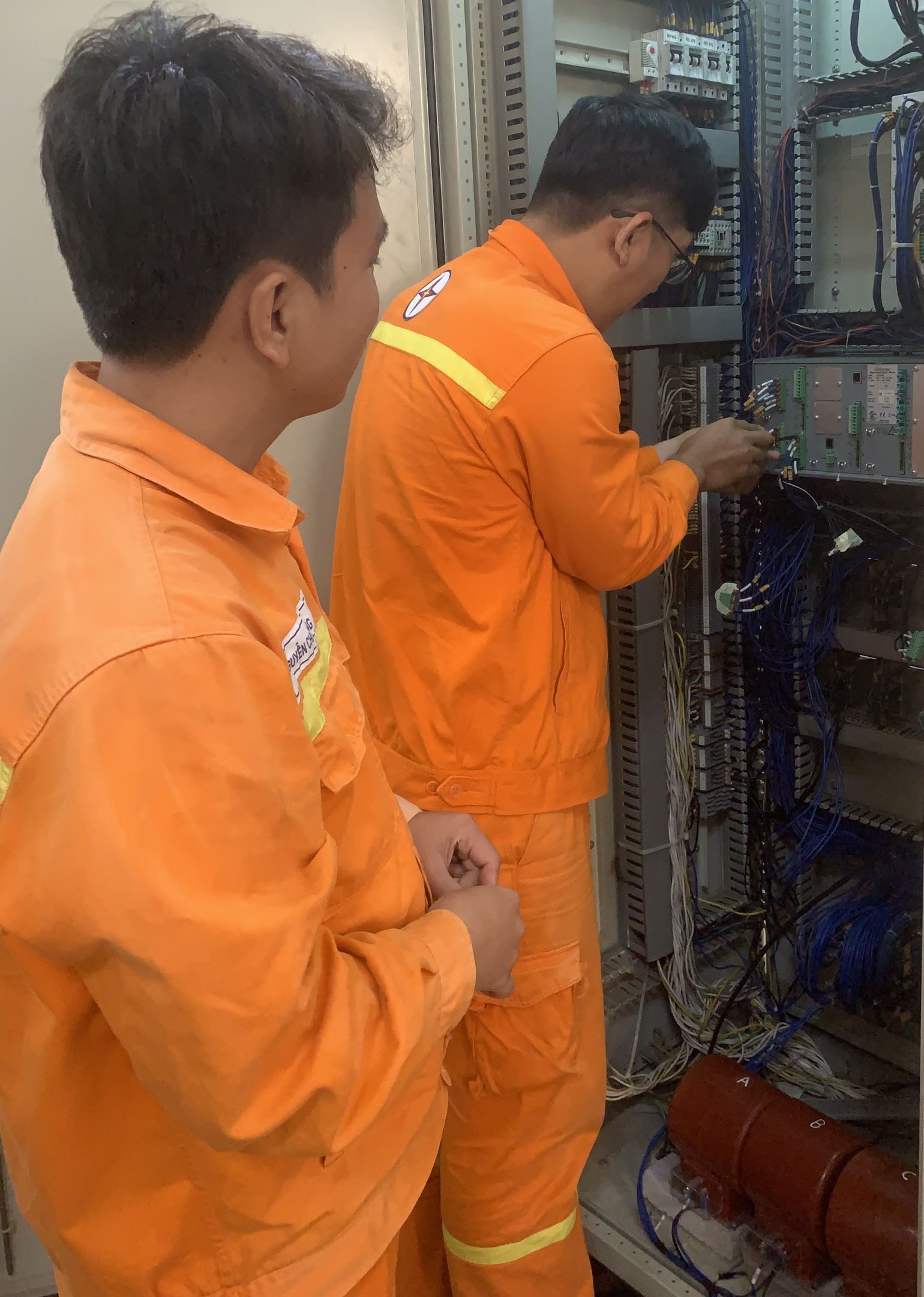 Đoàn viên Nguyễn Chí Công, Lê Phước Hiệp thi công kéo cáp, đấu nối mạch tín hiệu trạng thái máy cắt