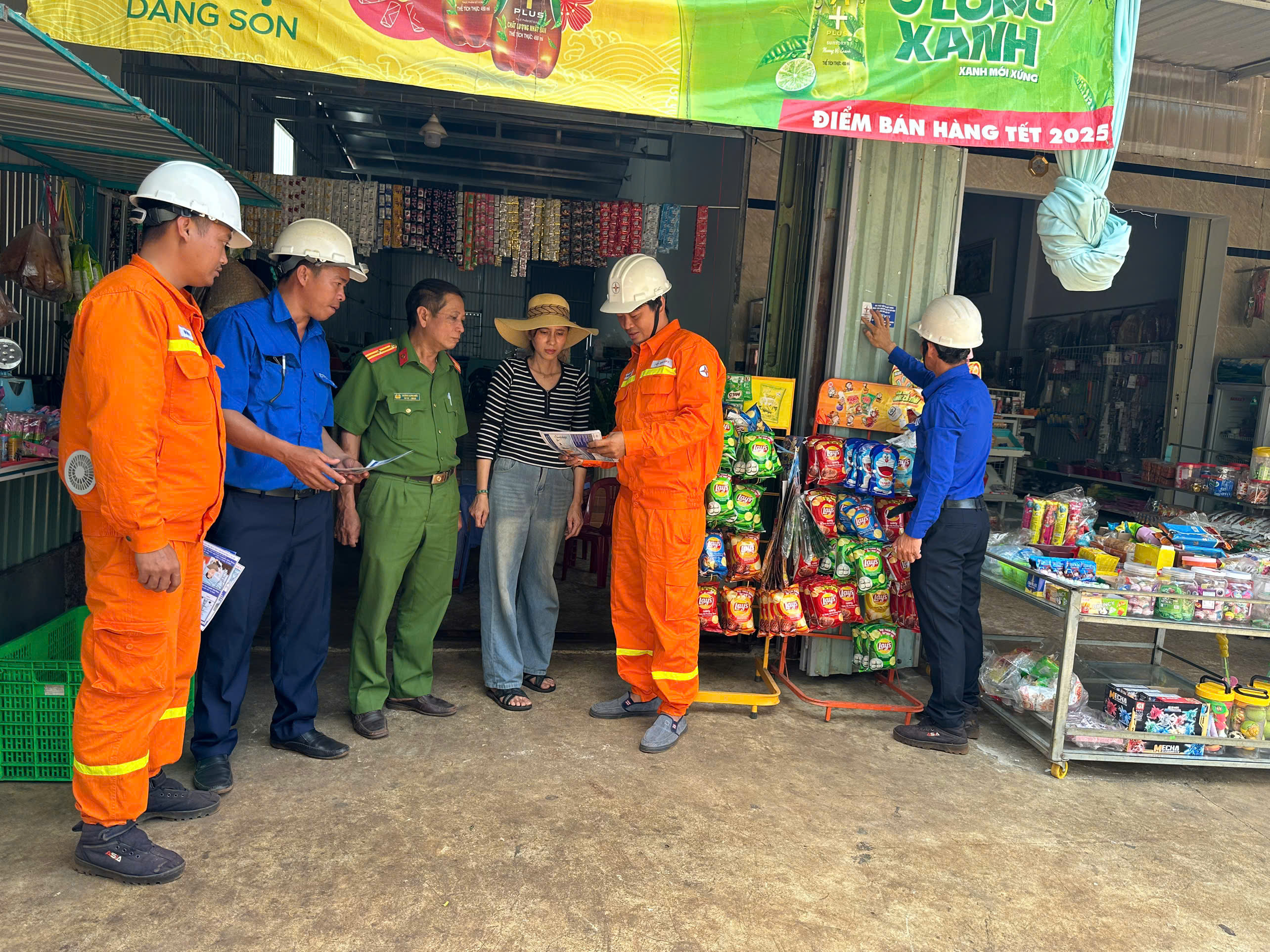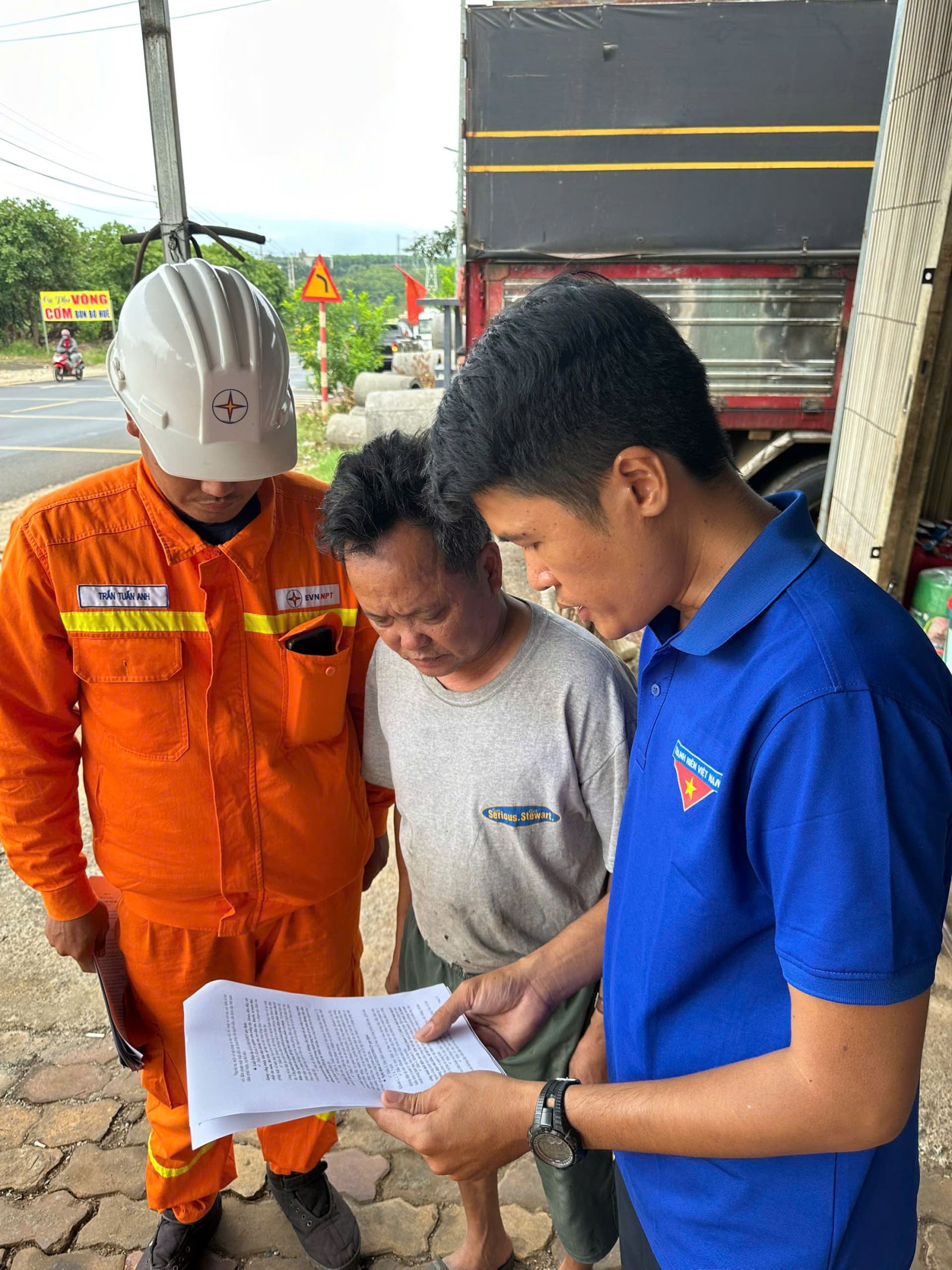 Tại mỗi điểm, đoàn đã phát tờ rơi tuyên truyền về một số hành vi bị nghiêm cấm khi có các hoạt động trong và gần hành lang đường dây. Kèm với đó là tờ trích dẫn một số hành vi bị nghiêm cấm theo Luật Điện Lực số 61/2024/QH15 của Quốc hội ngày 30/11/2024 có hiệu lực thi hành từ ngày 01/02/2025 như: “Điều 68, Khoản 6, cây trong và ngoài hành lang bảo vệ an toàn công trình điện lực phải bảo đảm khoảng cách an toàn phóng điện theo cấp điện áp. Cây phát triển vi phạm khoảng cách an toàn phóng điện phải được chủ sở hữu cây, người sử dụng đất kịp thời chặt tỉa phần vi phạm. Trường hợp cây phát triển vi phạm khoảng cách an toàn phóng điện gây sự cố lưới điện thì tùy theo mức độ thiệt hại, chủ sở hữu cây, người sử dụng đất bị xử lý theo quy định của pháp luật”. Và Nghị định số 62/2025/NĐ-CP ngày 04/3/2025 của Chính phủ Quy định chi tiết thi hành Luật Điện lực về bảo vệ công trình điện lực và an toàn trong lĩnh vực điện lực, có hiệu lực thi hành từ ngày 04/3/2025 như “Điều 4, Khoản 6, Trong phạm vi 1.000 m tính từ mép ngoài công trình lưới điện cao áp, siêu cao áp trên không hoặc 500 m tính từ mép ngoài công trình lưới điện trung áp ra các phía xung quanh, tổ chức, cá nhân không được thả diều, vật thể bay trừ các thiết bị phục vụ quốc phòng, an ninh và của đơn vị quản lý vận hành công trình điện lực làm nhiệm vụ kiểm tra, vận hành và bảo trì công trình”, … Quyết định số 1944/QĐ-TTg ngày 04/12/2017 của Thủ tướng Chính phủ Về việc đưa Hệ thống Truyền tải điện 500kV vào Danh mục công trình quan trọng liên quan đến an ninh quốc gia, Nghị định số 134/2013/NĐ-CP ngày 17/10/2013 Quy định về xử phạt vi phạm hành chính trong lĩnh vực điện lực, an toàn đập thủy điện, sử dụng năng lượng tiết kiệm và hiệu quả; ….