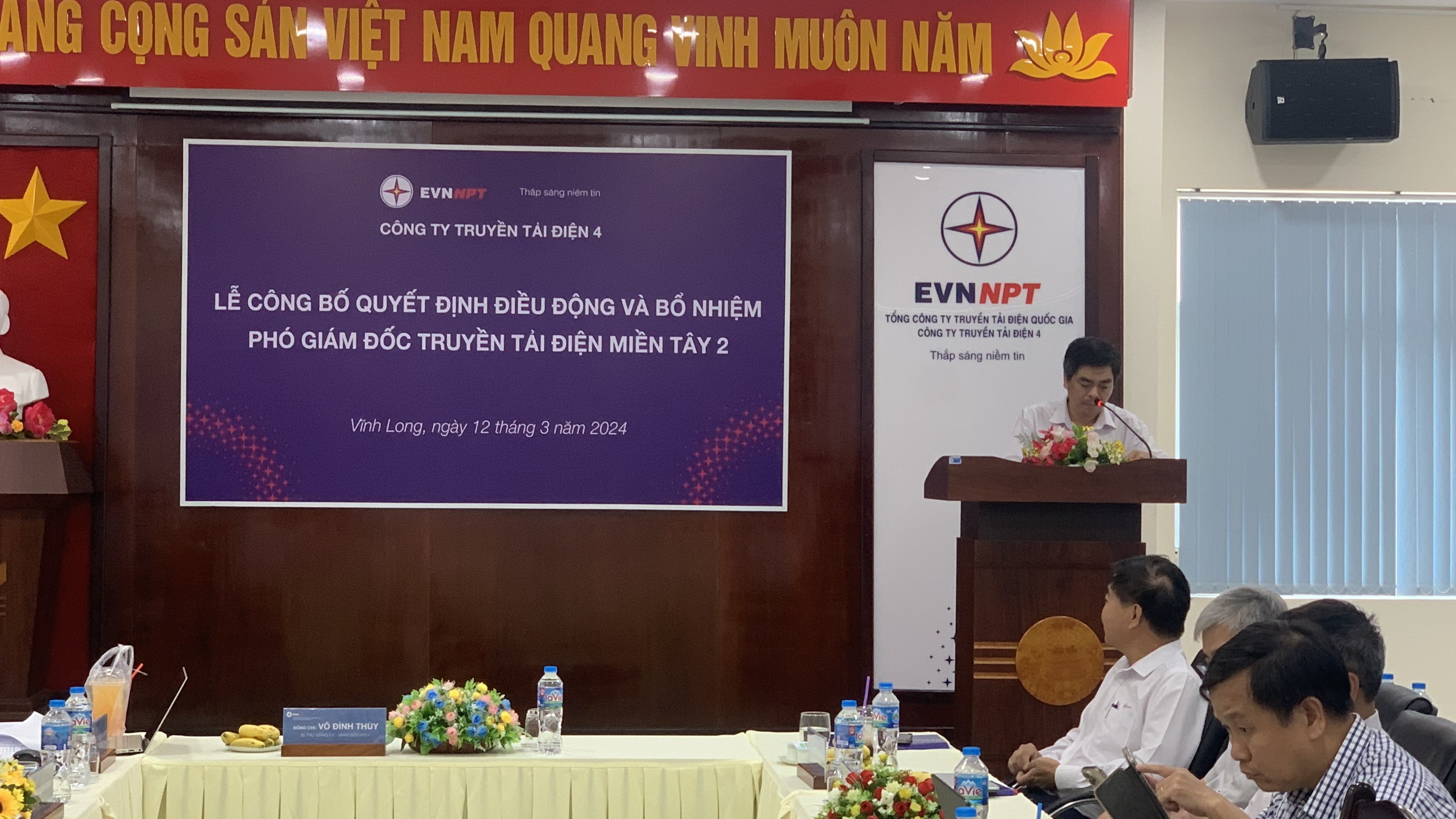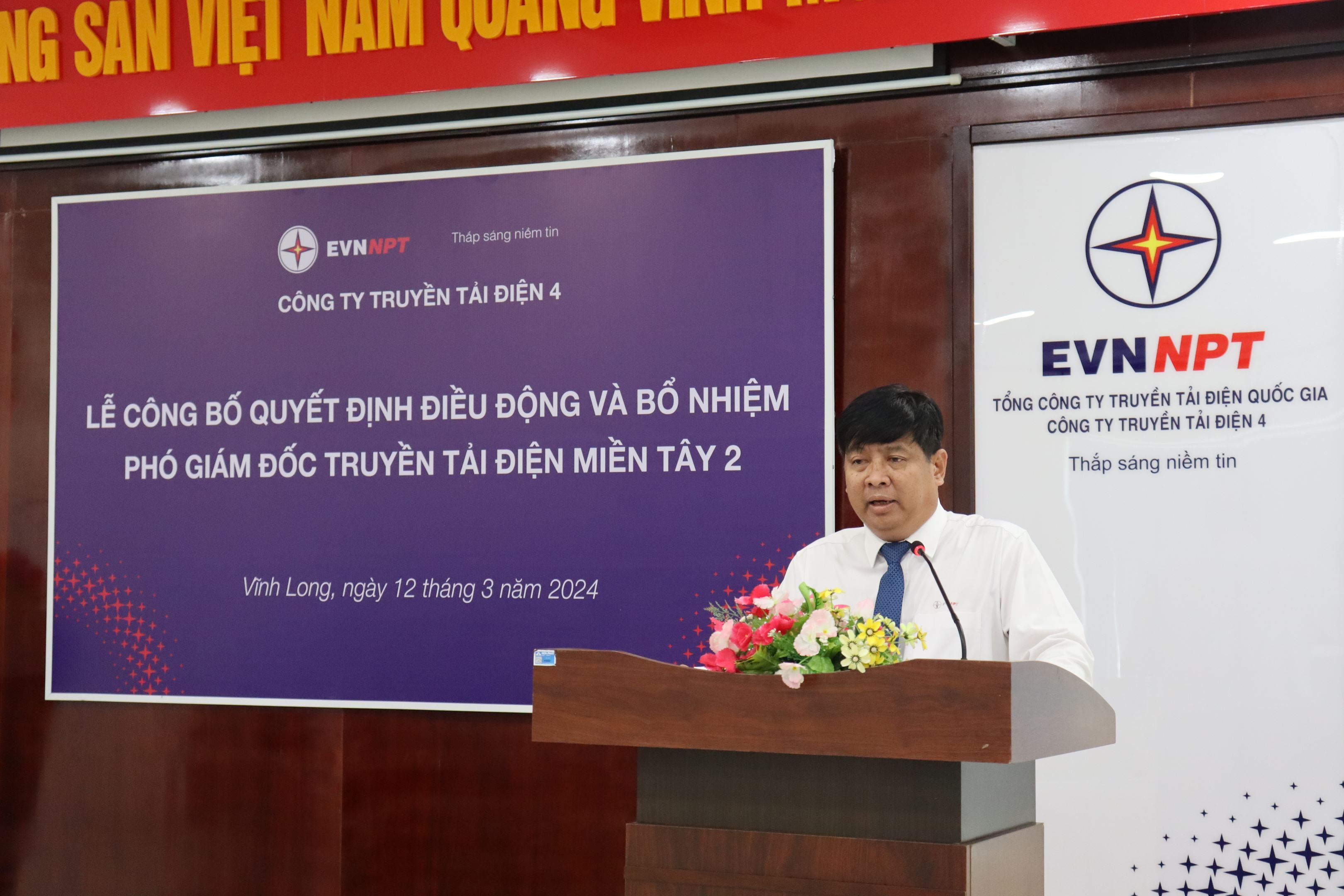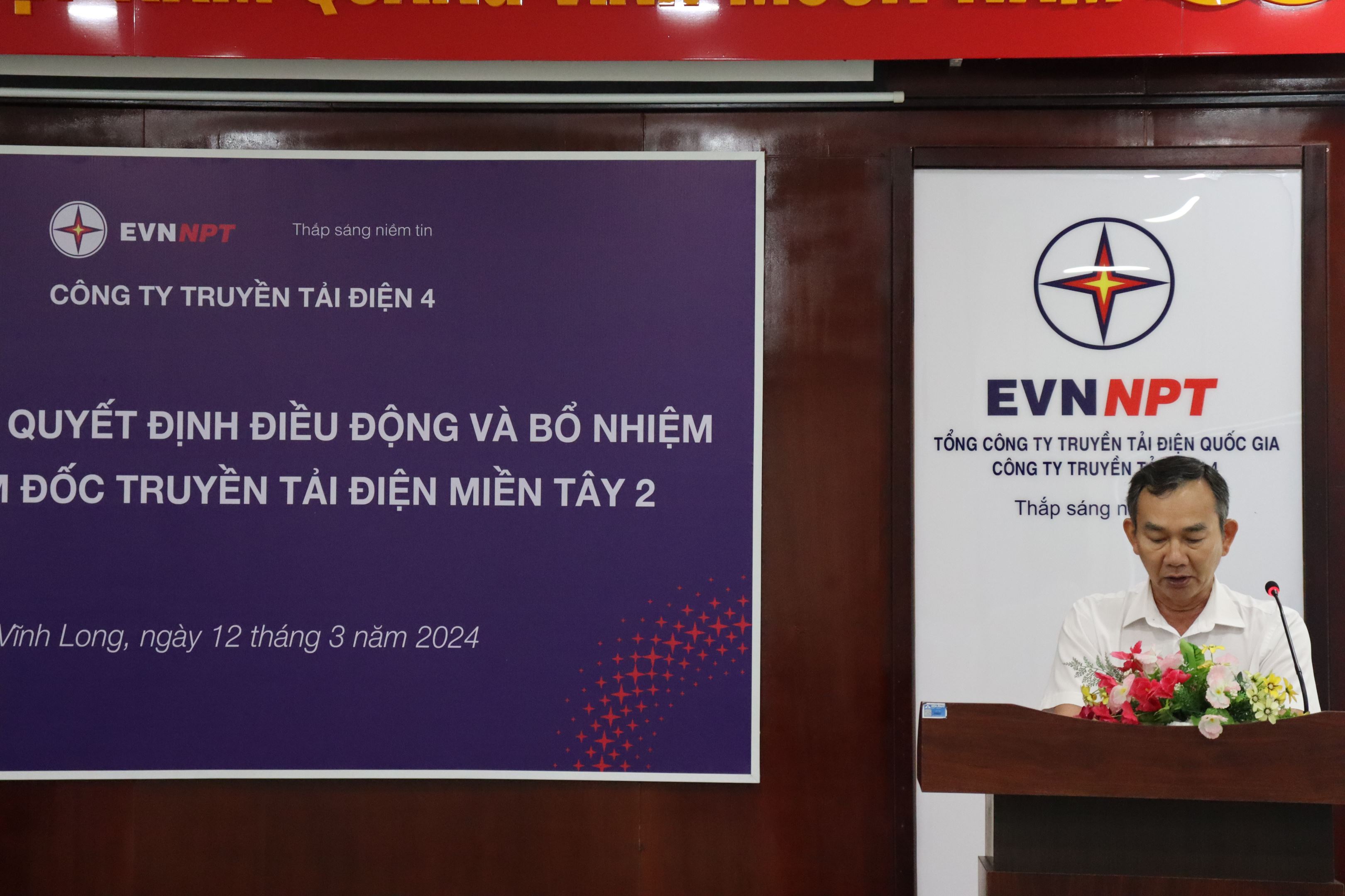 Đại diện Công ty Truyền tải điện 4, ông Huỳnh Thanh Sơn – Phó Phòng Tổ chức và Nhân sự công bố quyết định điều động và bổ nhiệm ông Trần Anh Dũng - Phó Giám đốc Truyền tải điện Thành phố Hồ Chí Minh đến giữ chức vụ Phó Giám đốc Truyền tải điện Miền Tây 2 kể từ ngày 08/3/2024.
