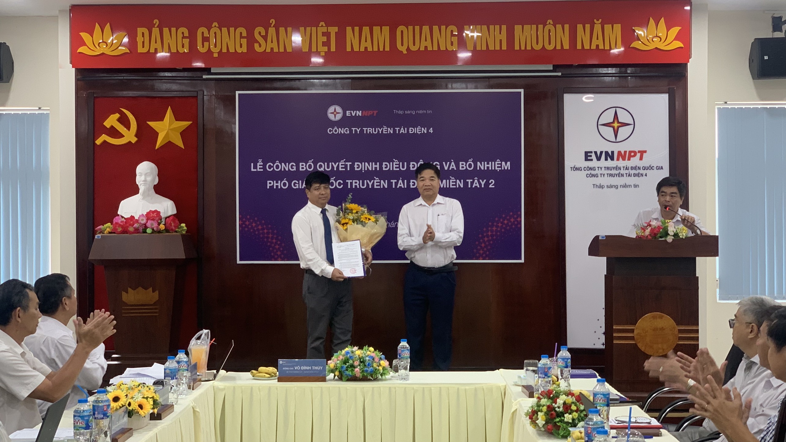 Ông Võ Đình Thủy – Bí thư Đảng ủy, Giám đốc Công ty Truyền tải điện 4 trao quyết định và tặng hoa chúc mừng ông Trần Anh Dũng.