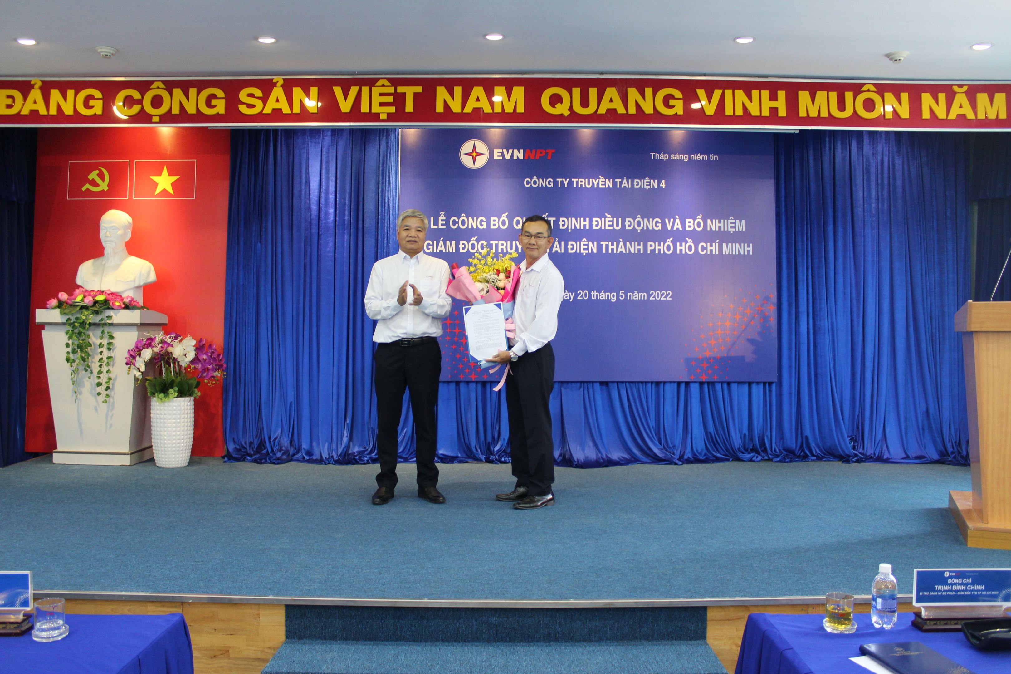 Đại diện Công ty Truyền tải điện 4, ông Đống Tiến Long – Phó phòng phụ trách phòng Tổ chức và Nhân sự công bố Quyết định số 3066/QĐ-PTC4 ngày 12/5/2022 của Công ty Truyền tải điện 4 về việc điều động và bổ nhiệm ông Trịnh Đình Chính – Giám đốc TTĐ miền Đông 1 đến giữ chức vụ Giám đốc TTĐ Tp Hồ Chí Minh kể từ ngày 20/5/2022. Thời gian giữ chức vụ là 5 năm.