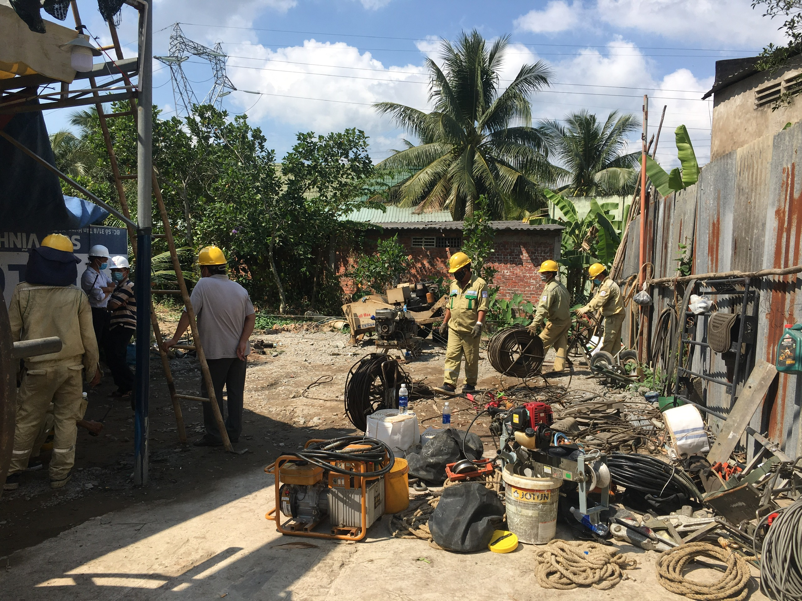 Công nhân Đội TTĐ Cai Lậy –TTĐMT2 lắp dựng dàn giáo đỡ dây vượt qua các khu nhà máy xay xát.