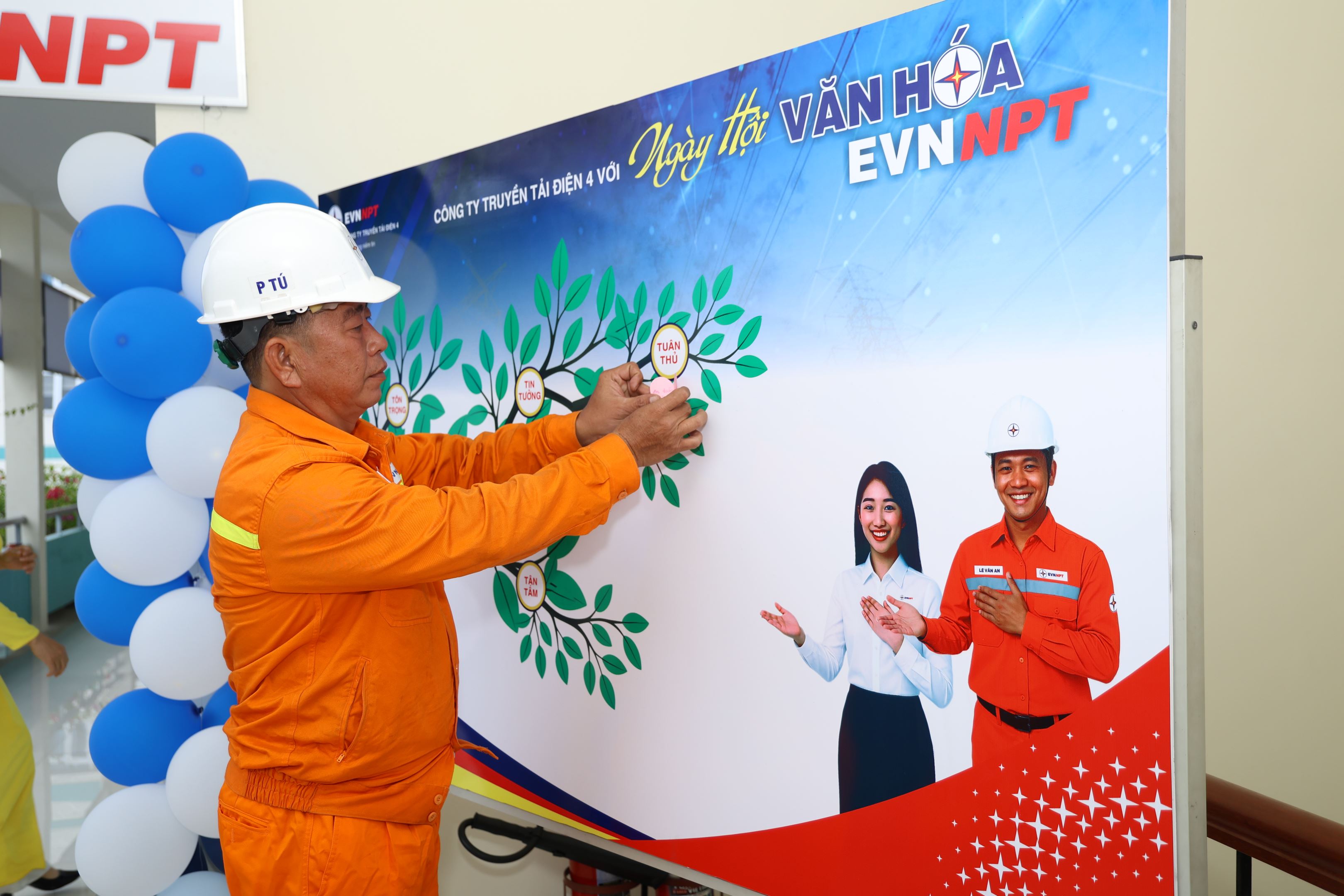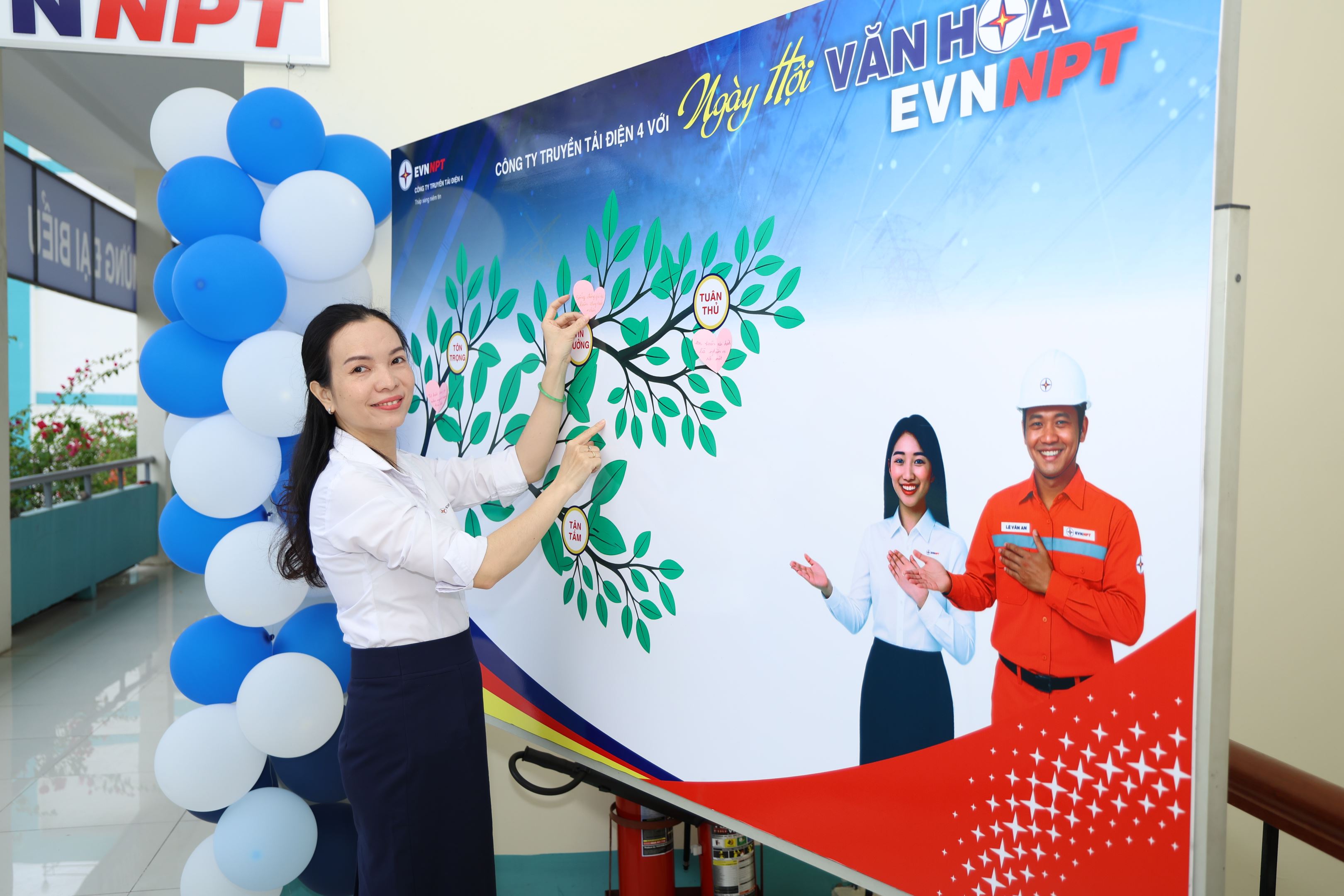 Không gian ngày hội được bố trí sinh động với những khu vực trưng bày hình ảnh, mô hình minh họa và đặc biệt là “cây thông điệp” – một điểm nhấn thu hút sự tham gia của đông đảo CBCNV. Cây được thiết kế như một thân cây tượng trưng cho giá trị văn hóa EVNNPT, với những tán lá là những thẻ giấy nhiều màu. CBCNV tham dự ngày hội sẽ tự tay viết hoặc lựa chọn những câu nói, cam kết hay thông điệp về “Trách nhiệm” rồi gắn lên cây. Mỗi tấm thẻ là một suy nghĩ, một lời nhắc nhở và cũng là một lời hứa nghề nghiệp, góp phần tạo nên một “cây xanh trách nhiệm” sống động – nơi phản chiếu tinh thần chung của tập thể PTC4 trong việc nuôi dưỡng và lan tỏa các giá trị cốt lõi.