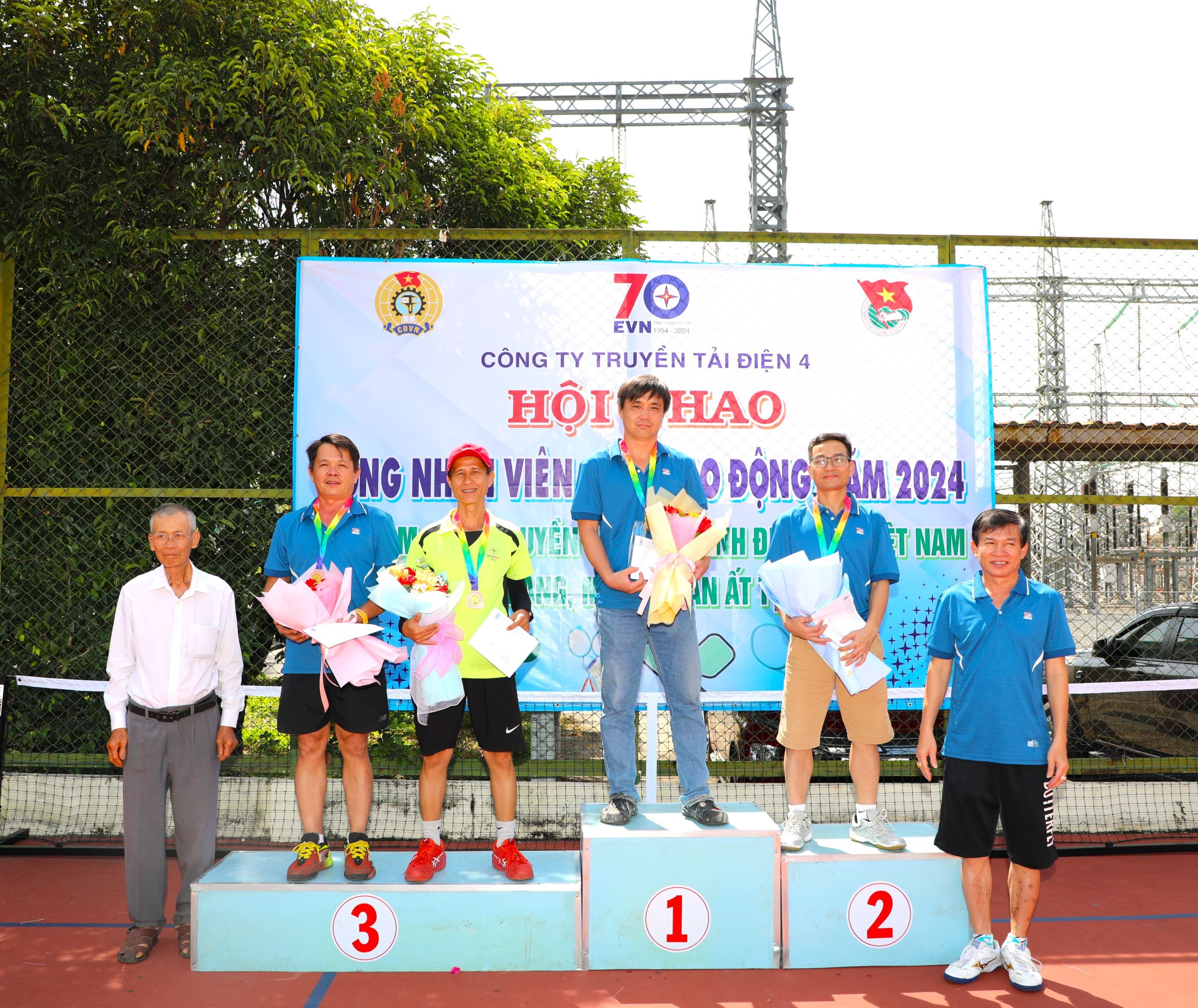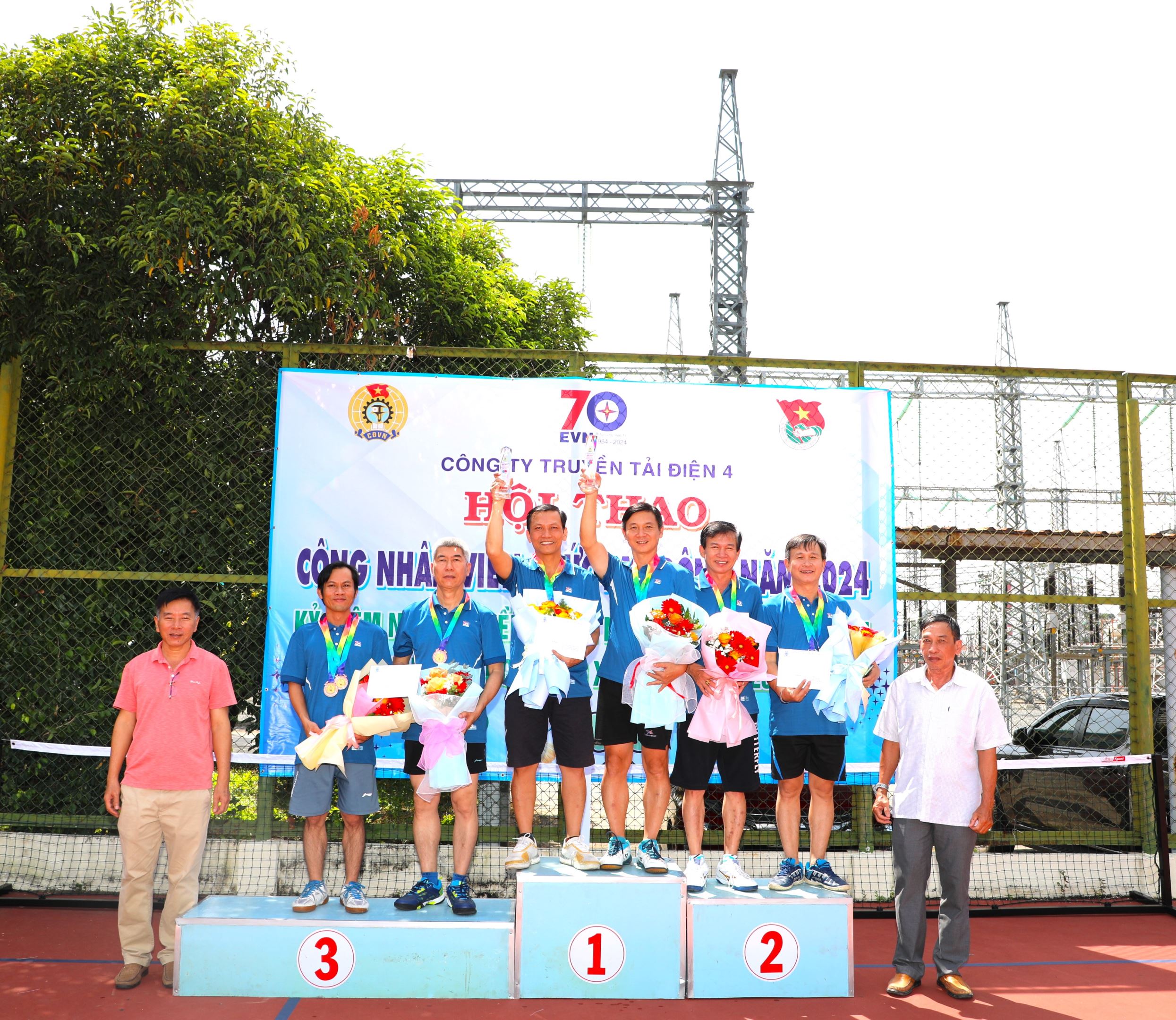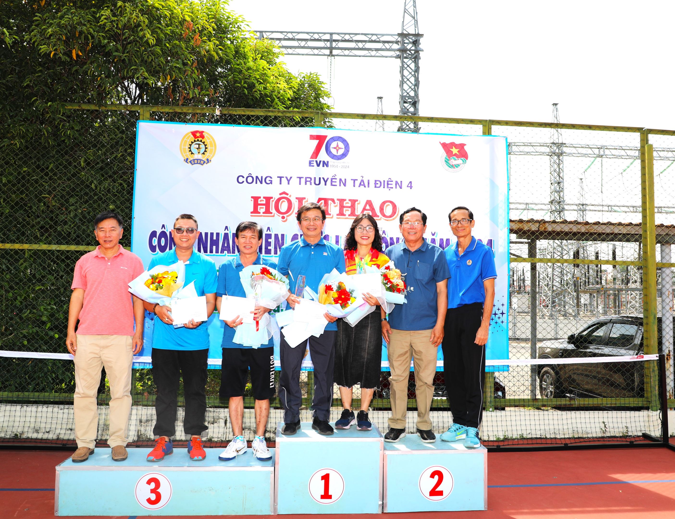 Ông Nguyễn Văn Lâm, nguyên Chủ tịch Công đoàn Công ty, ông Nguyễn Văn Bảy, Phó Giám đốc Công ty và ông Bùi Văn Hoàng, Giám đốc Truyền tải điện miền Đông 2 trao giải đôi nam Pickleball.