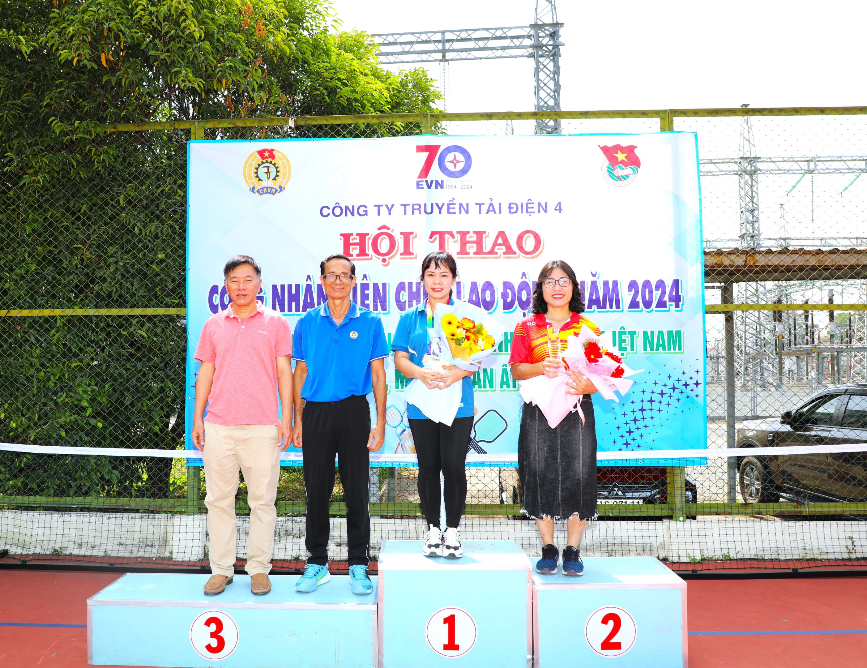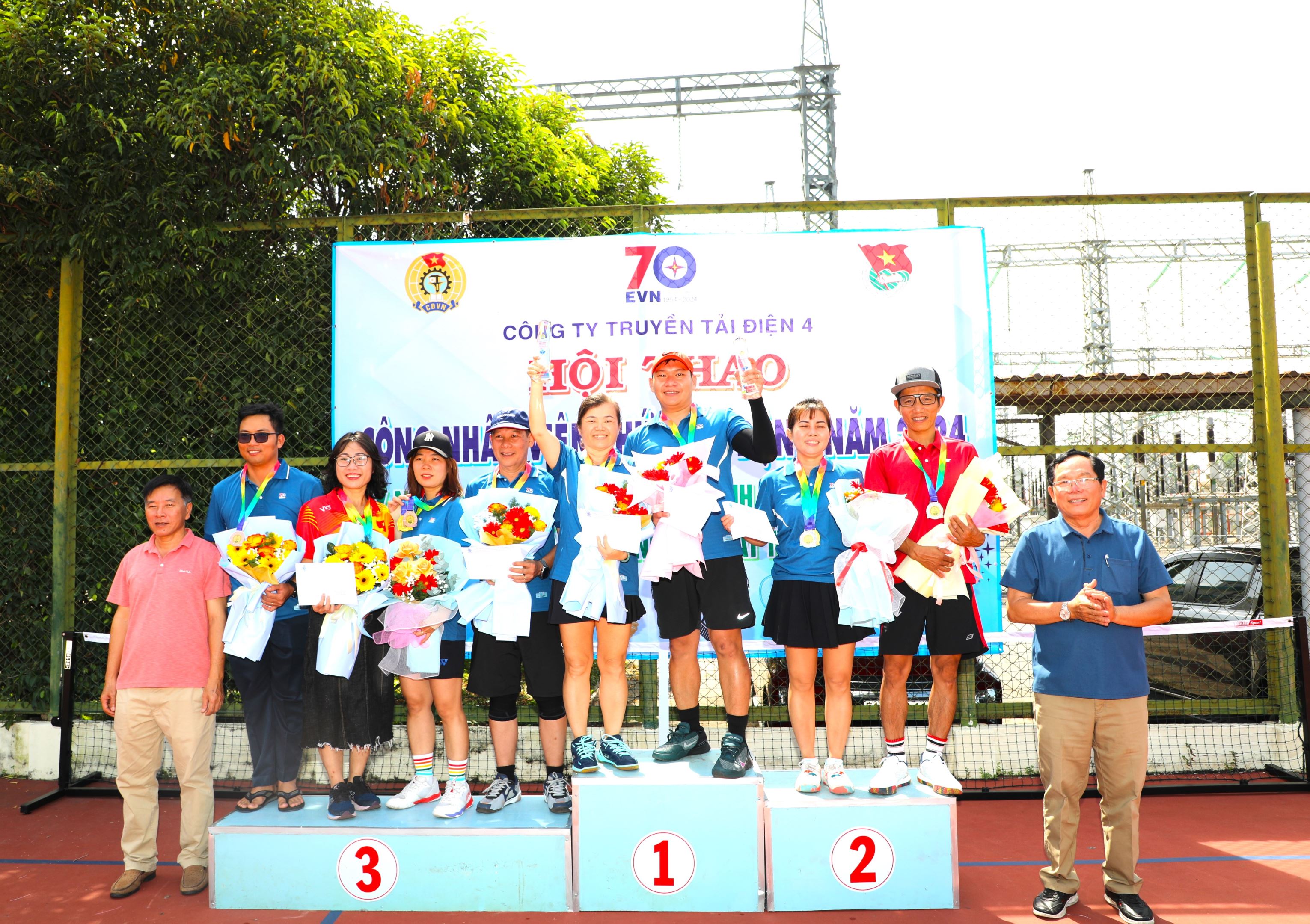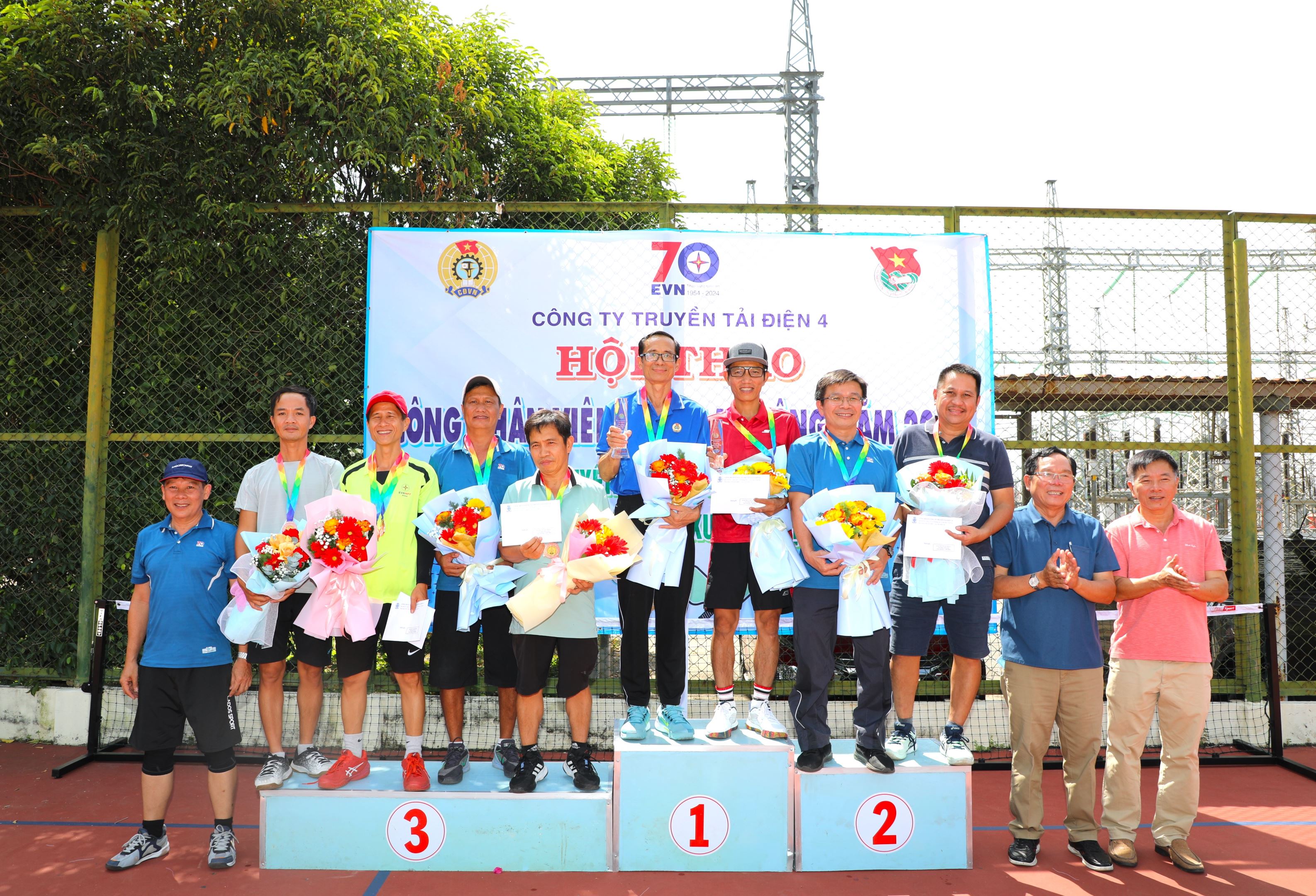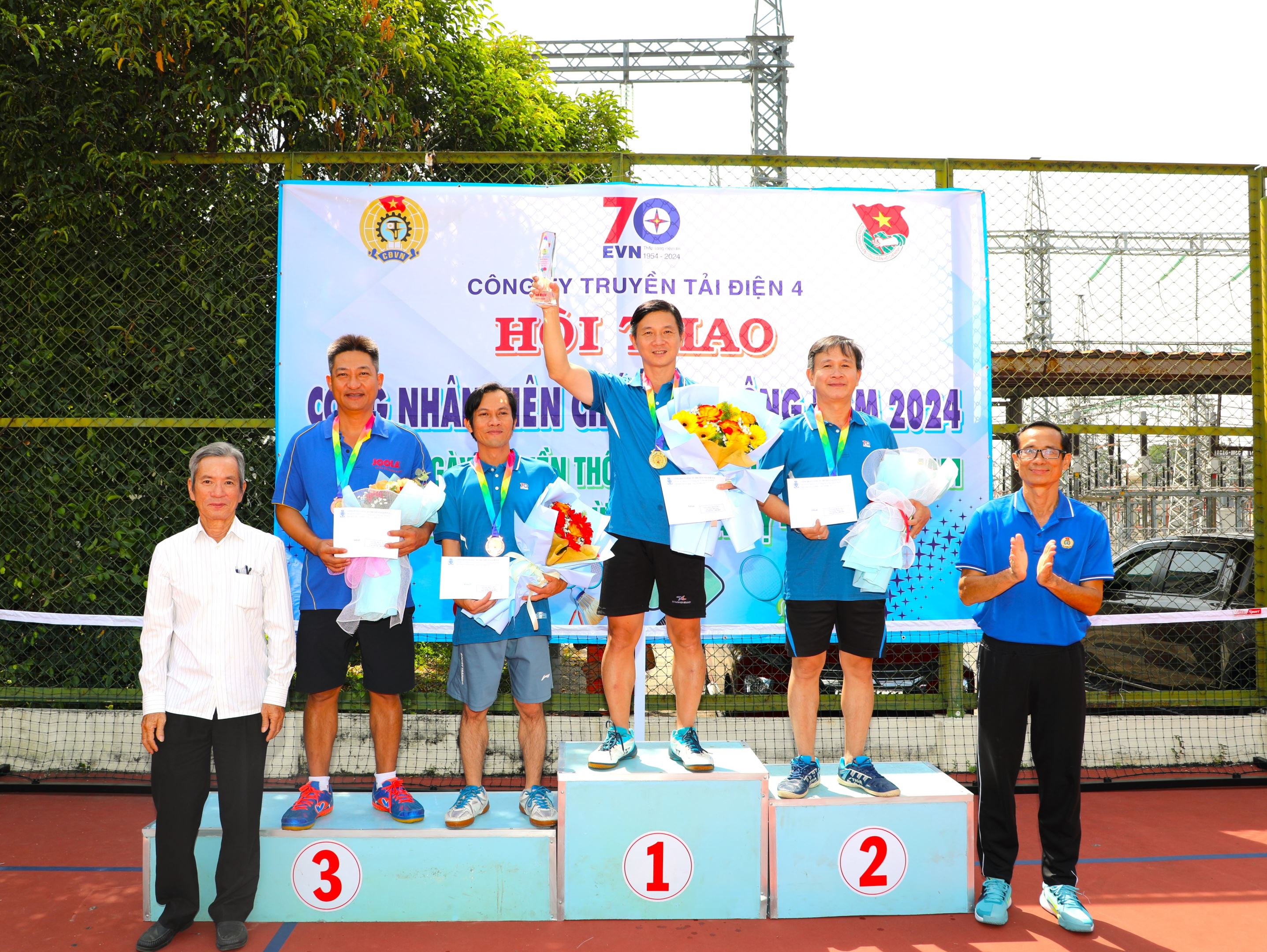 Ông Nguyễn Văn Lâm, nguyên Chủ tịch Công đoàn Công ty, ông Nguyễn Văn Bảy, Phó Giám đốc Công ty và ông Bùi Văn Hoàng, Giám đốc Truyền tải điện miền Đông 2 trao giải đôi nam Pickleball.