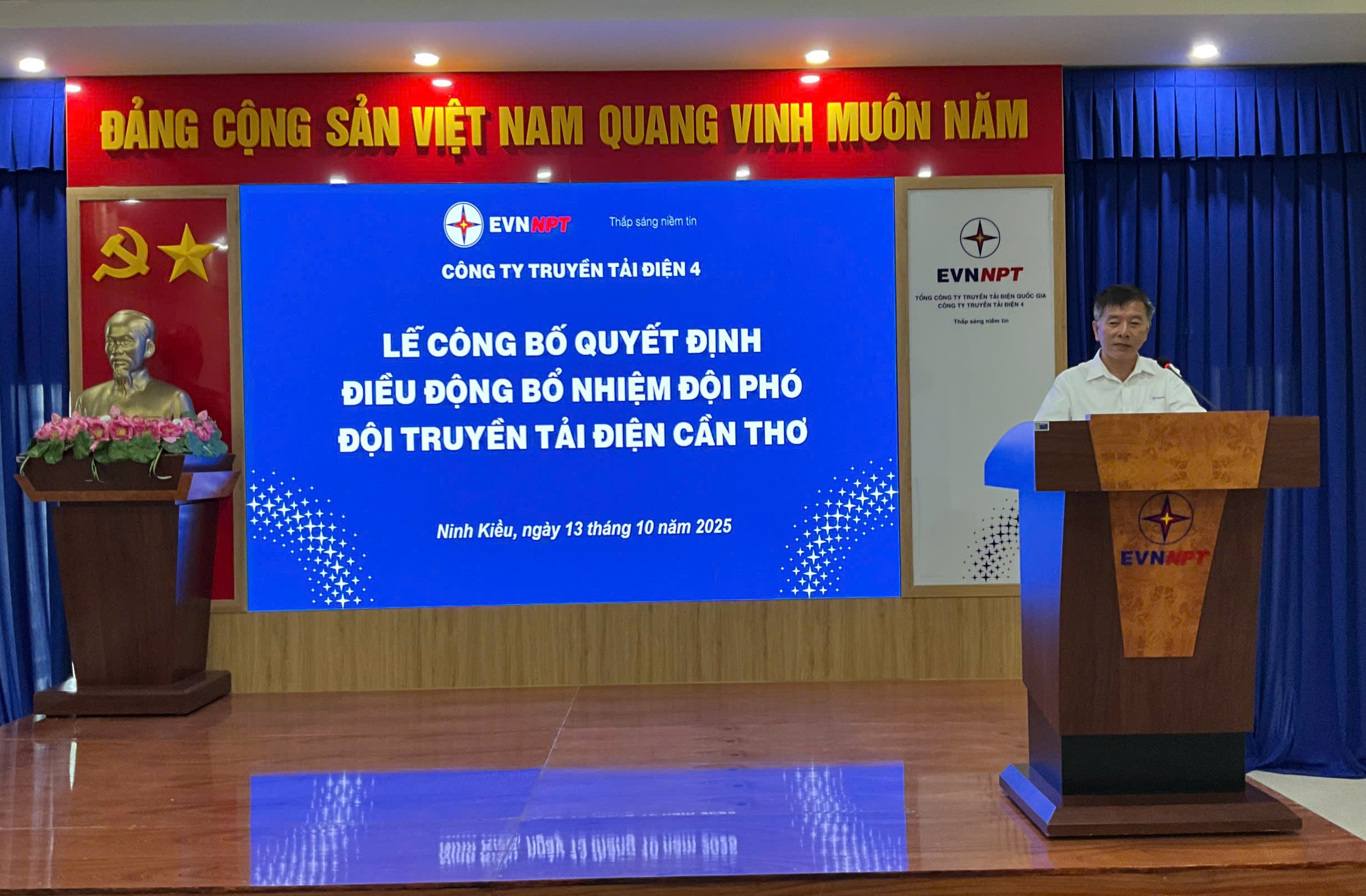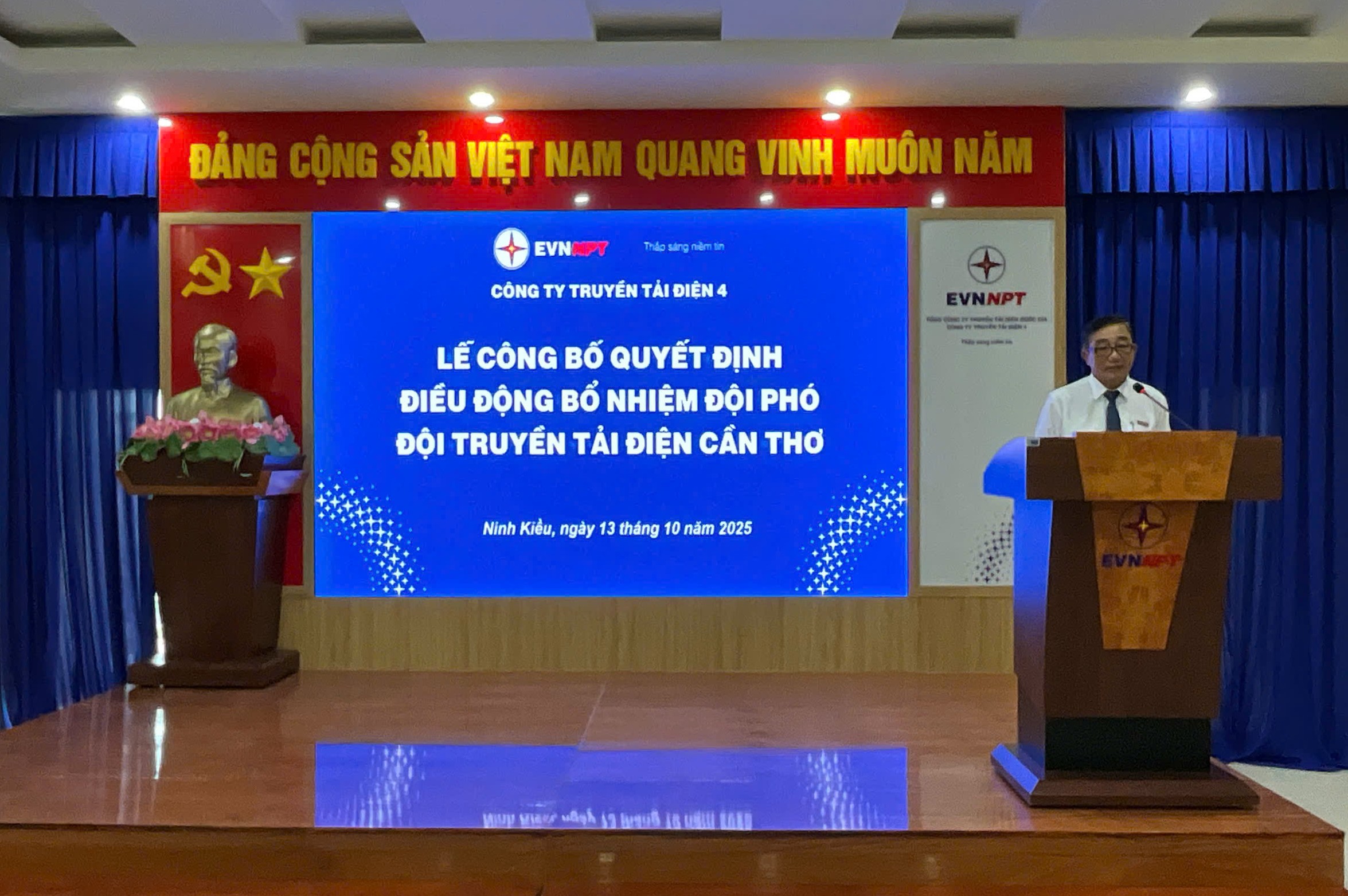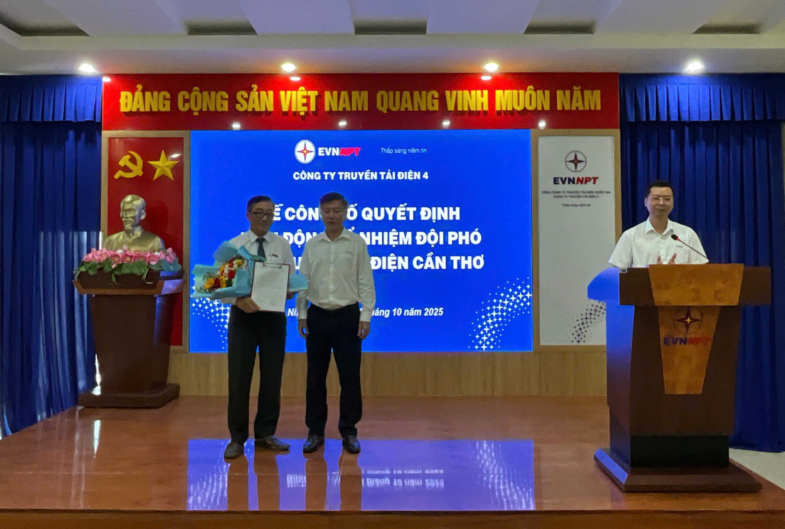 Tại buổi lễ, ông Đống Tiến Long – Trưởng phòng Tổ chức & Nhân sự Công ty Truyền tải điện 4, đã công bố Quyết định số 2992/QĐ-PTC4 ngày 09/10/2025 của Công ty Truyền tải điện 4 về việc điều động, bổ nhiệm ông Châu Sóc Kha – hiện là Đội phó Đội Truyền tải điện Vĩnh Long – giữ chức vụ Đội phó Đội Truyền tải điện Cần Thơ.