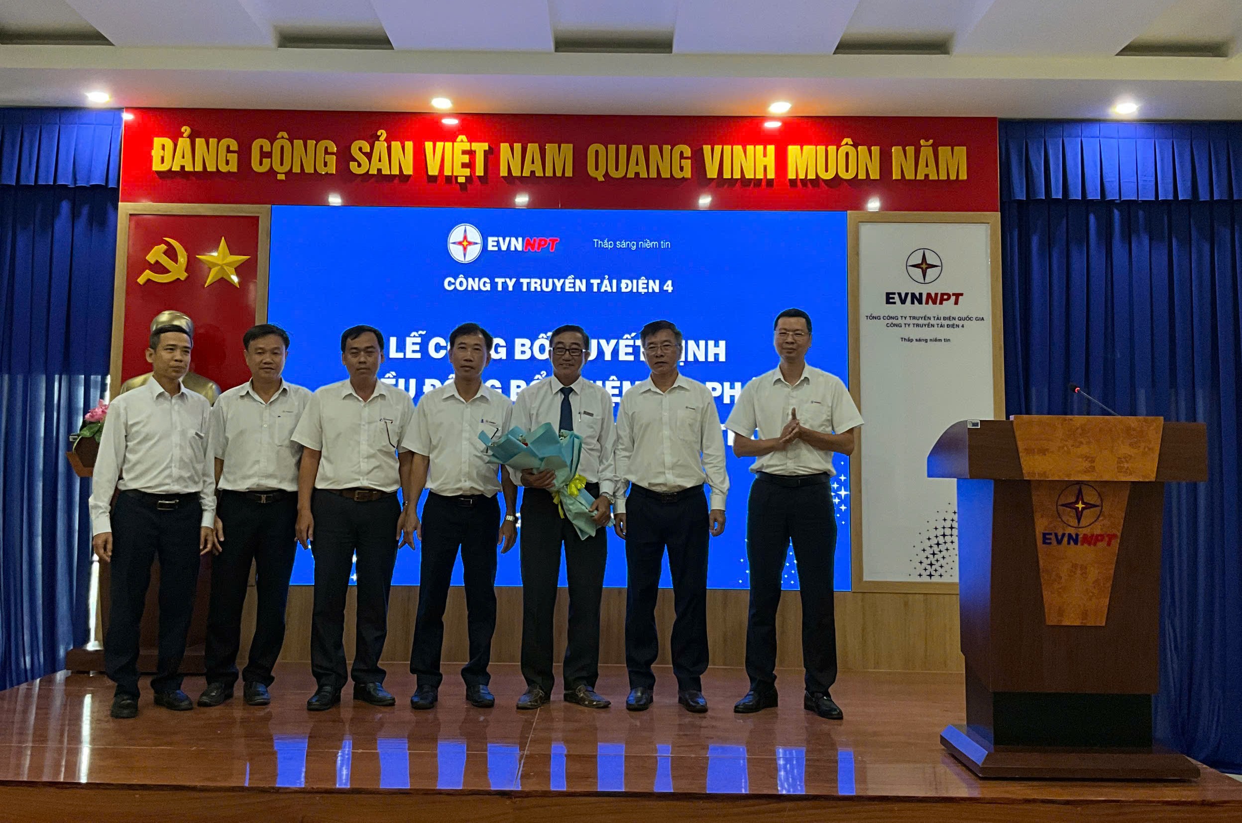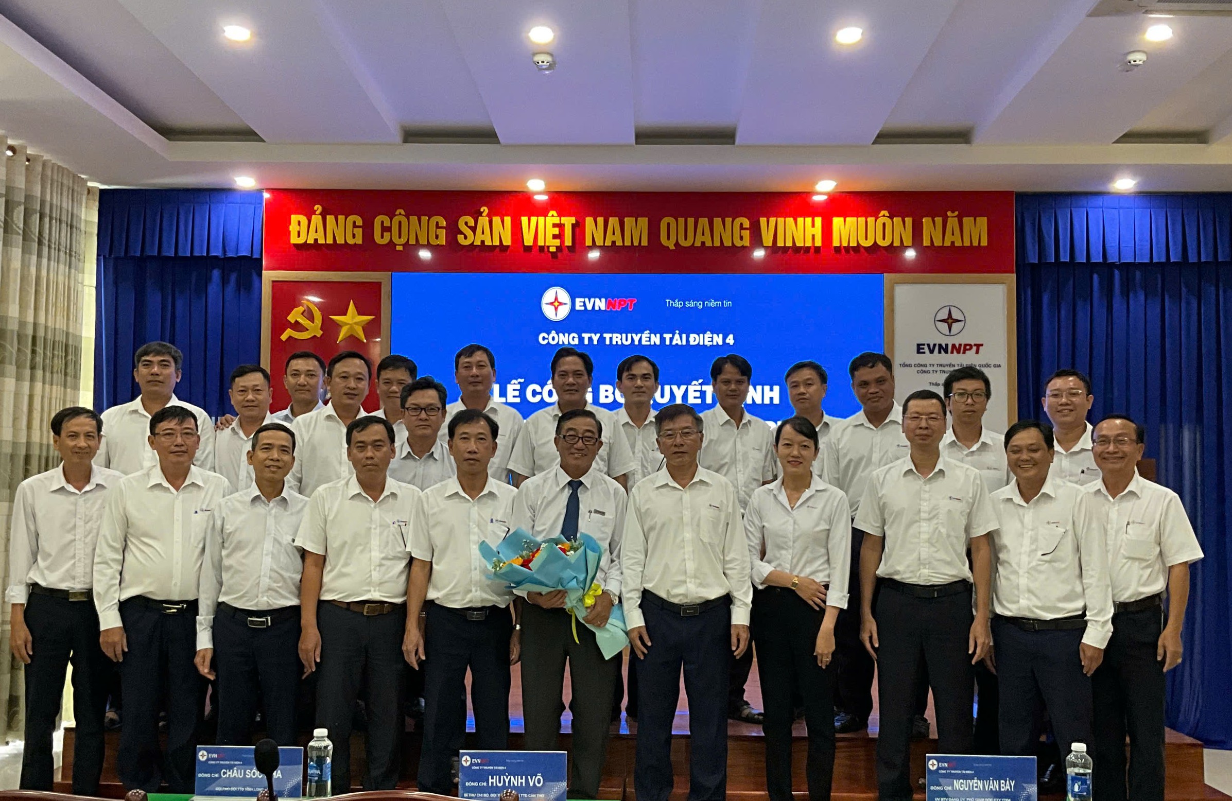 Ông Nguyễn Văn Bảy, Ủy viên Thường vụ Đảng Ủy, Phó Giám đốc Công ty Truyền tải điện 4 (đứng bên phải) trao Quyết định điều động, bổ nhiệm Đội Phó Đội Truyền tải điện Cần Thơ cho ông Châu Sóc Kha