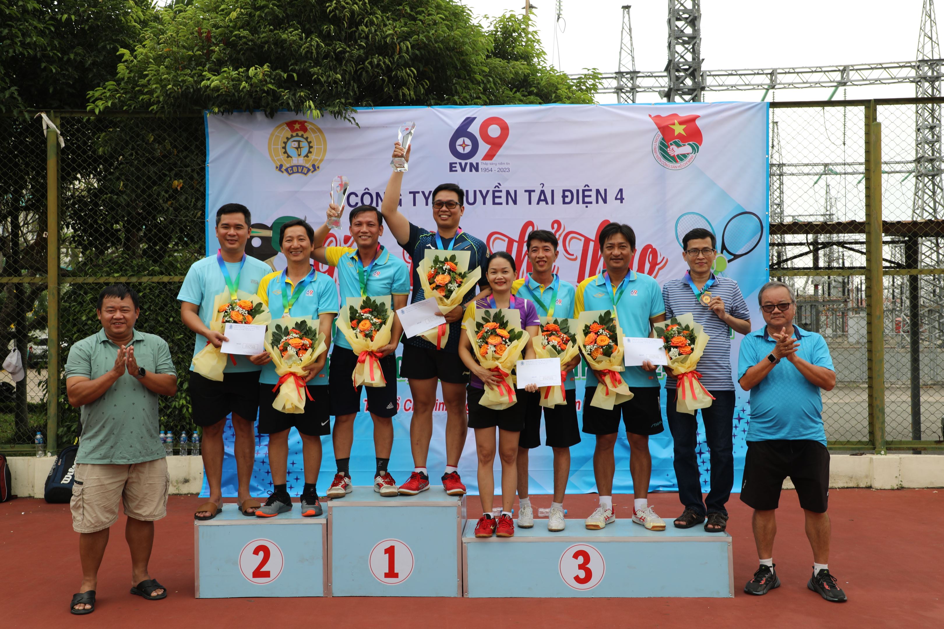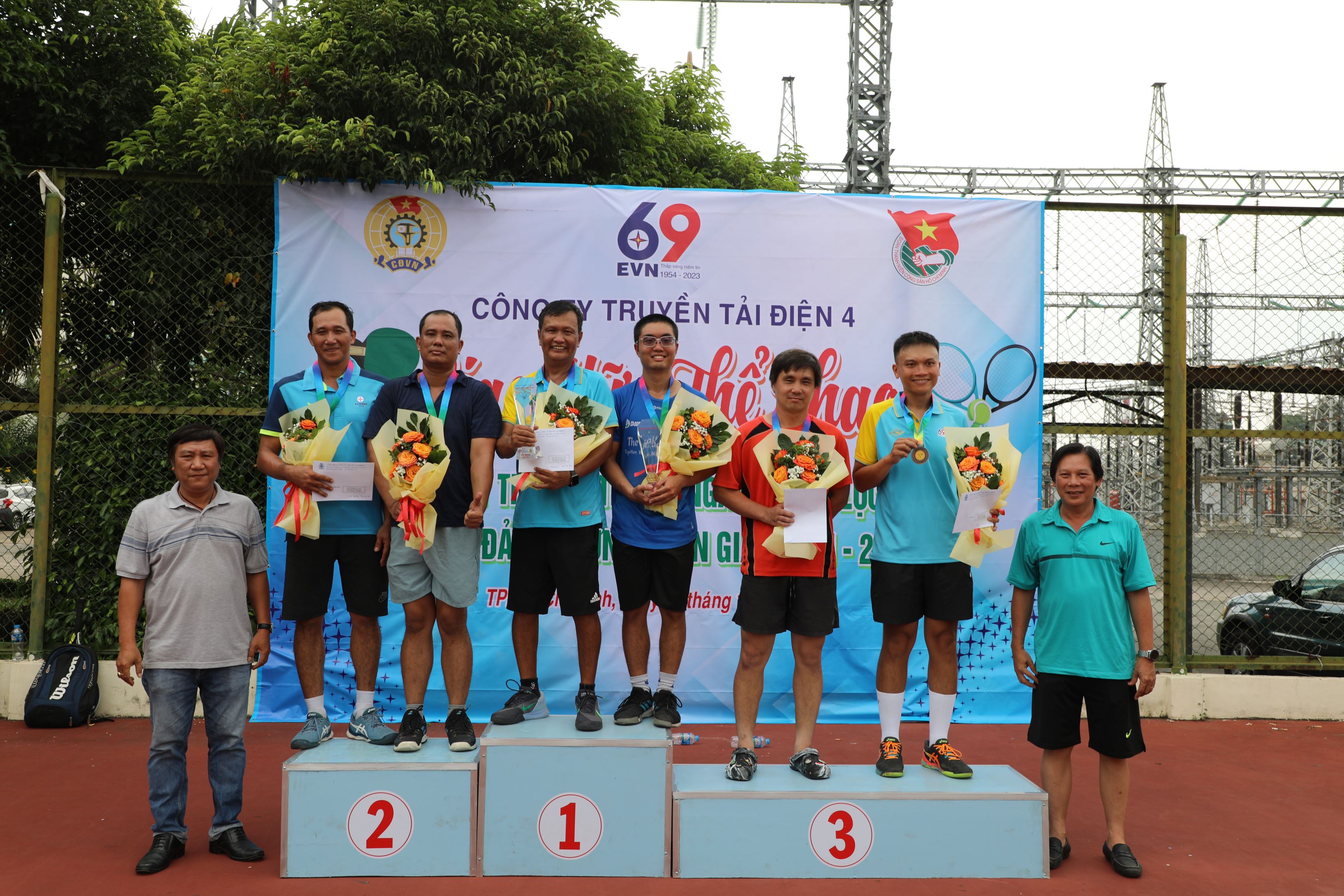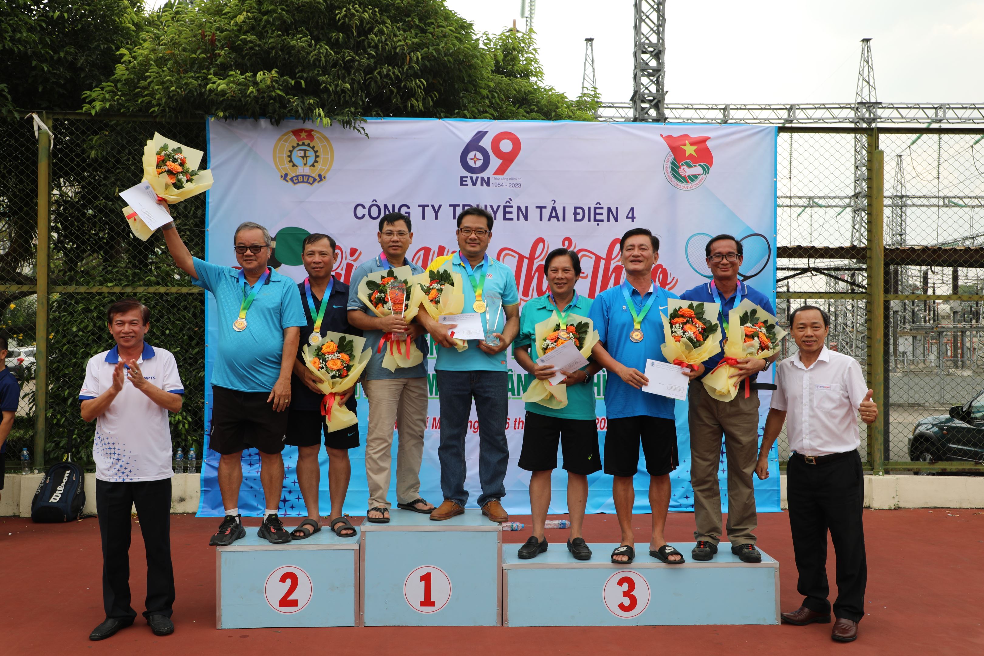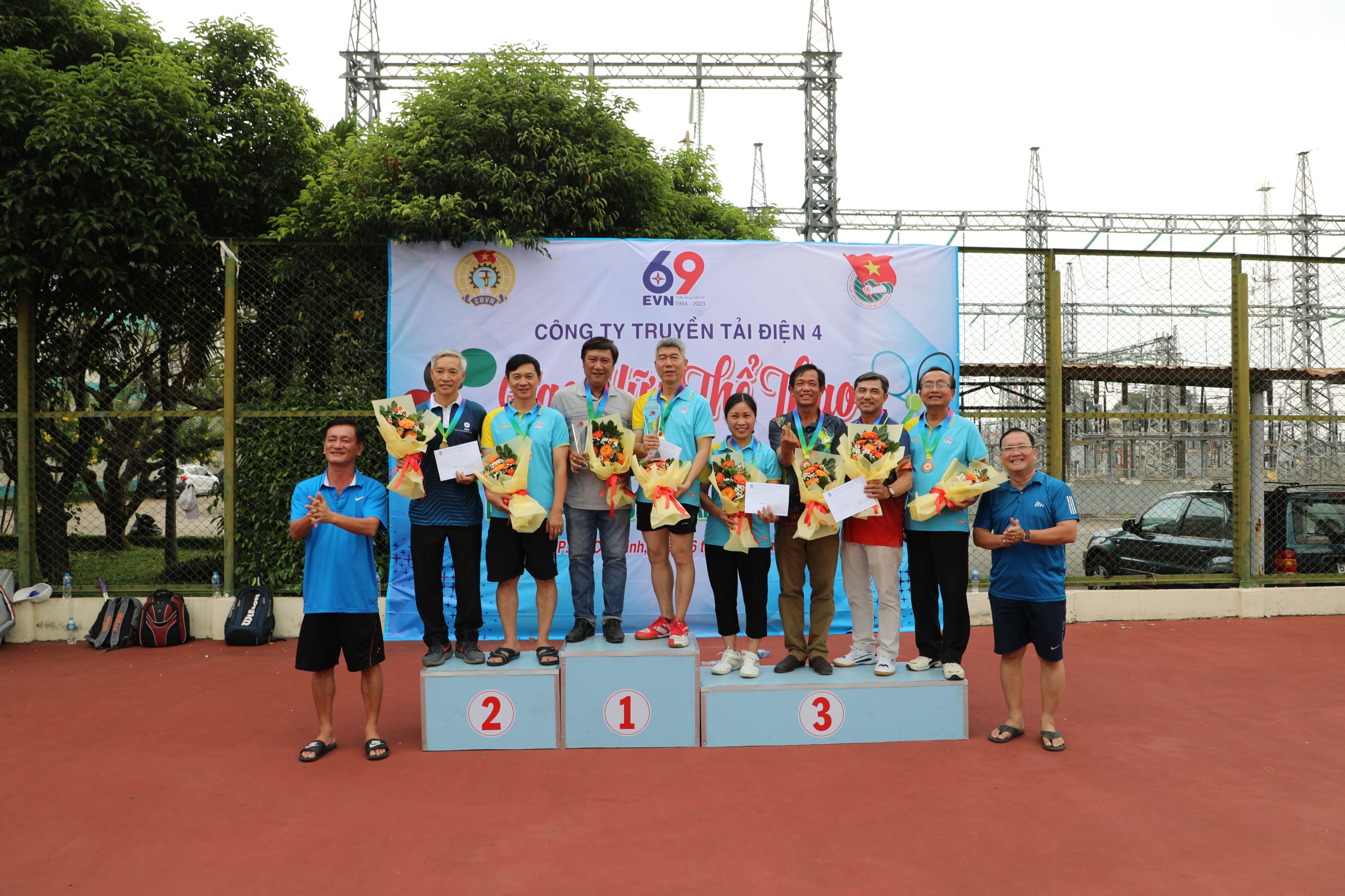 Ông Bùi Văn Hoàng, Giám đốc Truyền tải điện miền Đông 2 và Ông Hà Quang Đức, Chủ tịch Công đoàn Trung tâm Dịch vụ Kỹ thuật 4 trao cúp và huy chương cho Quần vợt Đôi dưới 45 tuổi.