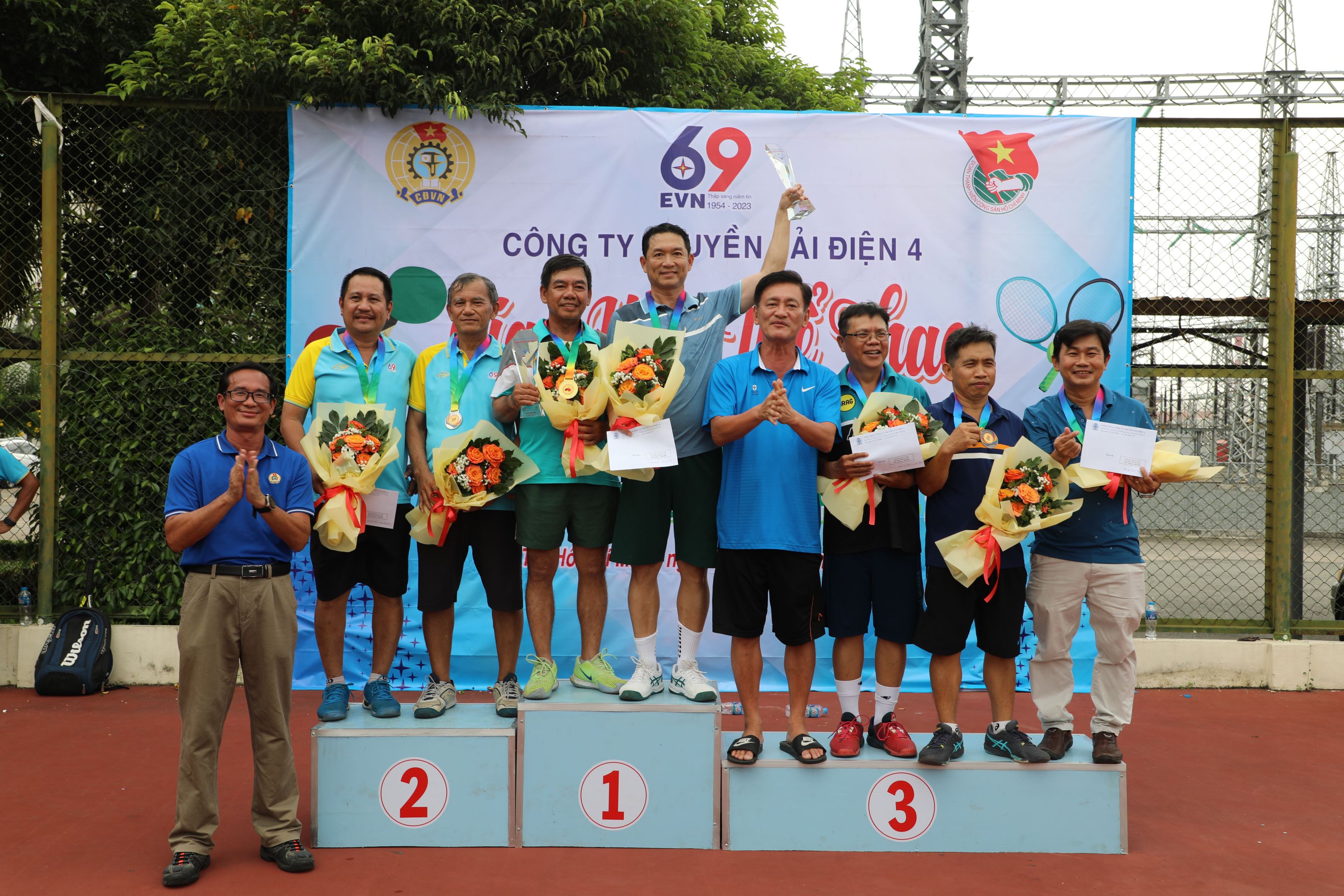 Ông Nguyễn Song Toàn, Phó Giám đốc Công ty Điện lực Thủ Đức và Ông Nguyễn Duy Trung, Giám đốc Trung tâm Dịch vụ Kỹ thuật 4 trao cúp và huy chương cho Quần vợt Đôi Lãnh đạo