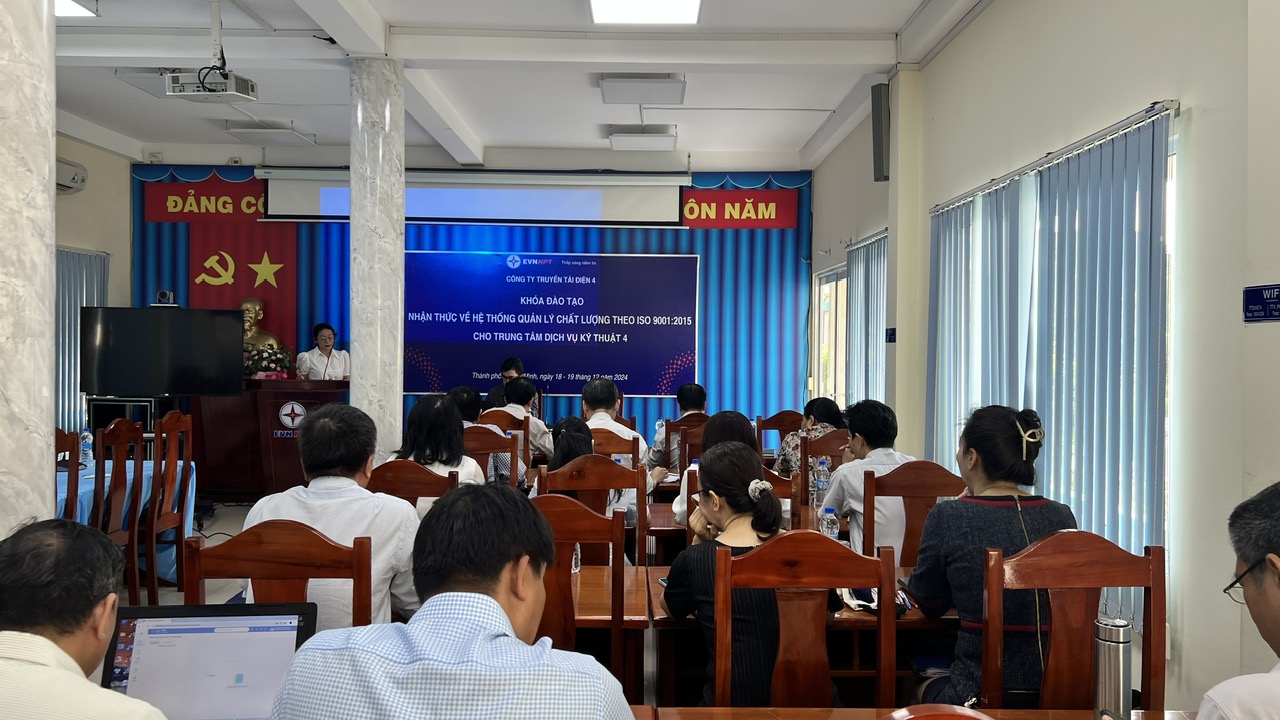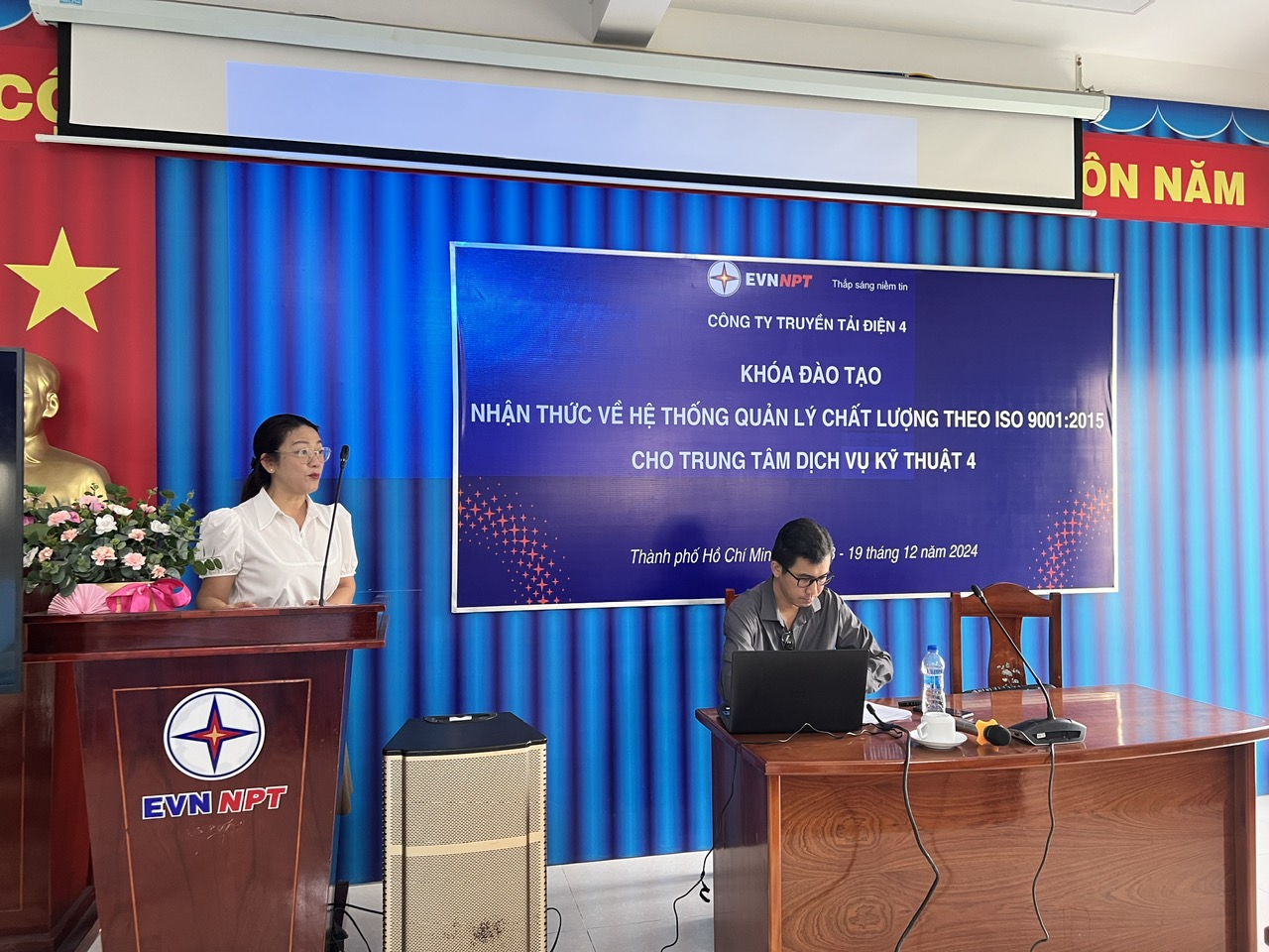 Phát biểu tại khóa đào tạo, Bà Nguyễn Thị Mộng Hà – Phó Chánh Văn phòng Công ty cho biết từ năm 2017 Công ty Truyền tải điện 4 (PTC4) đã triển khai xây dựng hệ thống quản lý chất lượng ISO 9001:2015. Hằng năm, Công ty đều có các cuộc đánh giá nội bộ để duy trì và cải tiến hệ thống chất lượng theo tiêu chuẩn quốc tế ISO 9001:2015. Do Trung tâm DVKT4 là đơn vị vừa mới sáp nhập trở lại Công ty Truyền tải điện 4 và để hiểu rõ hệ thống quản lý chất lượng ISO 9001:2015 cũng như trên nguyên tắc thống nhất đồng bộ với hệ thống quản lý chất lượng ISO mà Công ty đang áp dụng, Công ty đã tổ chức khóa đào tạo này nhằm trang bị kiến thức về tiêu chuẩn ISO 9001:2015 cho Ban Giám đốc và CBCNV Trung tâm hiểu rõ, nắm vững và triển khai thực hiện thật tốt.