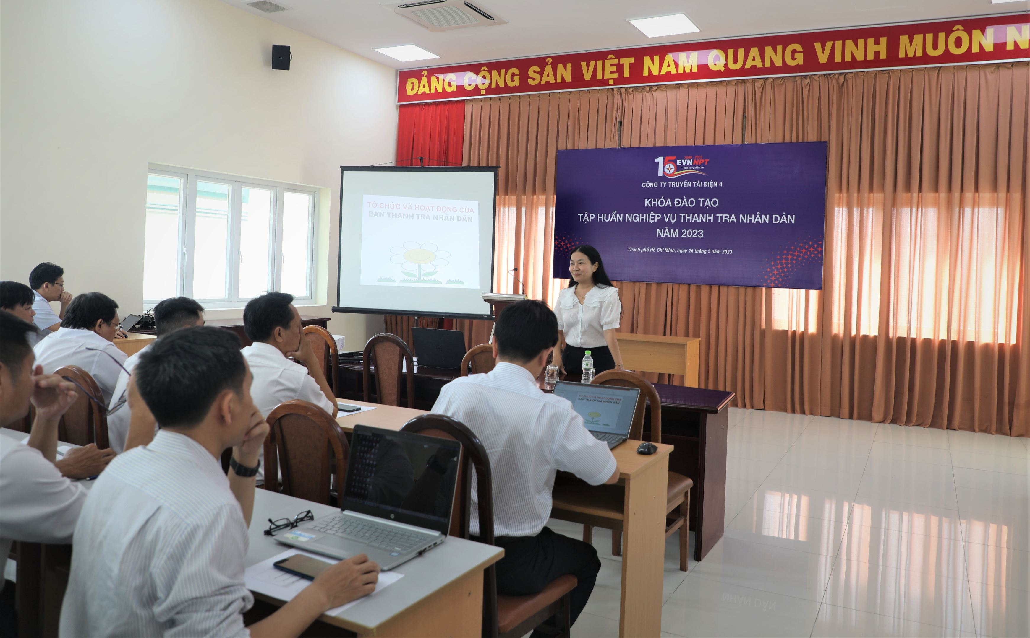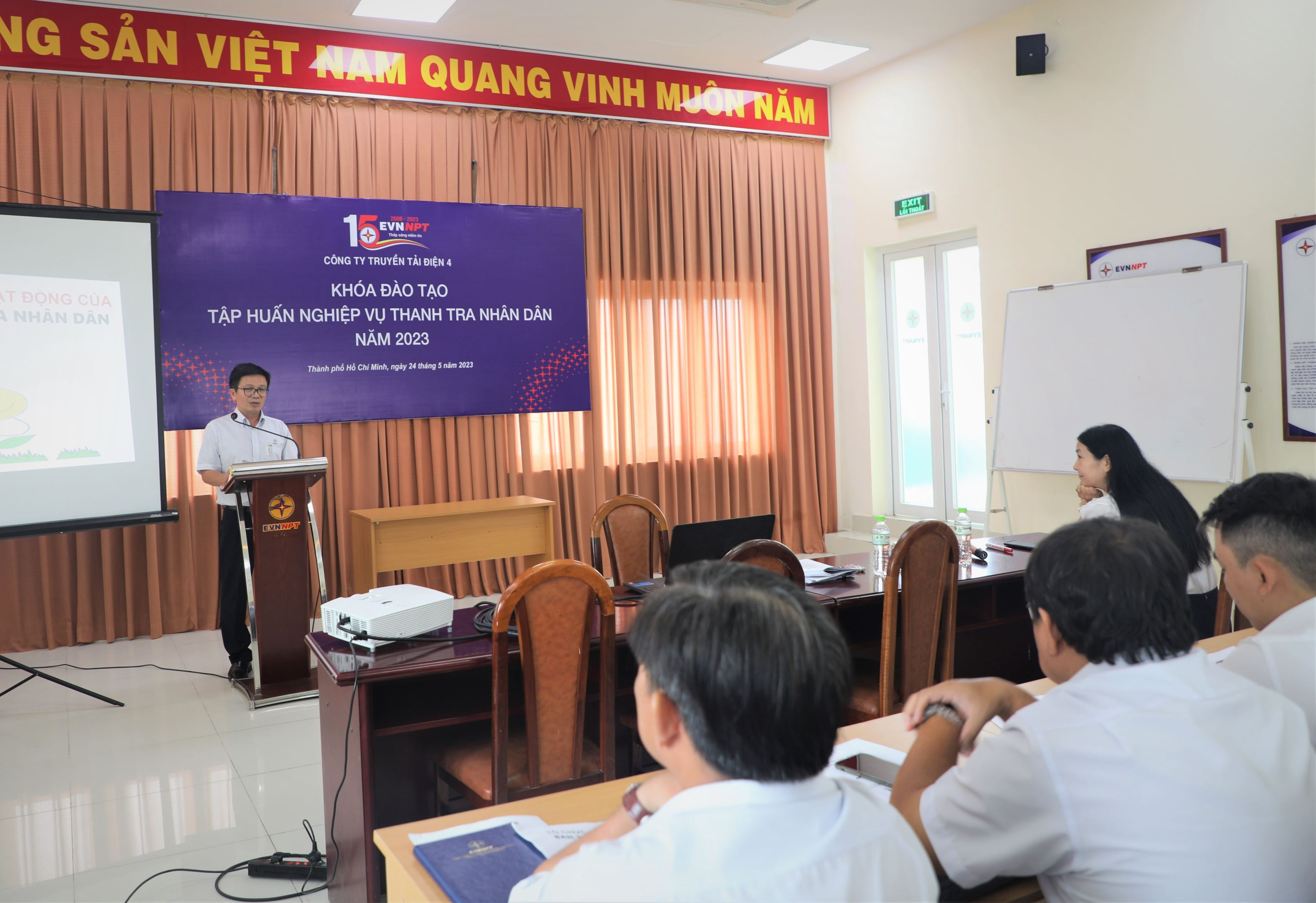 Thực hiện theo Kế hoạch đào tạo của Công ty Truyền tải điện 4 và Chương trình công tác công đoàn năm 2023, Công đoàn Công ty Truyền tải điện 4 đã phối hợp với Chuyên môn tổ chức tập huấn nghiệp vụ Thanh tra nhân dân cho các Ủy viên Thanh tra nhân dân Công ty và 6 Truyền tải điện trực thuôc. Đại diện Công đoàn Công ty Ông Dương Văn Tâm, UVTV Công đoàn, Trưởng Ban Thanh tra nhân dân Công ty phát biểu khai mạc lớp tập huấn. Giảng viên tham gia giảng dạy là Thạc sỹ Nguyễn Huỳnh Kiên Trúc, Phó Chánh Văn phòng Thanh tra Thành phố Hồ Chí Minh.