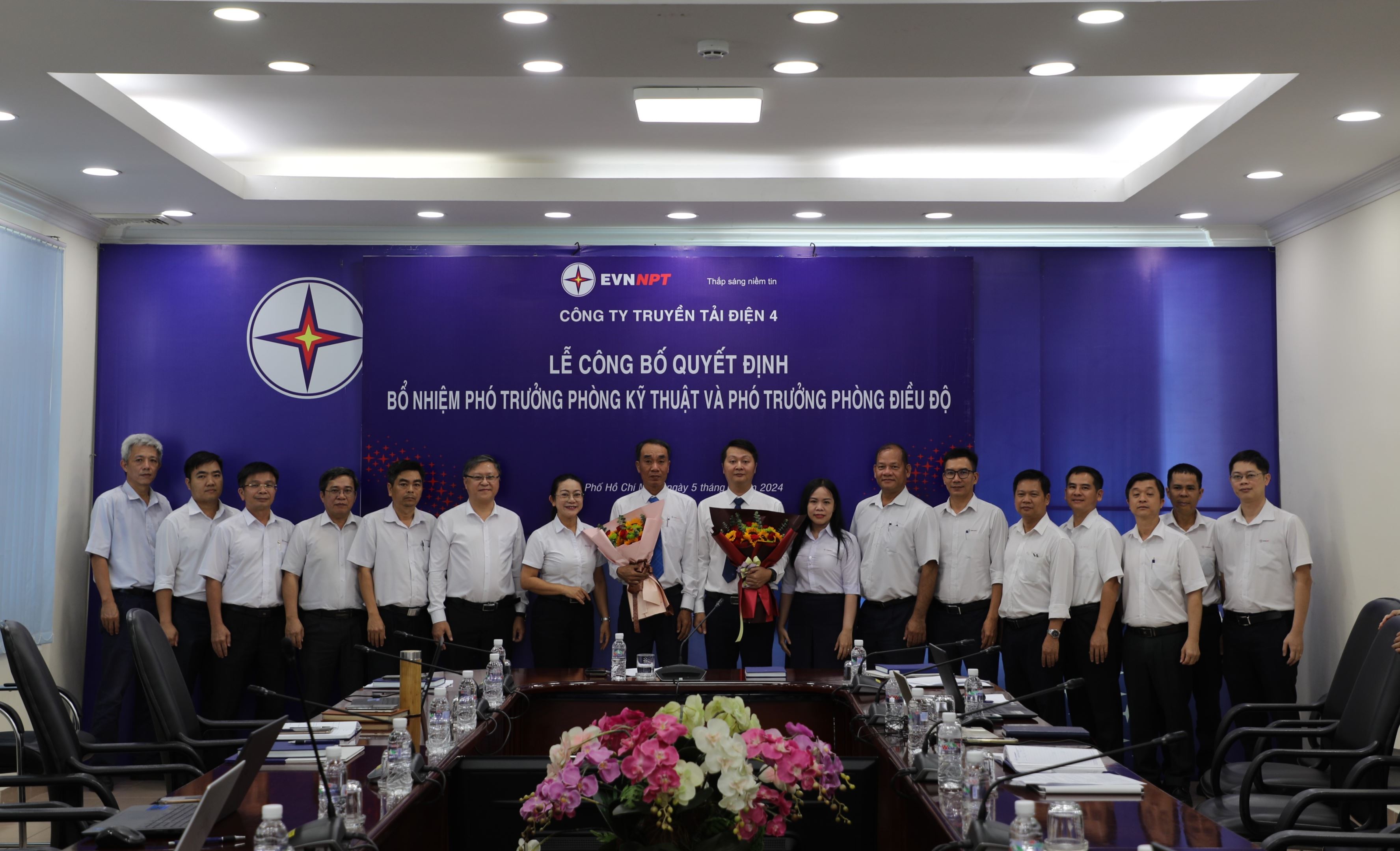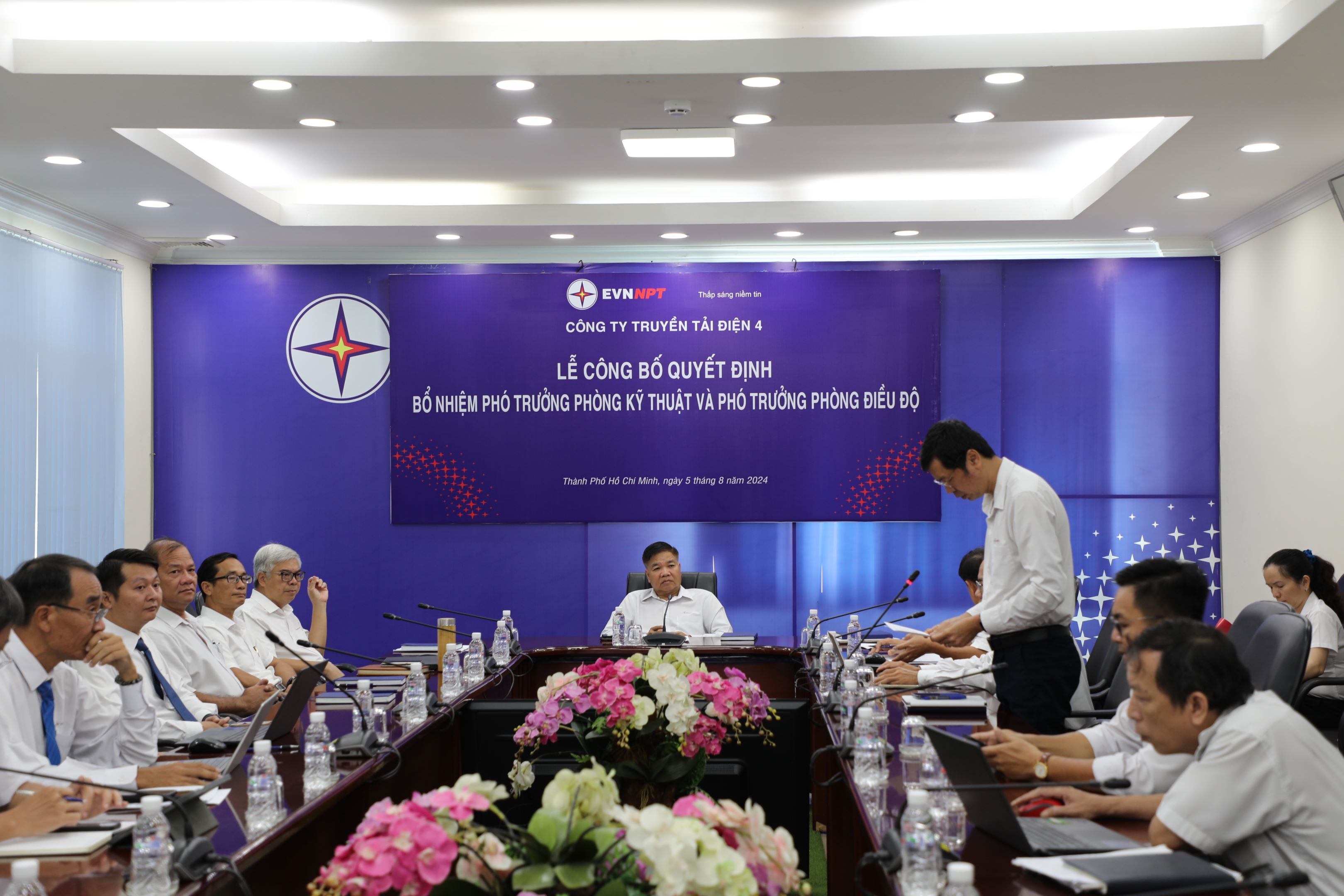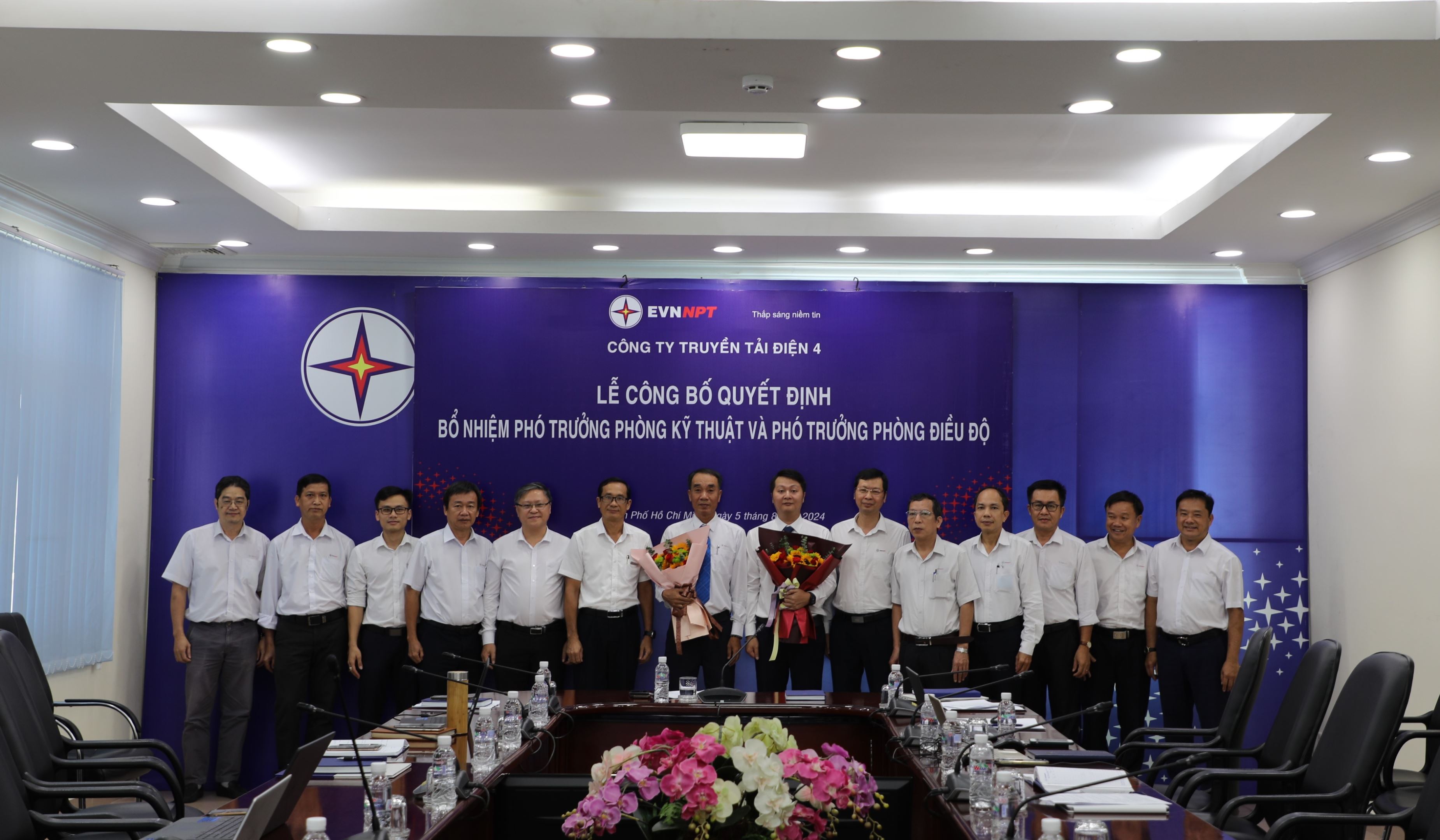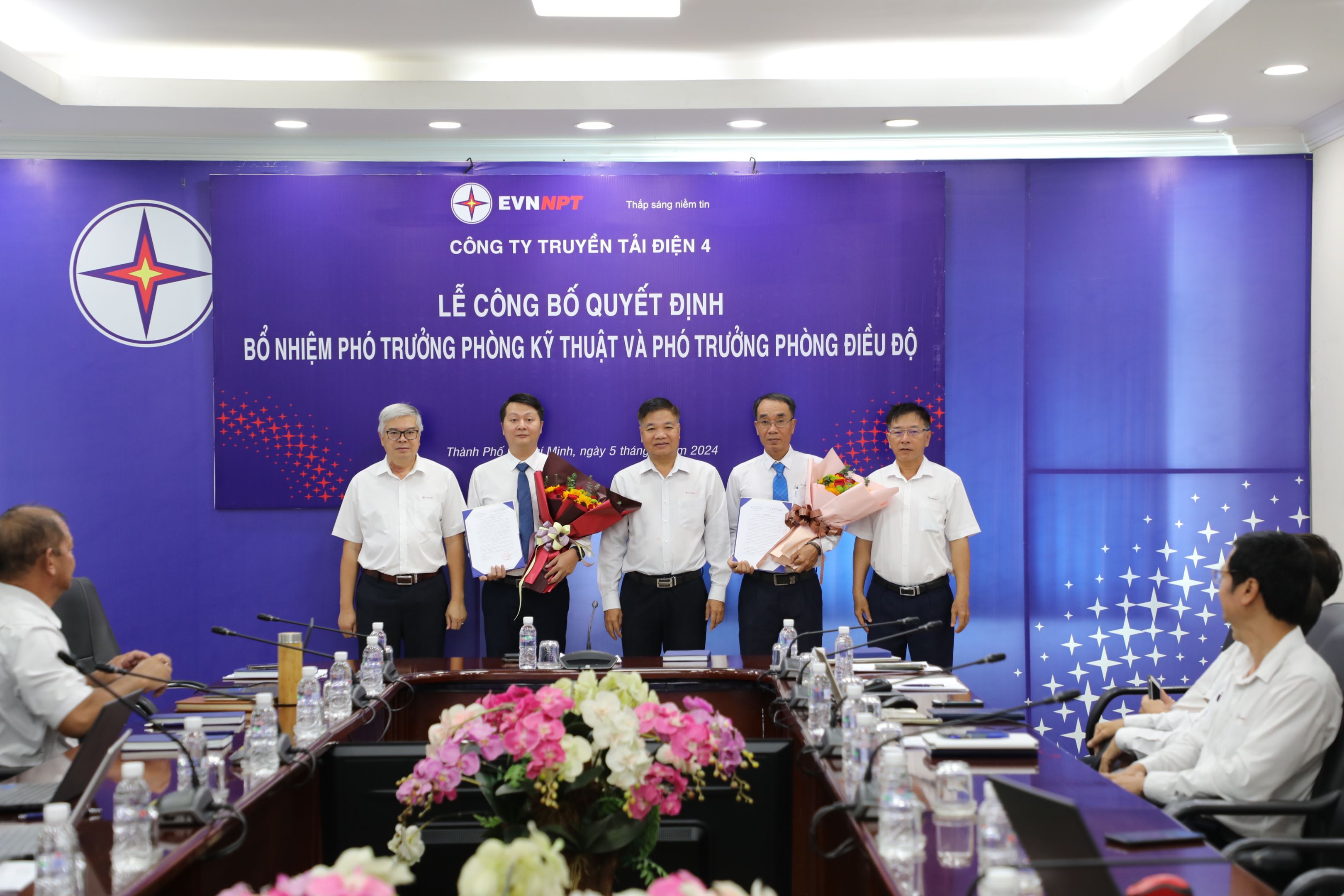 Tại buổi lễ, ông Đống Tiến Long – Trưởng Phòng Tổ chức và Nhân sự đã công bố Quyết định số 2309/QĐ-PTC4 ngày 02/8/2024 của Công ty về việc bổ nhiệm ông Võ Sỹ Danh, cán bộ Phòng Kỹ thuật Công ty giữ chức vụ Phó Trưởng Phòng Kỹ thuật Công ty kể từ ngày 05/8/2024; và Quyết định số 2048/QĐ-PTC4 ngày 02/8/2024 về việc điều động Ông Nguyễn Văn Tấn - Trưởng Phòng Kỹ thuật thuộc Truyền tải điện miền Đông 1 đến giữ chức vụ Phó Trưởng Phòng Điều độ Công ty.