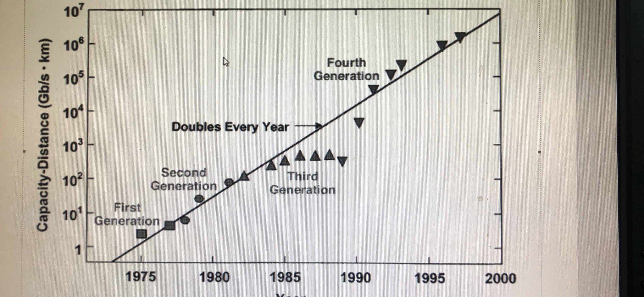 Tích số của tốc độ truyền và khoảng cách truyền, được định nghĩa bởi BL, được sử dụng để mô tả dung lượng truyền thông cho mỗi thế hệ, với B là tốc độ truyền và L là khoảng lặp. Hình 1.1 mô tả sự gia tăng BL theo sự phát triển của các hệ thống quang.