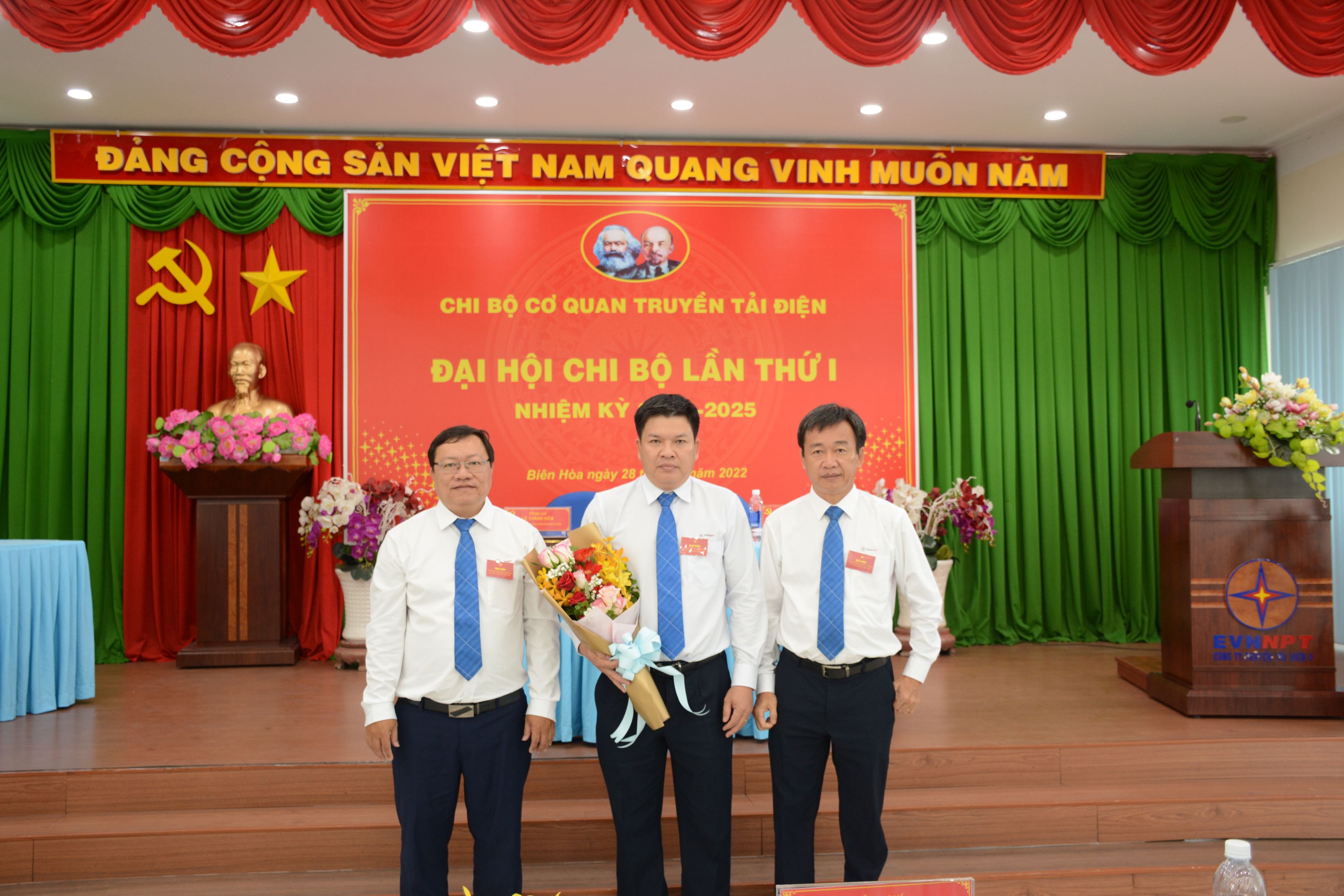 Đ/c Nguyễn Minh Dũng - UVBCH Đảng bộ Công ty, Bí thư Đảng ủy bộ phận TTĐMĐ1 tặng hoa chúc mừng đ/c Bí thư và Phó Bí thư Chi bộ Cơ quan Truyền tải điện nhiệm kỳ 2022-2025