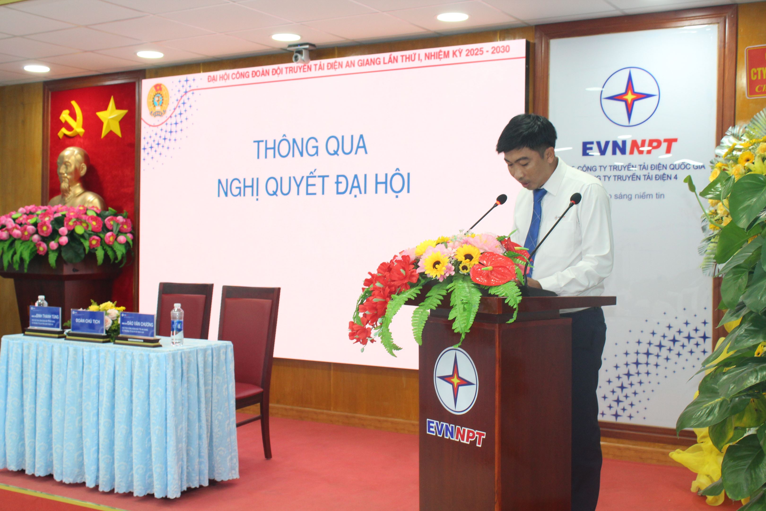 Phó chủ tịch Công đoàn Đinh Thanh Tùng (người đứng bục) thay mặt Đoàn chủ tịch trình bày báo cáo BCH Công đoàn Đội Truyền tải điện An Giang