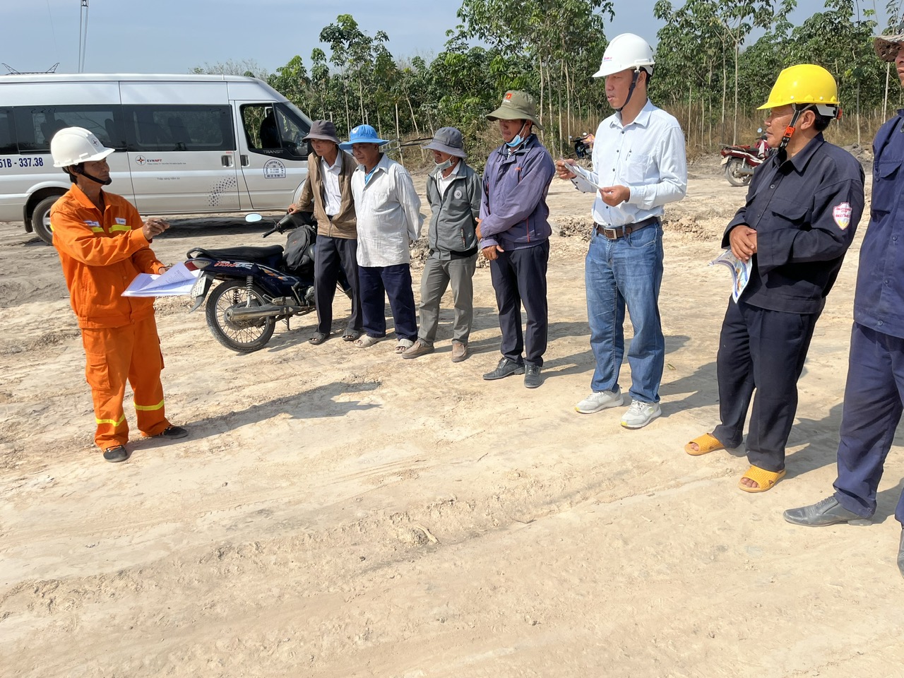 Ông Dương Đức Thành thuộc tổ QLVH ĐD Bù Đăng phổ biến các quy định về hành lang bảo vệ an toàn lưới điện cao áp cho đội ngũ thi công cao tốc.