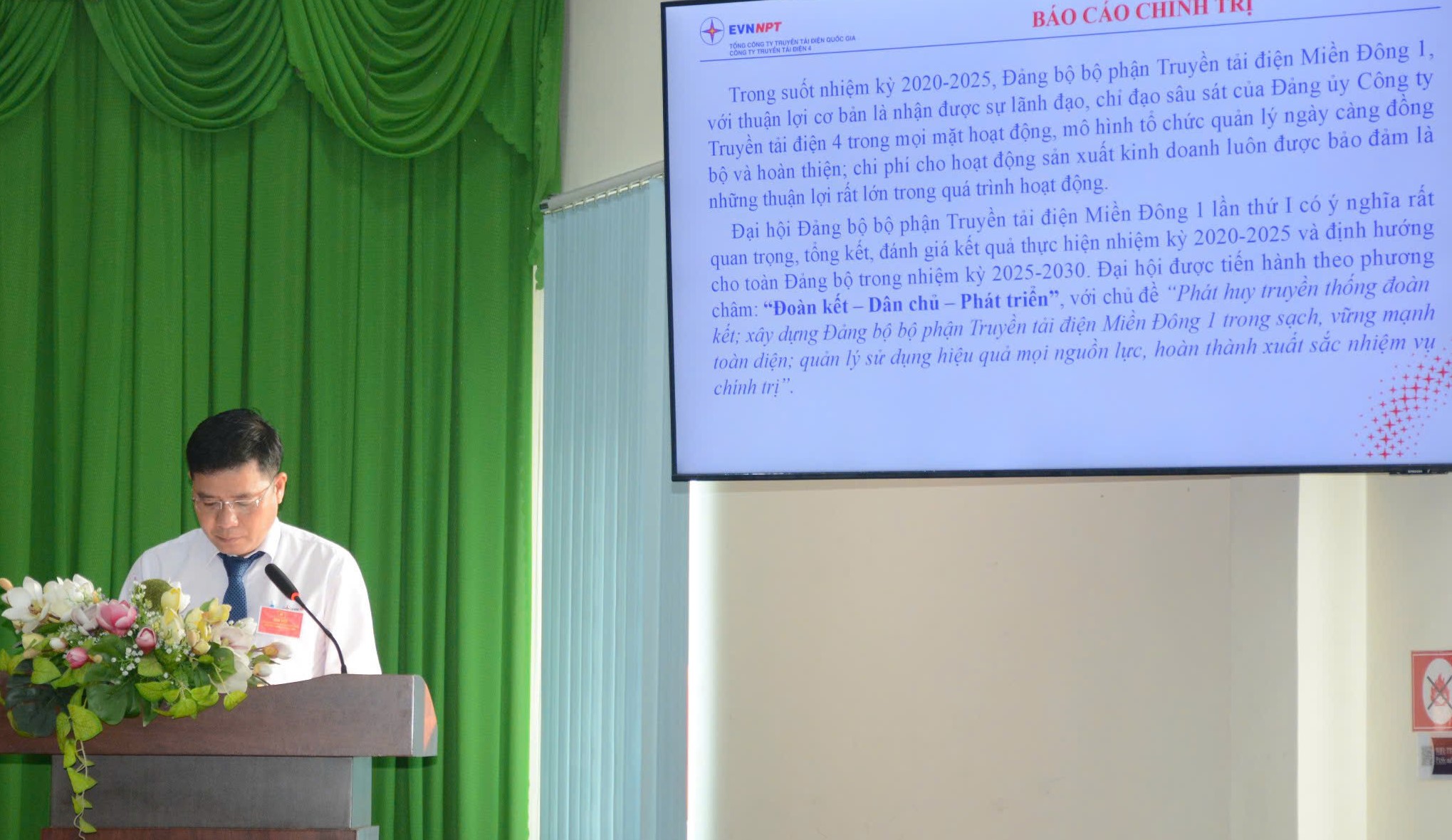 Đảng bộ bộ phận TTĐMĐ1 được thành lập ngày 19 tháng 5 năm 2021 từ việc tổ chức lại Chi bộ, Đảng bộ bộ phận đã lãnh đạo thực hiện tốt chủ trương đổi mới, sắp xếp doanh nghiệp, cải cách hành chính, nâng cao hiệu quả, tối ưu hoá chi phí, tạo sự đồng bộ, thuận lợi trong quá trình thực hiện nhiệm vụ; toàn thể CBCNV trong đơn vị luôn nêu cao truyền thống đoàn kết, thống nhất, vượt qua mọi khó khăn, trở ngại hoàn thành tốt nhiệm vụ được giao. Đại hội được tiến hành theo phương châm “Đoàn kết – Dân chủ – Phát triển” với chủ đề “Phát huy truyền thống đoàn kết; xây dựng Đảng bộ bộ phận Truyền tải điện Miền Đông 1 trong sạch, vững mạnh toàn diện; quản lý sử dụng hiệu quả mọi nguồn lực, hoàn thành xuất sắc nhiệm vụ chính trị”. Qua 5 năm thực hiện Nghị quyết, Đảng ủy bộ phận đơn vị đã bám sát các chủ trương, nghị quyết, chiến lược, chỉ thị của cấp trên và kế hoạch được giao, đề ra các giải pháp cụ thể, tập trung lãnh đạo, chỉ đạo quyết liệt và sâu sát; với truyền thống đoàn kết, tinh thần chủ động, sáng tạo, vượt qua khó khăn thử thách, nỗ lực phấn đấu của tập thể cán bộ đảng viên, công nhân viên, Truyền tải điện Miền Đông 1 đã hoàn thành tốt các chỉ tiêu, nhiệm vụ mà Nghị quyết Đảng bộ bộ phận đơn vị đã đề ra. Hiện nay, Đảng bộ bộ phận có 61 đảng viên chiếm tỷ lệ 20,96% so với tổng số 291 CBCNV, tăng 1,6 lần so với đầu nhiệm kỳ; trong nhiệm kỳ Đảng bộ bộ phận kết nạp được 25 đảng viên, trong đó có 16 đảng viên mới là đoàn viên thanh niên đạt tỷ lệ 64% (vượt chỉ tiêu đề ra là 50% trở lên); số đảng viên hoàn thành tốt nhiệm vụ trở lên đạt 97,93%, vượt 7,93% so với chỉ tiêu nghị quyết là 90%, trong đó đảng viên hoàn thành xuất sắc nhiệm vụ đạt 20%; có 86,67% tổ chức đảng trực thuộc hoàn thành tốt nhiệm vụ trở lên, thấp hơn 13,33% so với nghị quyết đề ra là 100%, trong đó có 02 chi bộ hoàn thành xuất sắc nhiệm vụ vượt chỉ tiêu so với nghị quyết là 01 chi bộ; hai đoàn thể Công đoàn, Chi đoàn luôn đạt vững mạnh xuất sắc mỗi năm. Đảng bộ bộ phận hàng năm hoàn thành tốt nhiệm vụ trở lên (năm 2020, 2021, 2022, 2024); năm 2023 hoàn thành xuất sắc nhiệm vụ. Trong nhiệm kỳ, Đảng bộ bộ phận có 01 đồng chí được Đảng bộ khối Doanh nghiệp Trung ương tặng Bằng khen đạt tiêu chuẩn “Hoàn thành xuất sắc nhiệm vụ” 5 năm liền (từ năm 2018-2022). Những kết quả đã đạt được trong nhiệm kỳ vừa qua của Đảng bộ bộ phận TTĐMĐ1 chính là từ sự quan tâm chỉ đạo của Đảng ủy Công ty Truyền tải điện 4, sự phối hợp của các Chi bộ trong Đảng bộ bộ phận và đặc biệt là sự gương mẫu đi đầu trong mọi mặt công tác của các đảng viên, nhất là người đứng đầu, sự đồng tâm, hợp lực phấn đấu vươn lên của toàn thể CBCNV trong đơn vị. Đại hội đã bầu Ban chấp hành gồm 05 đồng chí; đồng chí Nguyễn Minh Dũng tiếp tục được tín nhiệm bầu làm Bí thư đảng ủy bộ phận nhiệm kỳ 2025 – 2030.