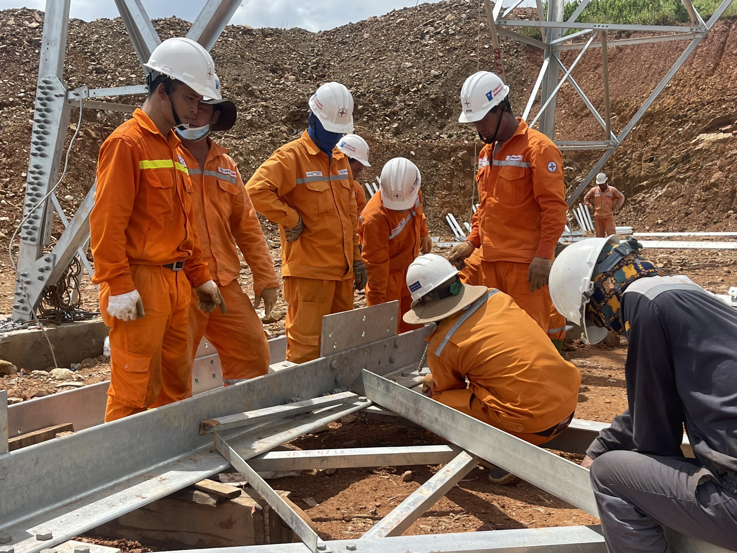 Kỹ sư Đinh Hữu Chuyên (áo cam ngoài cùng bên trái) chỉ huy trực tiếp công trường giám sát nhóm thi công lắp ráp thanh cột trên công trường 500kV mạch 3.