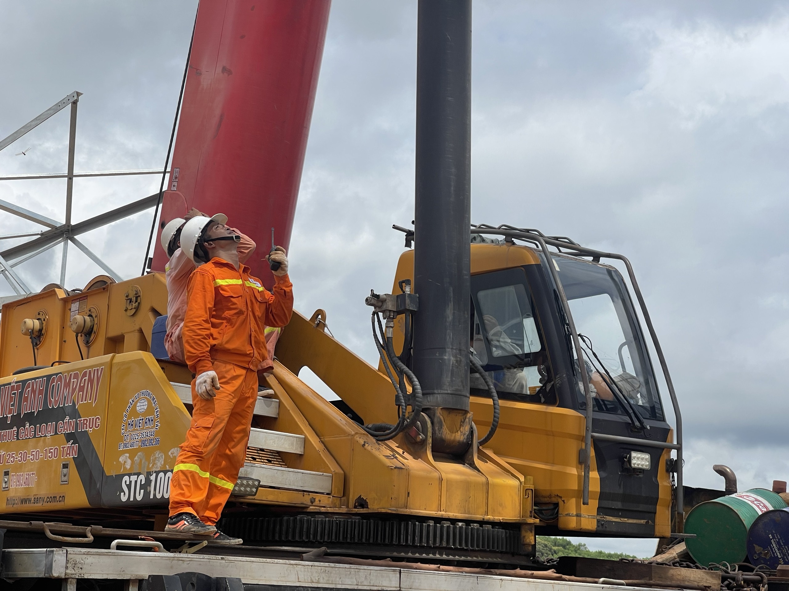 Kỹ sư Đinh Hữu Chuyên đang chỉ huy giám sát nhóm thi công làm việc trên cao tại công trường 500kV mạch 3.