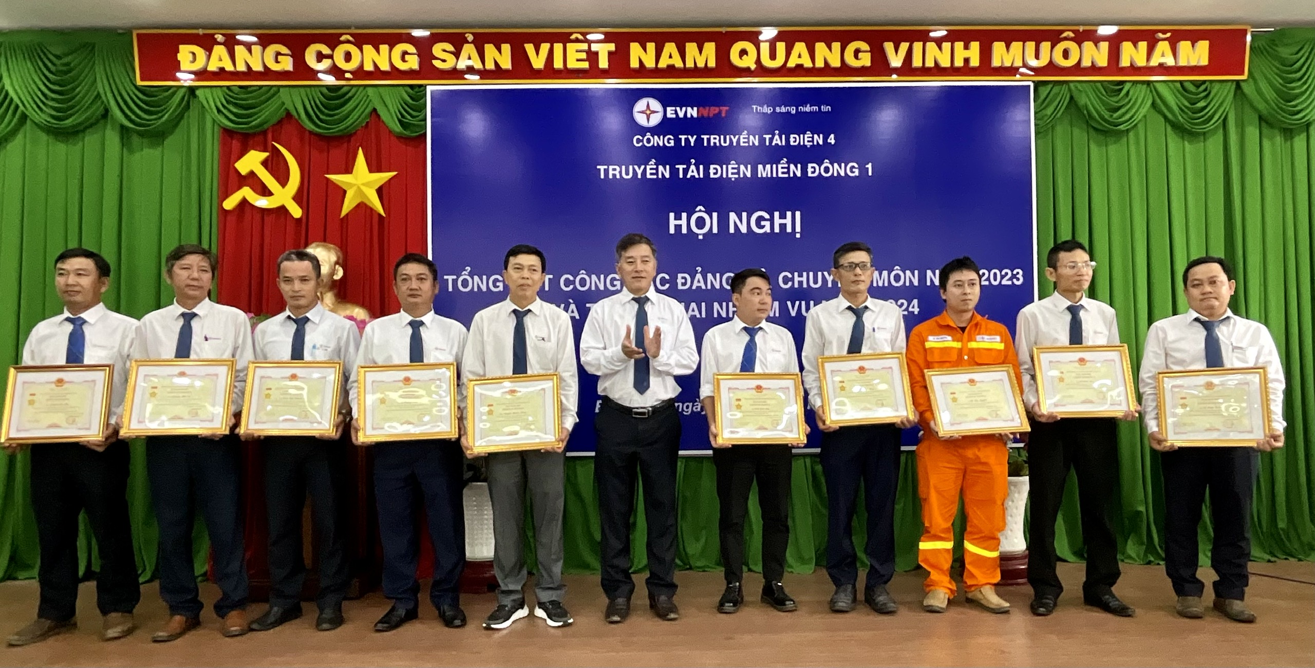Đảng viên Đinh Hữu Chuyên (áo trắng thứ 3 bên trái) nhận Giấy khen là Đảng viên hoàn thành xuất sắc nhiệm vụ năm 2023 của Đảng bộ Công ty Truyền tải điện 4.