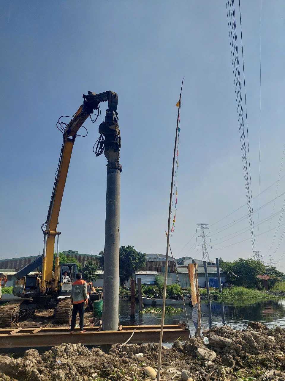 Ảnh: Đơn vị thi công, thi công ép cọc dự án Kênh Tham Lương – Bến Cát – rạch Nước Lên giao chéo với đường dây 220kV Phú Lâm – Bình Tân tại khoảng cột 3-4