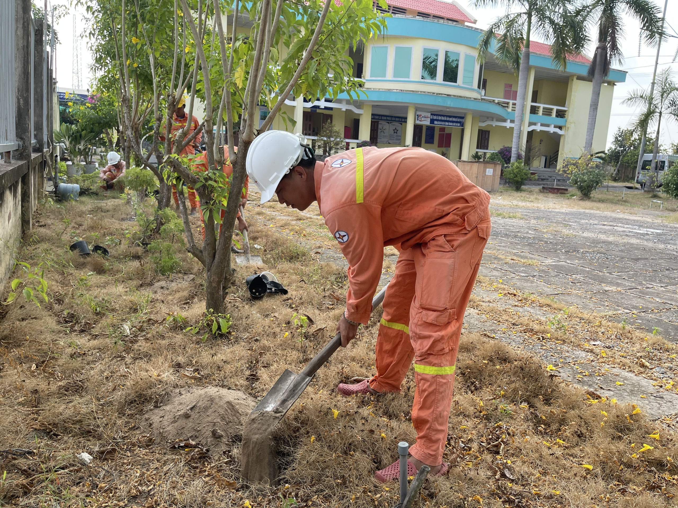 CBCNV Đội Truyền tải điện Châu Đốc trồng cây xanh trong khuôn phiên trụ sở Đội.
