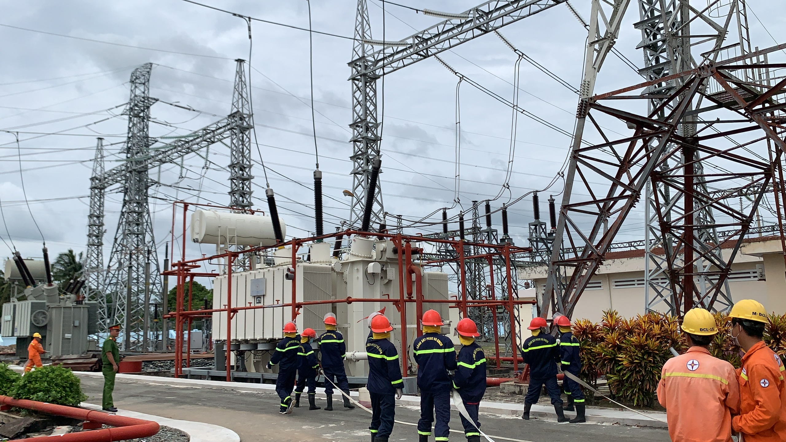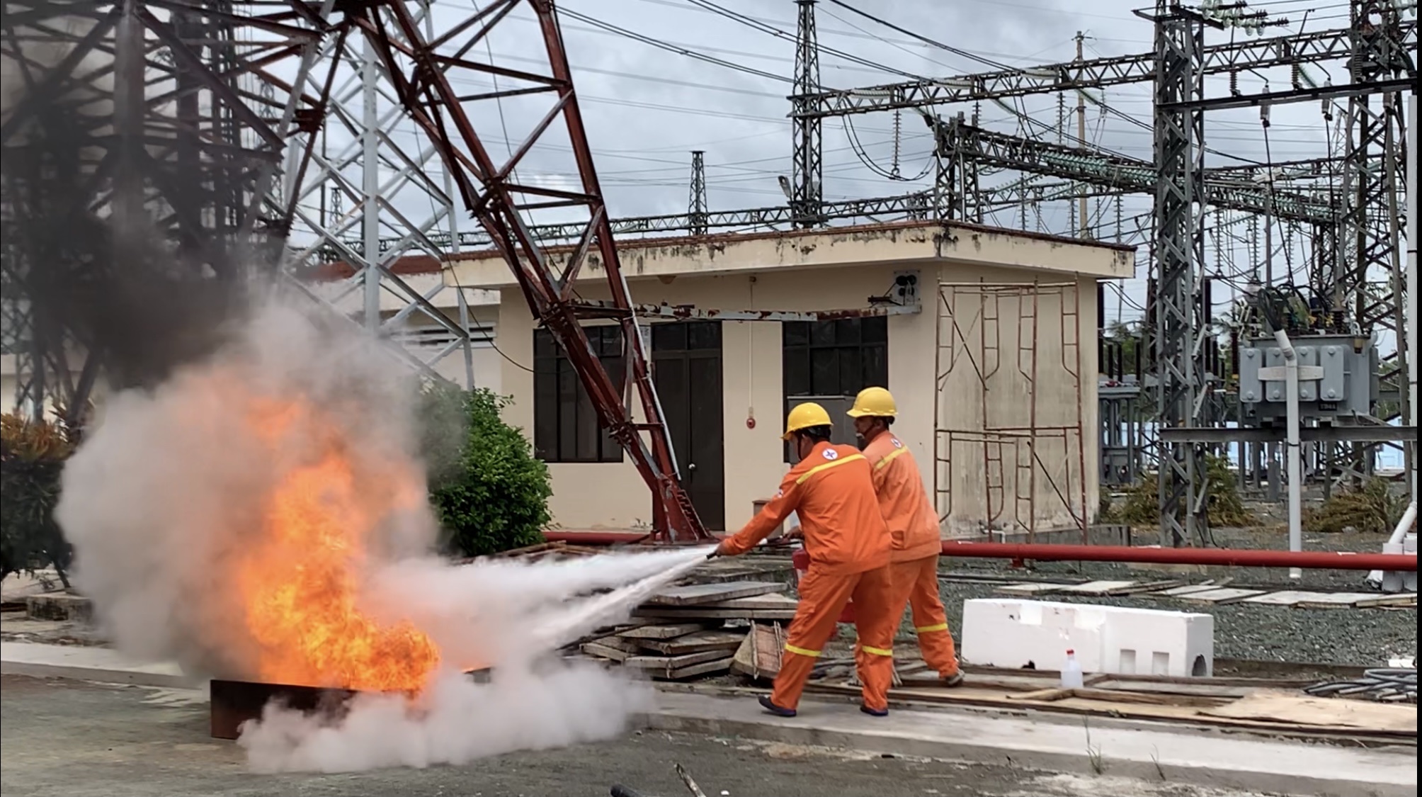 Lực lượng đội PCCC cơ sở Trạm 220kV Cai Lậy và Đội Truyền tải điện Cai Lậy thực hành dập tắt đám cháy.