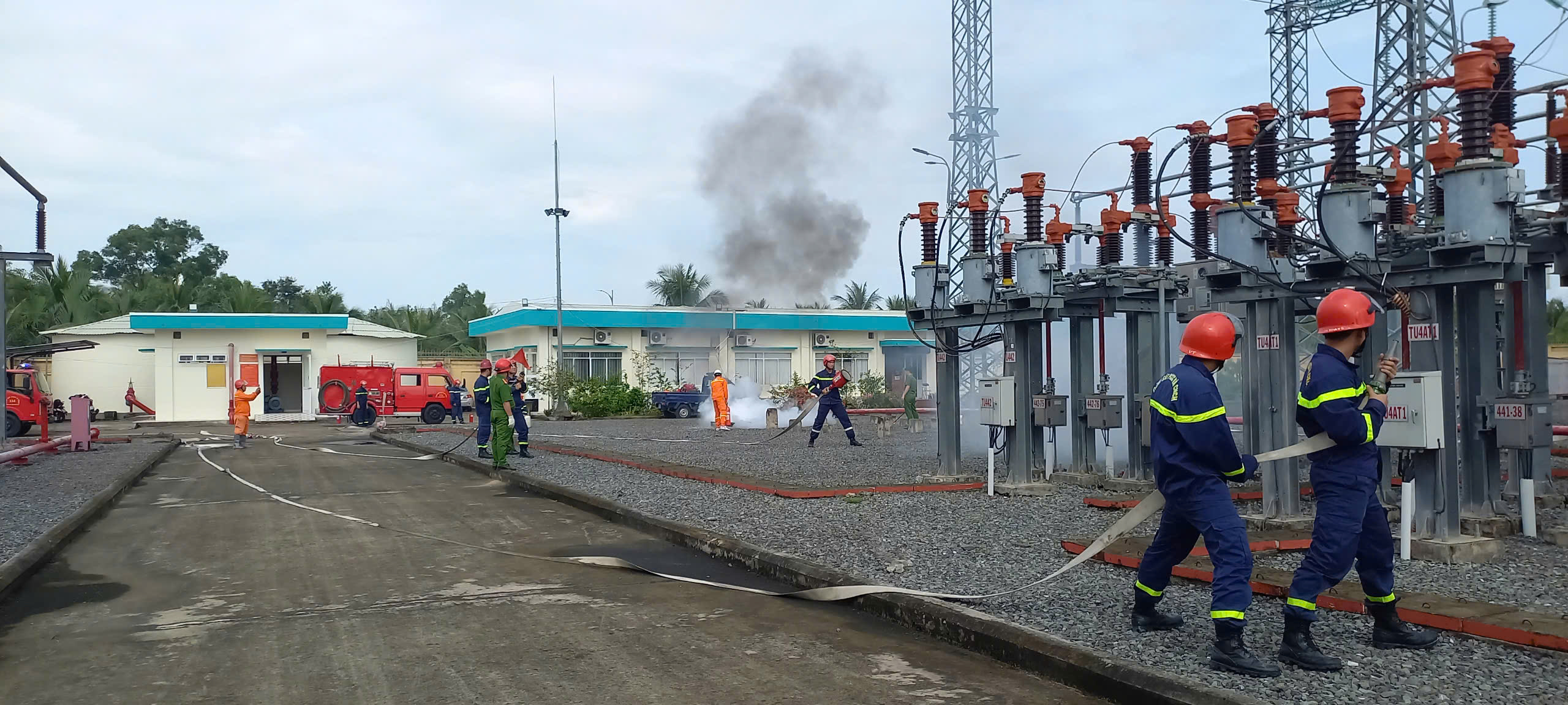 Diễn tập phương án PCCC&CNCH tại Trạm biến áp 220kV Mỏ Cày.