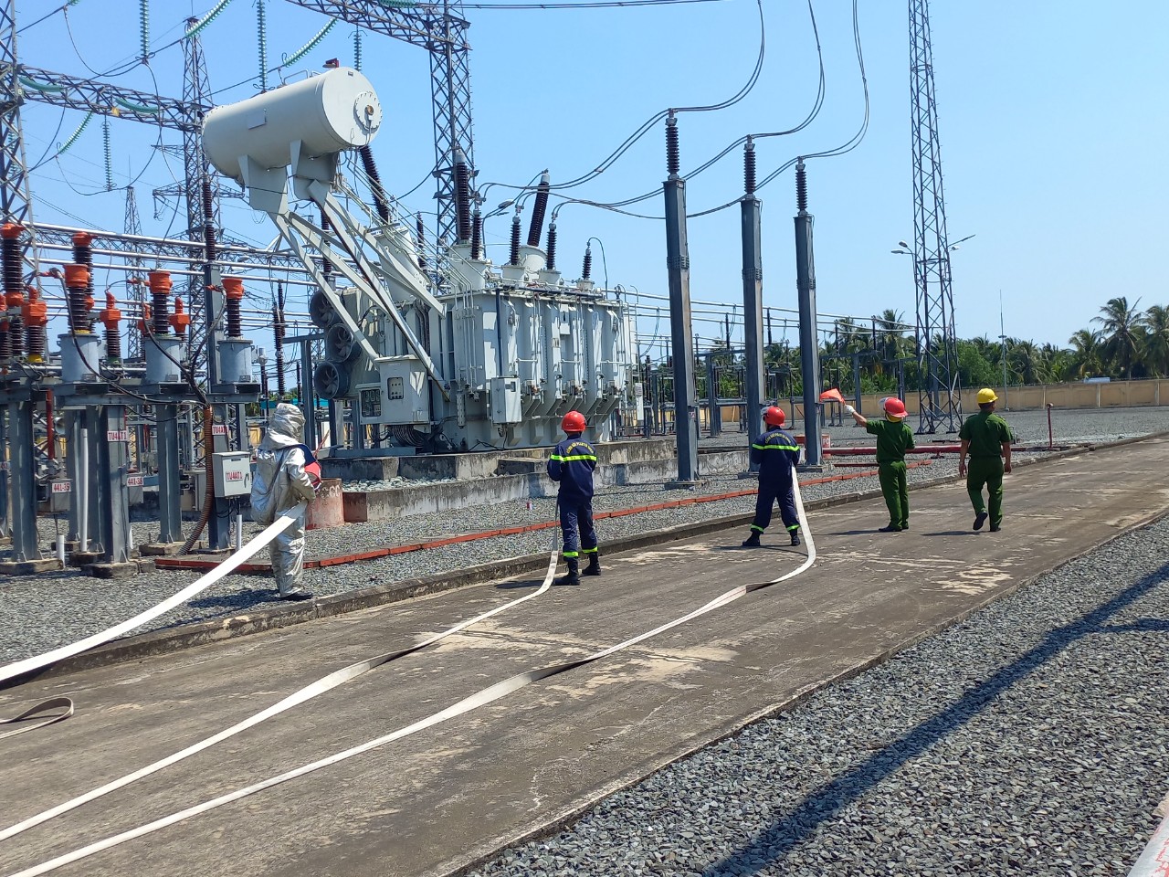Lực lượng PCCC&CNCH chuyên nghiệp - Công An tỉnh Trà Vinh phối hợp diễn tập tại trạm biến áp 220kV Trà Vinh
