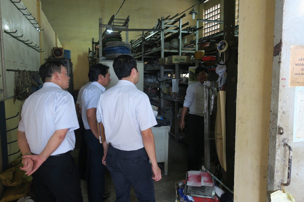 Ông Nguyễn Thiện Hùng – đội phó phụ trách đội TTĐ Phú Lâm (bìa phải) giới thiệu với Đoàn về các dụng cụ làm việc của đội TTĐ Phú Lâm.