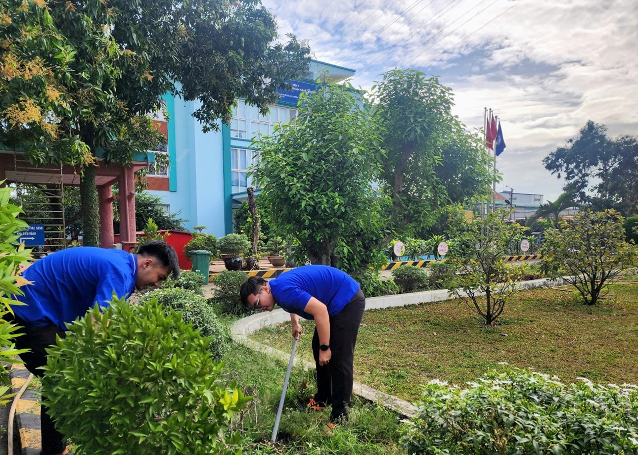 Ảnh: Đoàn viên phát quang, dọn dẹp cỏ dại, thu gom rác thải tại khu vực bồn cây trong khuôn viên đơn vị.