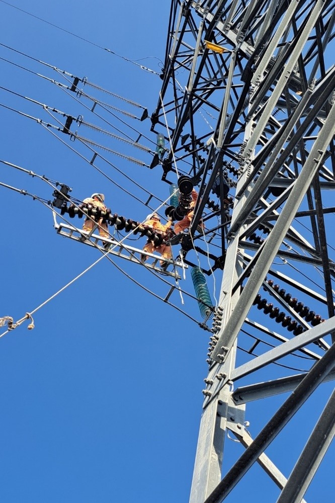Đoàn viên thanh niên Đội Truyền tải điện Cà Mau thi công thay sứ.
